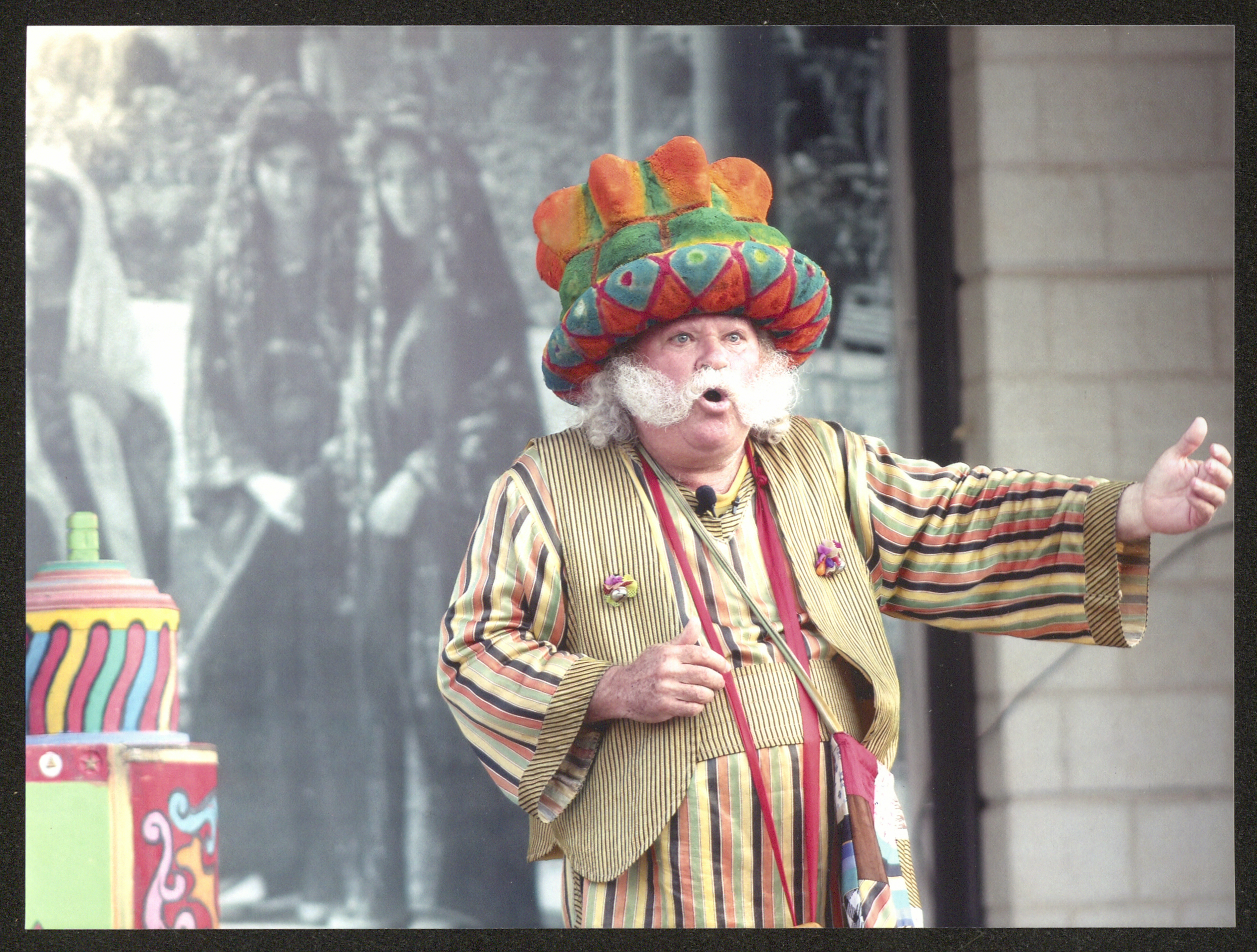 Taken on the municipal stage in Ramallah on 25 August 2017, this photograph shows Adel Tartir (aka Abu al-Ajab) during a performance of the "Hikayat abu al-Ajab Series" Show for the "Sundouq al-Ajab (the Wonder Box)" theatre, as part of his participation in the "Al-Harajeh Market", a popular market organized by the Ramallah Municipality.
