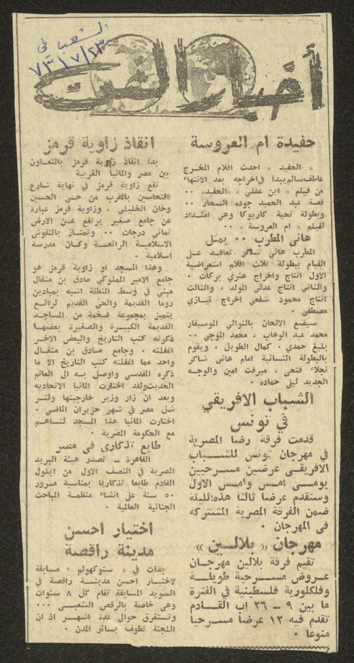 Issued on 23 September 1973 and found in the Adel Tartir Collection, this document shows a newspaper clipping from an issue of al-Sha'b Newspaper titled "Balaleen Festival" as part of "Art News" segment, referring to the festival organized by Balaleen Group in the period between 9-26 August 1973 hosting 12 theatrical and folklore shows.