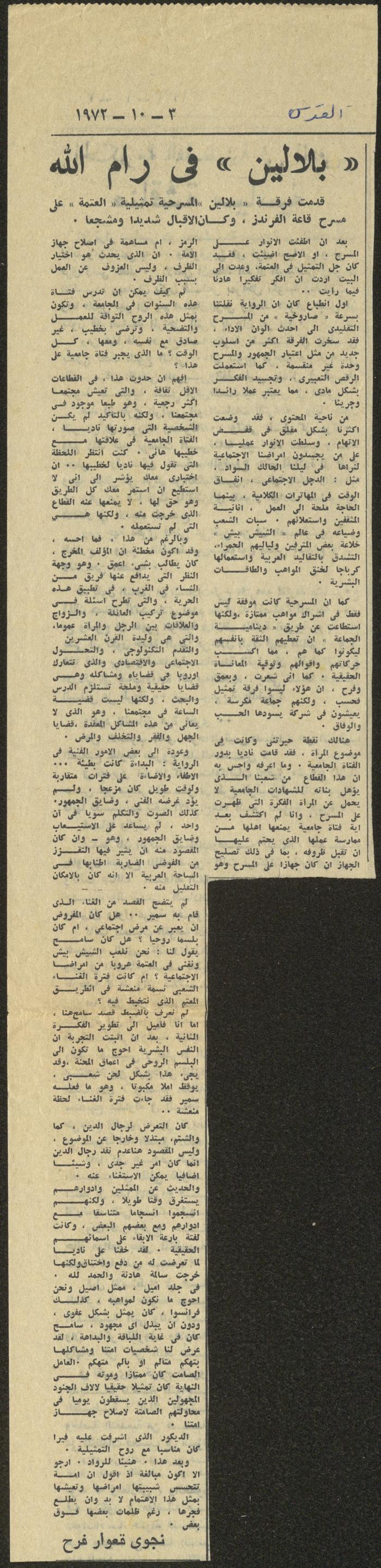 Issued on 3 November 1972, this document shows a newspaper clipping from an issue of al-Quds Newspaper titled "Balaleen in Ramallah", where Najwa Kawar Farah wrote about "al-Atmeh" play produced and performed at the Friends School by Balaleen Group, describing the huge attendance as being intense, and they she referred to some technical details related to the play such as the general idea of it and the cast, as well as the lighting.