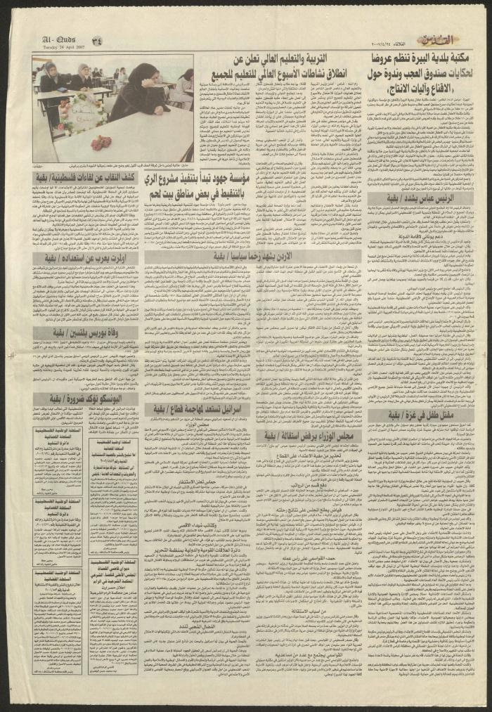 Issued on 24 April 2007 and found in the Adel Tartir Collection, this document shows a newspaper clipping from an issue of al-Quds Newspaper titled "Al-Bireh Public Library Organizes Shows by the Wonder Box Troupe" where the reporter of the newspaper refers to a series of shows from "the Wonder Box Theatre Stories" by the artist Adel Tartir, known as "Abu al-Ajab" character, with the participation of more than 150 basic school students at Khalil Rahman School located in al-Bireh, where he narrated a number of folkloric and heritage stories.