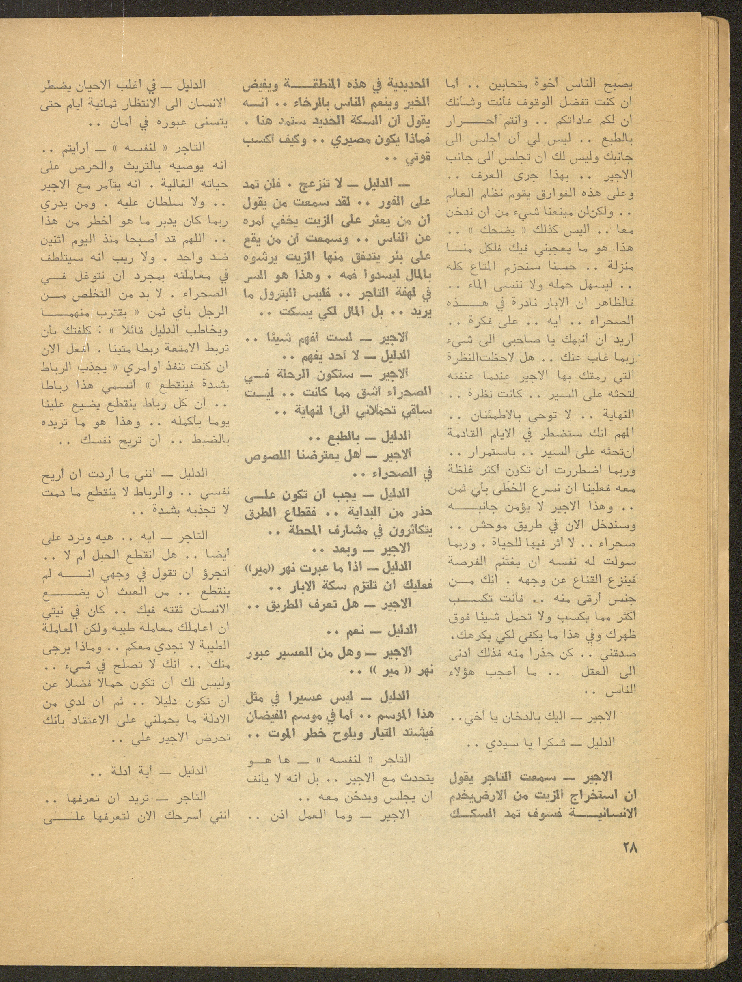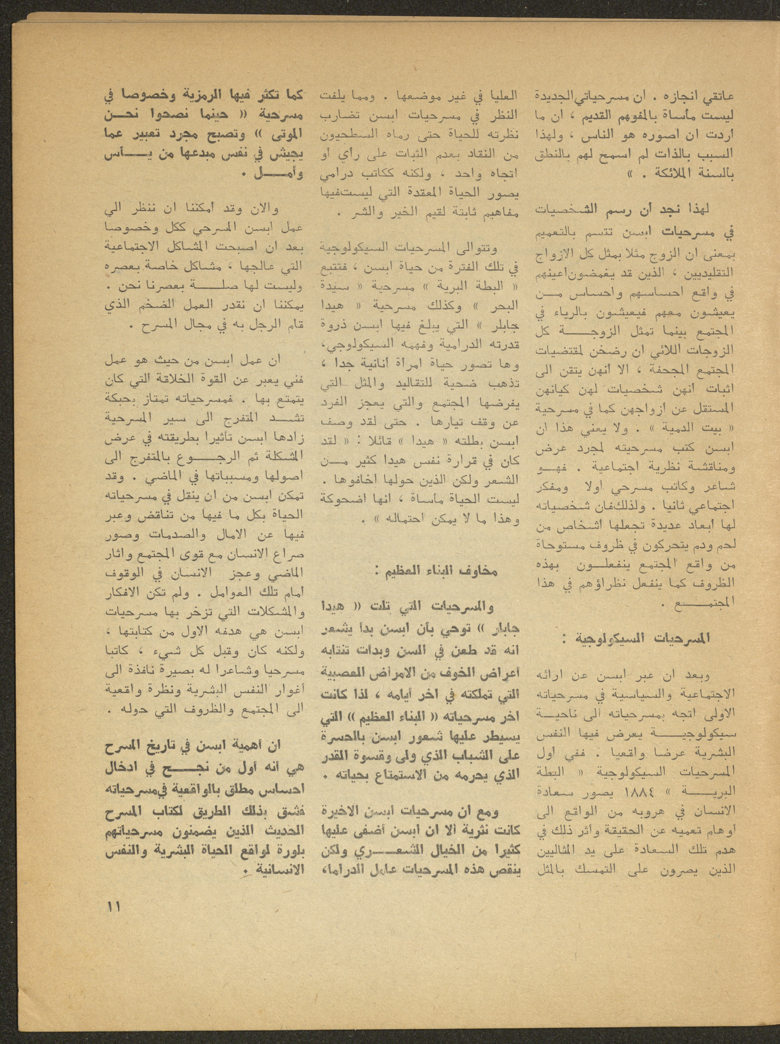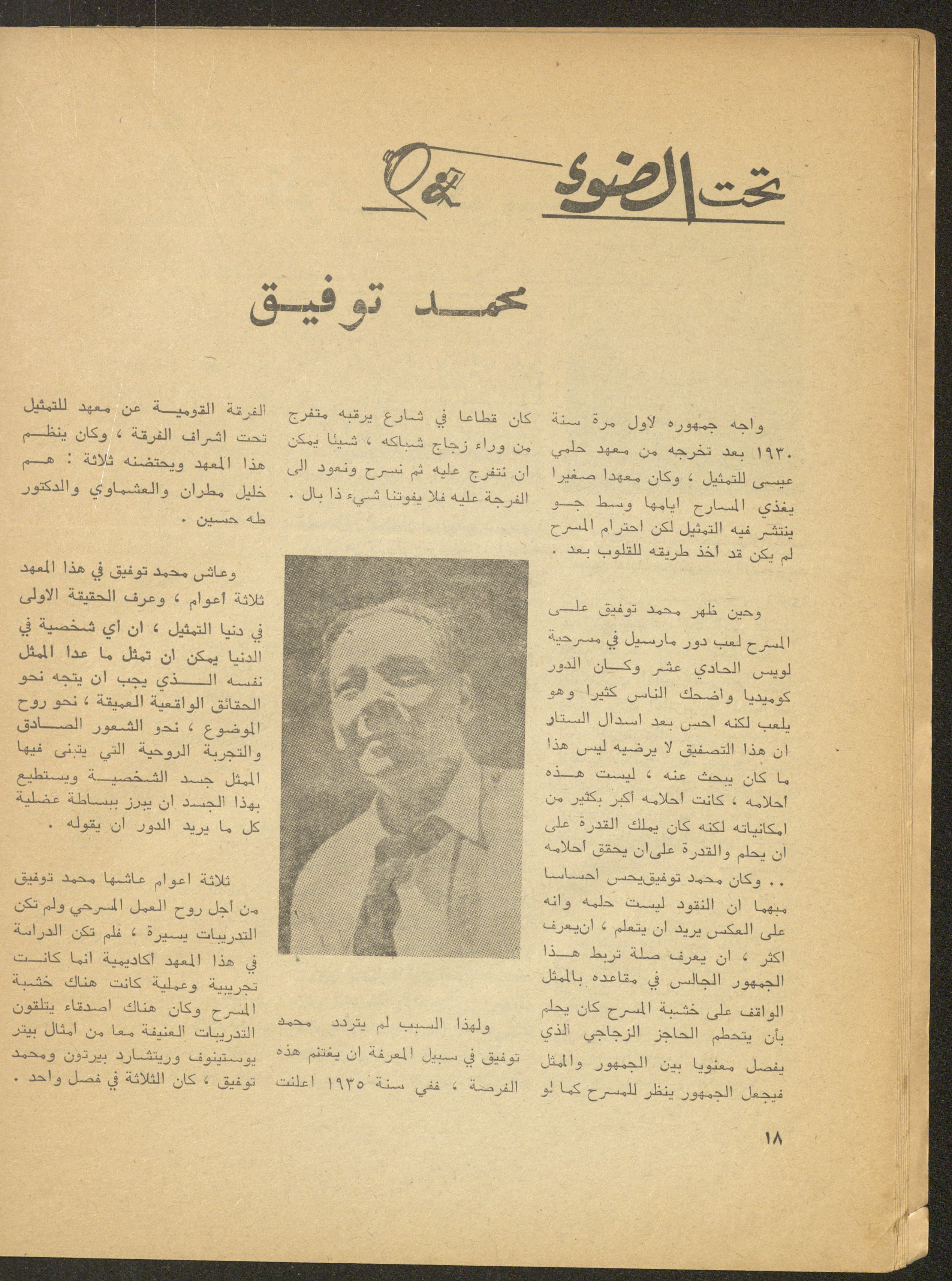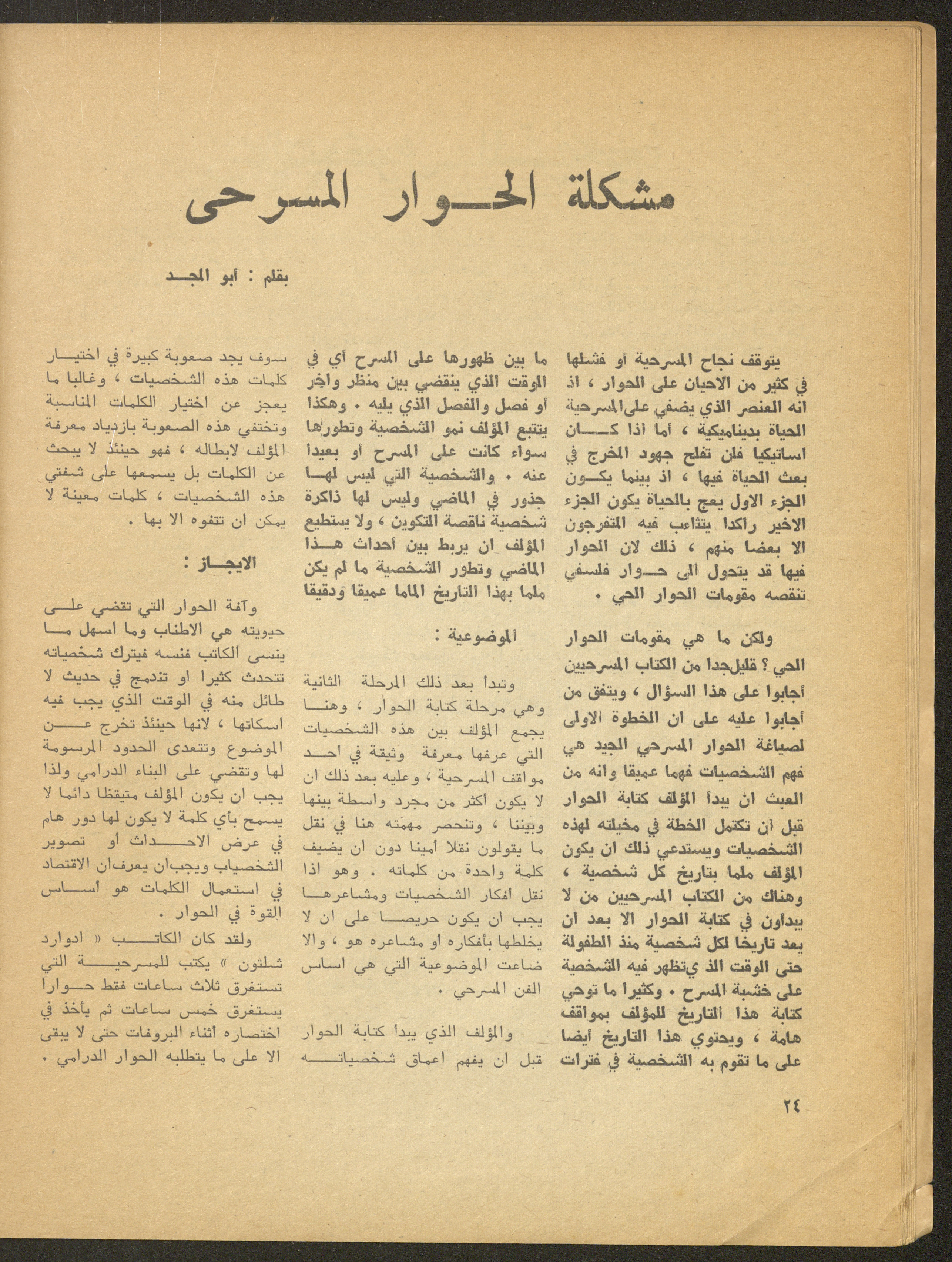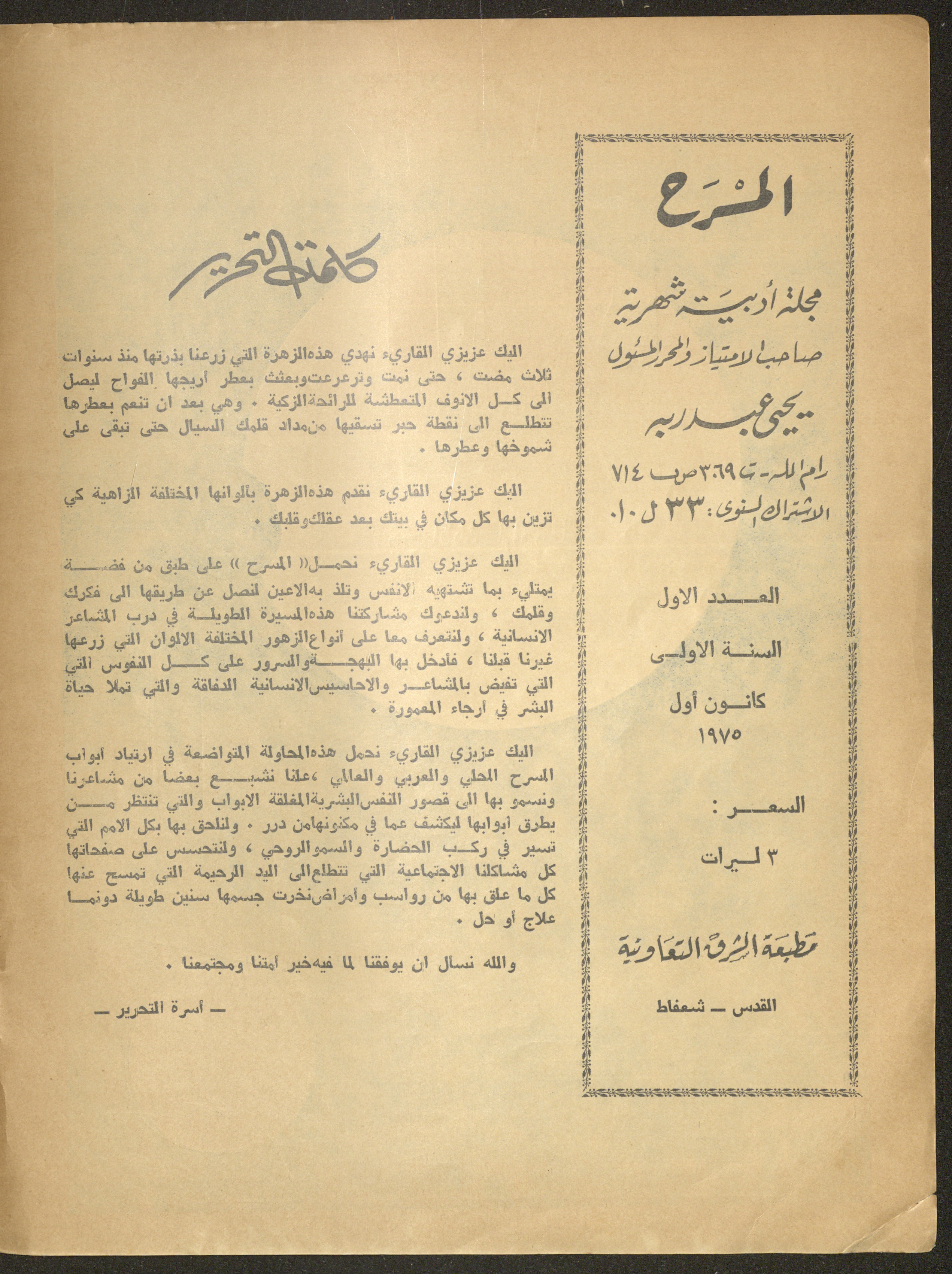 The first issue of the first year of al-Masrah Magazine, which is a monthly literary magazine, its franchisor and editor in chief, Yahya Abed Rabbo. This issue was printed in ash-Shorouk Cooperative Press in Shuafat-Jerusalem, and its price was 3 Israeli liras. It included the full text of the play “The Exception and the Rule”, by German writer Bertolt Brecht, in addition to several contributions by different writers, and some commercials and advertisements. The third page contains the most prominent topics that came in this issue, arranged in order as follows: - Where are our theatrical troupes heading to, by the editor. - An interview with Tawfiq al-Hakim. - The elements of theatrical writing. - From the notables of world theatre. - Audience psychology. - Under the light. - The director's role in theatrical work. - Theatrical definitions. - Comedy arts. - Theatrical decoration. - Moving the stage. - Amateur theatre directing. - Theater library. - Shawqi Theatre. - Theatrical dialogue problem. - Milestones in the history of the Palestinian theatre.