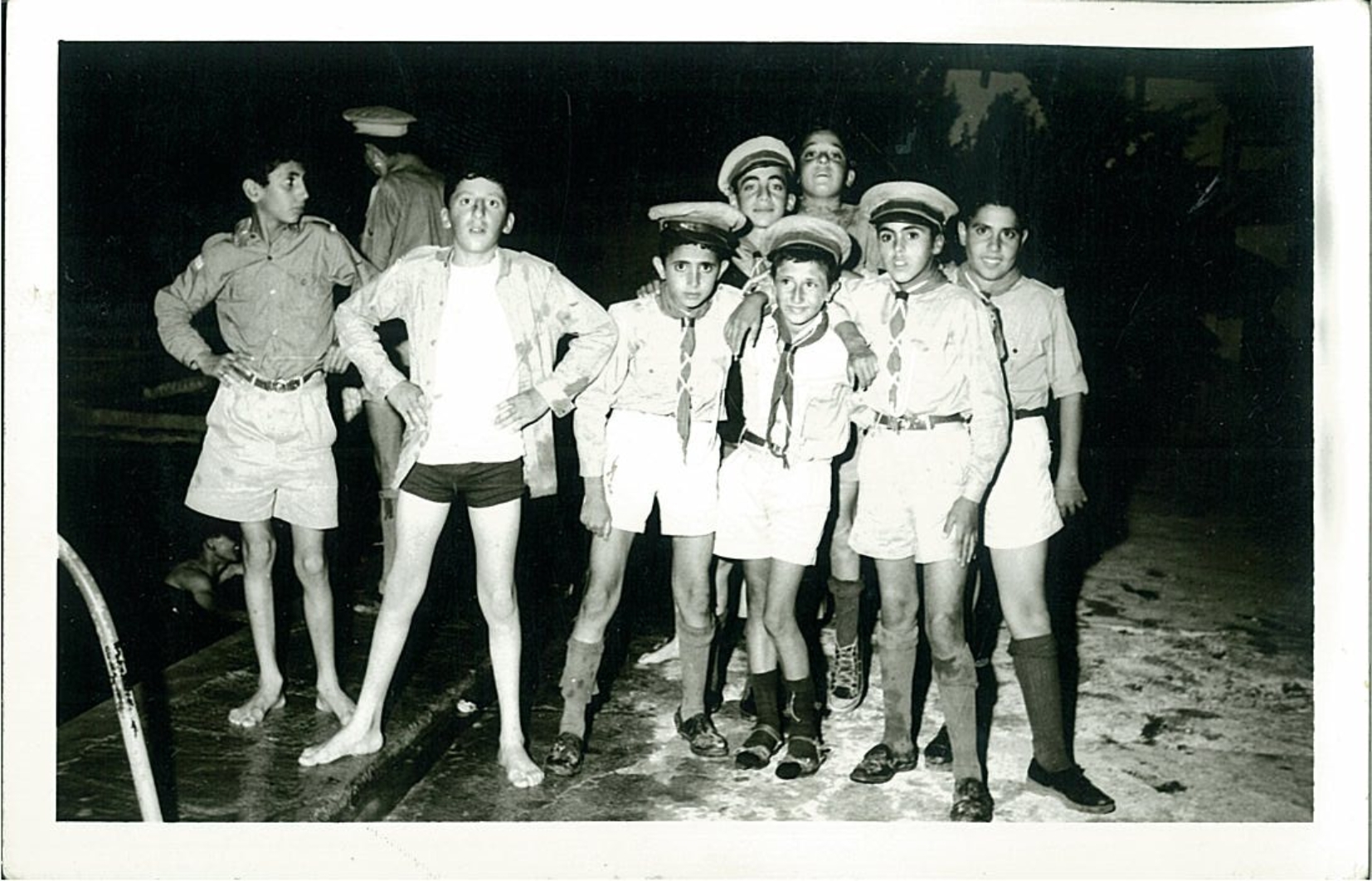 A black-and-white photograph of members of the First Ramallah Scout Group (Sareyyet Ramallah).