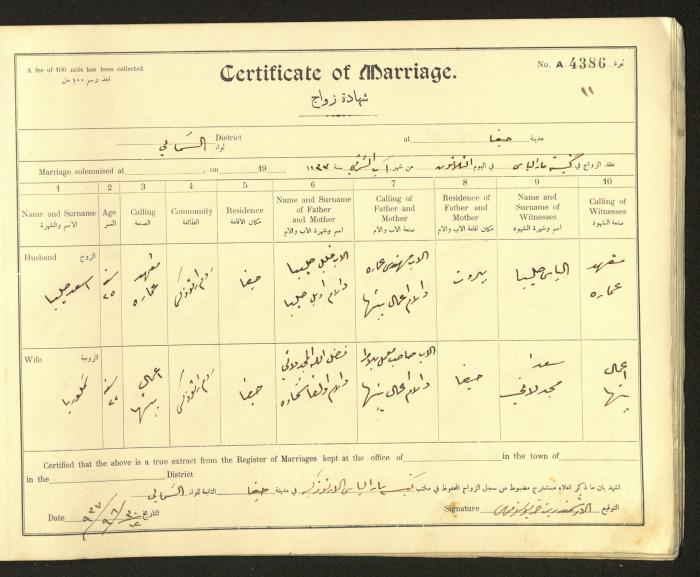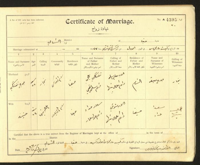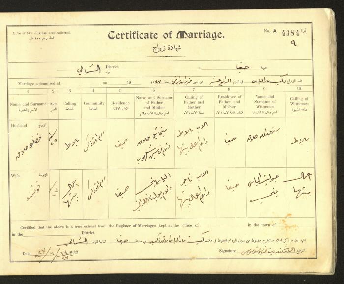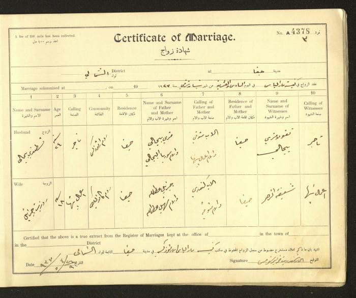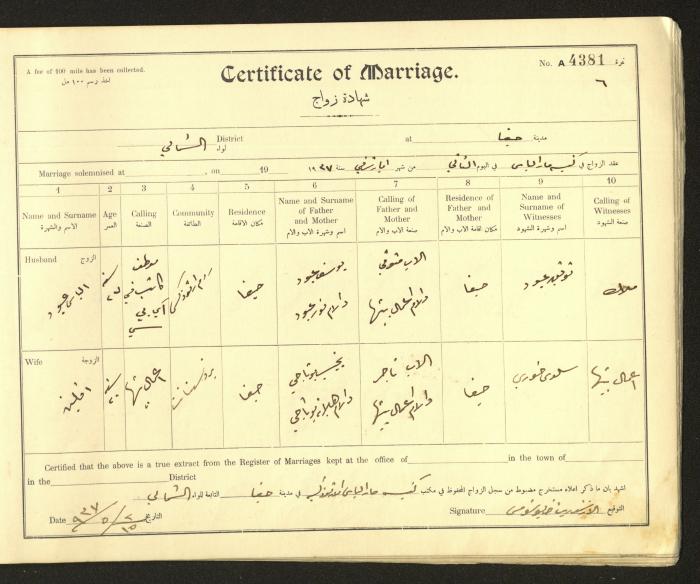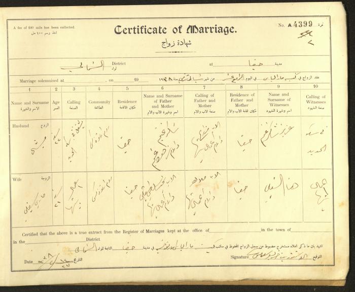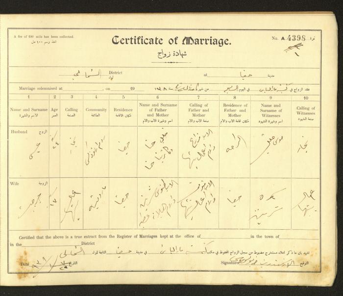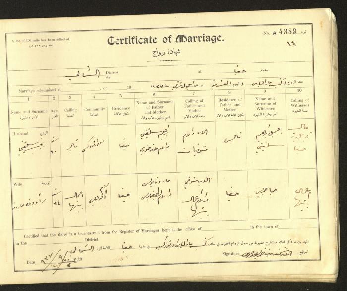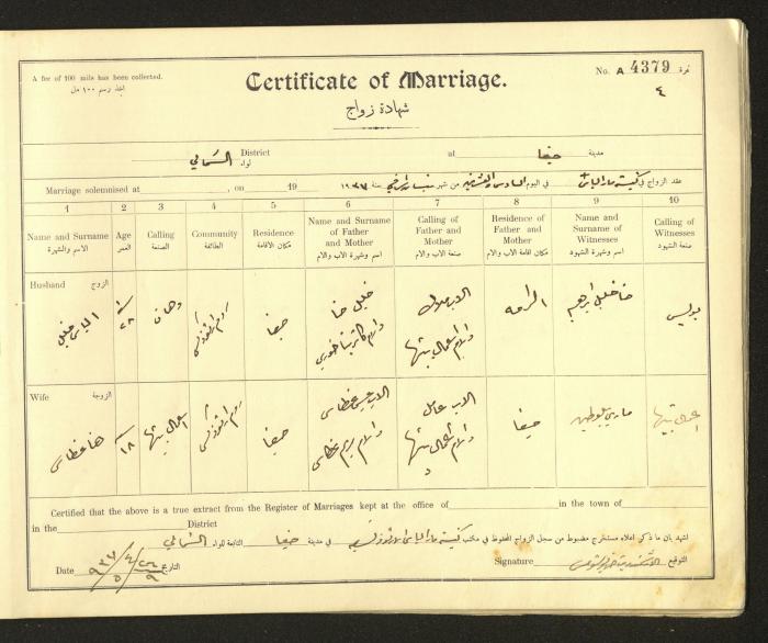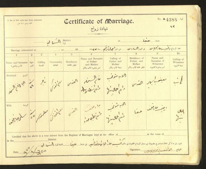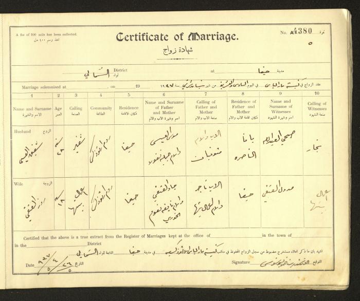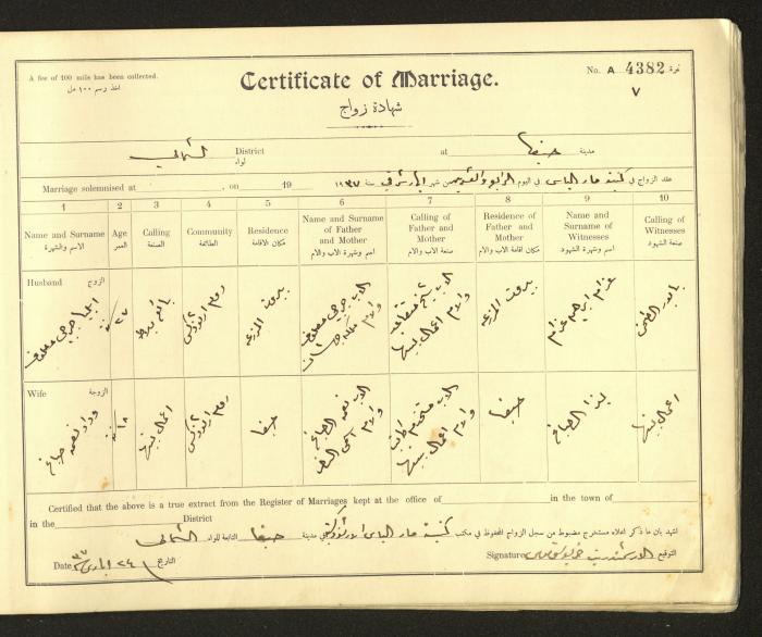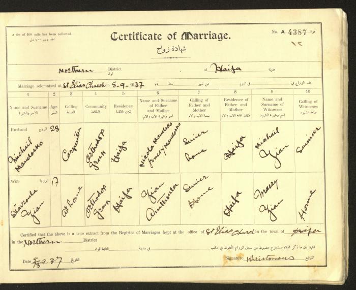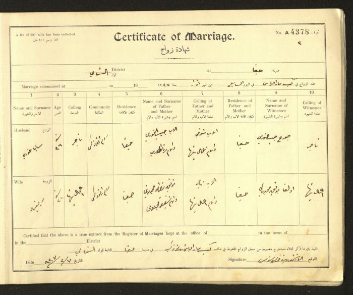 Issued in Arabic and English from 1937 to 1938, this document shows a register containing marriage certificates held at the Mar Elias Orthodox Church in Haifa. The certificate documents the names and surnames of the husband and wife, their age, sect, and place of residence, in addition to information about their parents and witnesses.