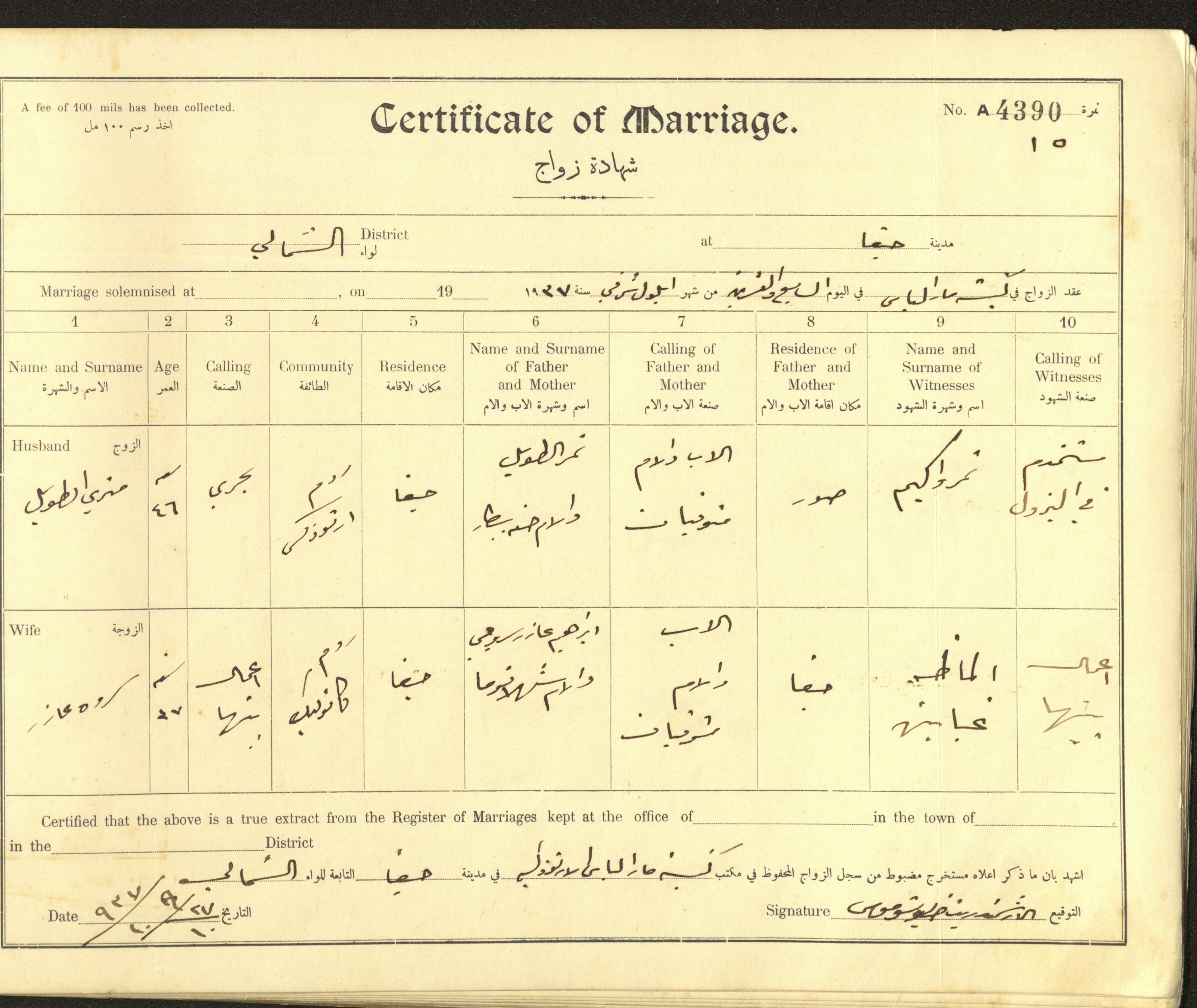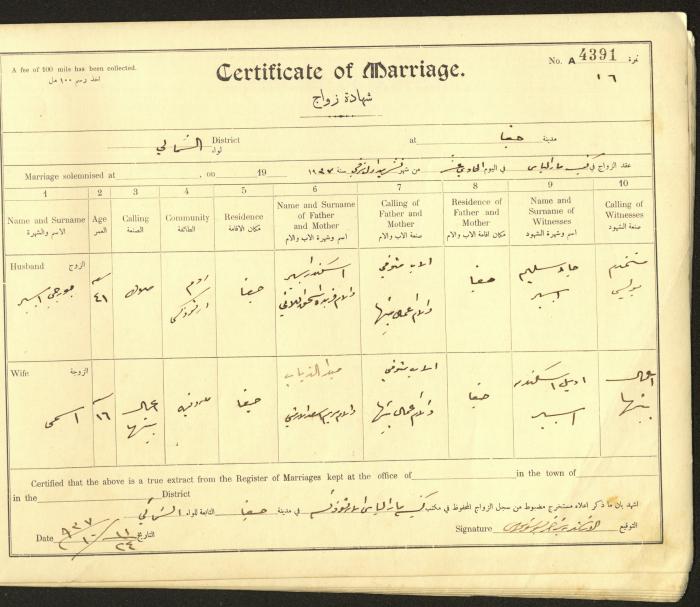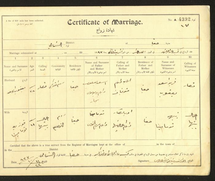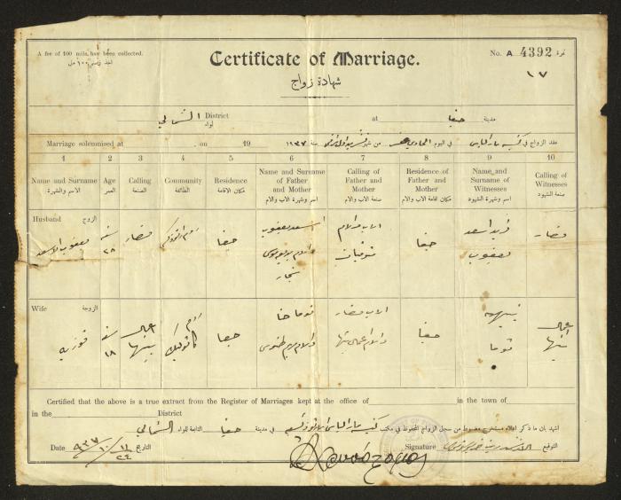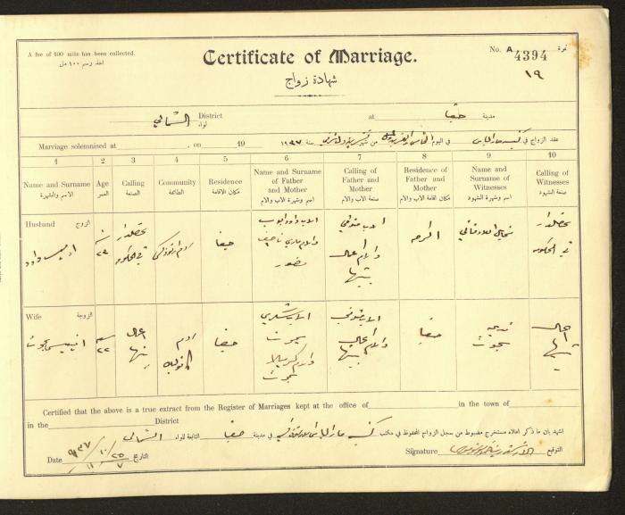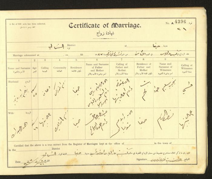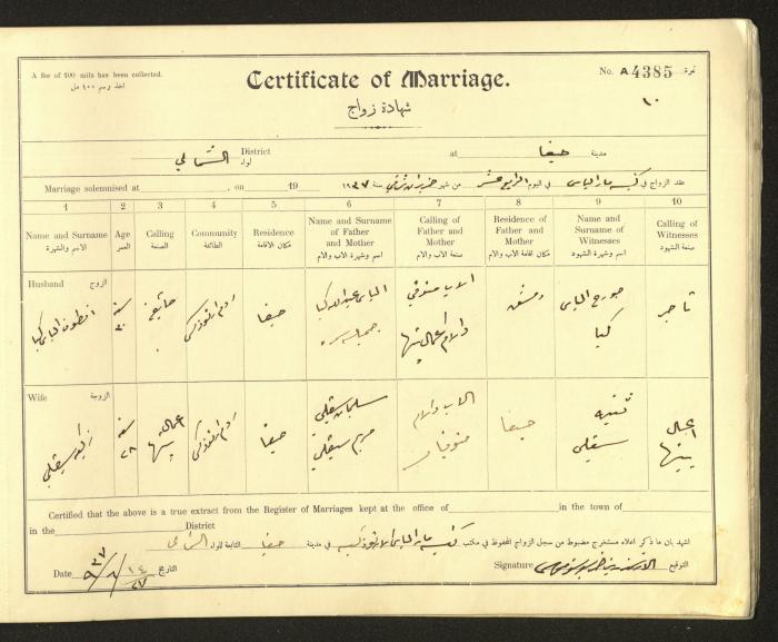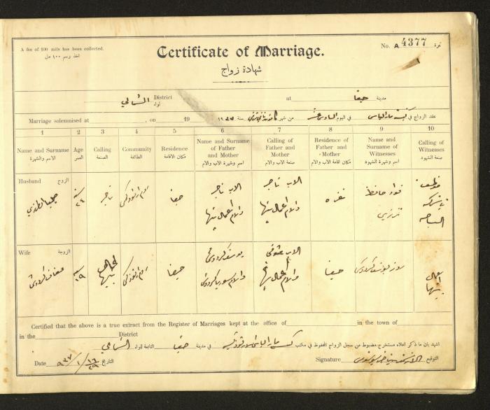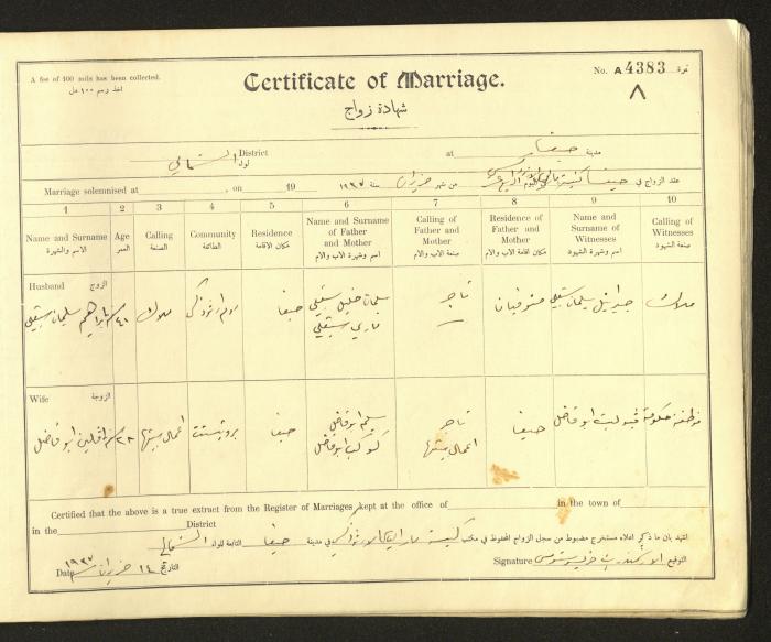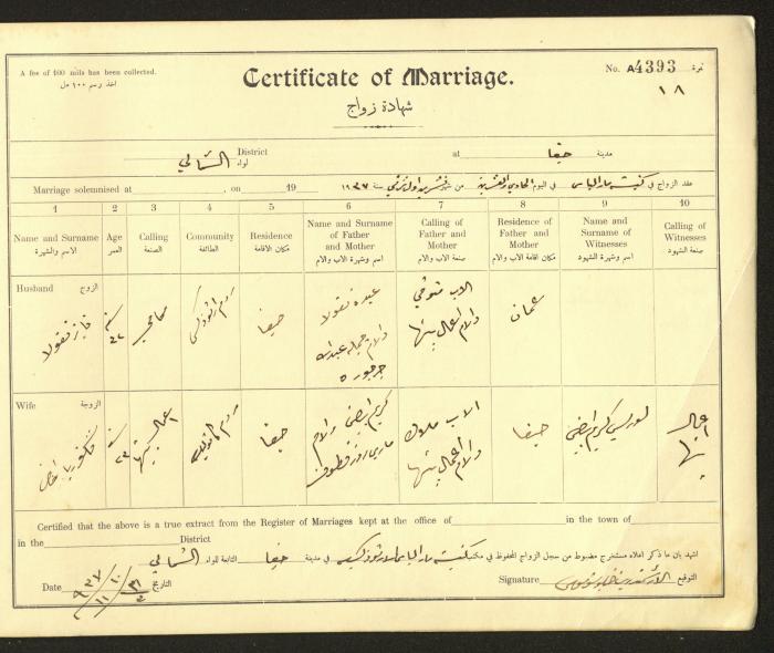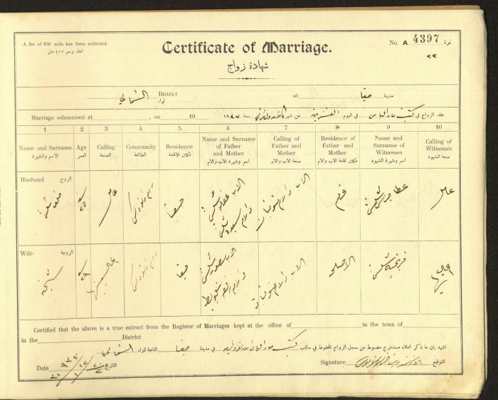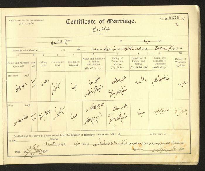 Issued in Arabic and English from 1937 to 1938, this document shows a register containing marriage certificates held at the Mar Elias Orthodox Church in Haifa. The certificate documents the names and surnames of the husband and wife, their age, sect, and place of residence, in addition to information about their parents and witnesses.