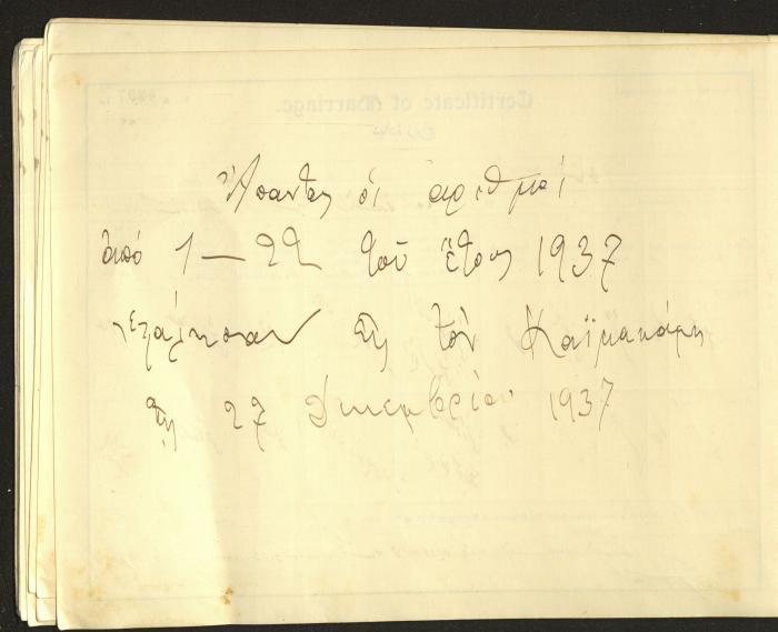"Marriage Certificates", by the Mar Elias Orthodox Church, Haifa, 1937-1938