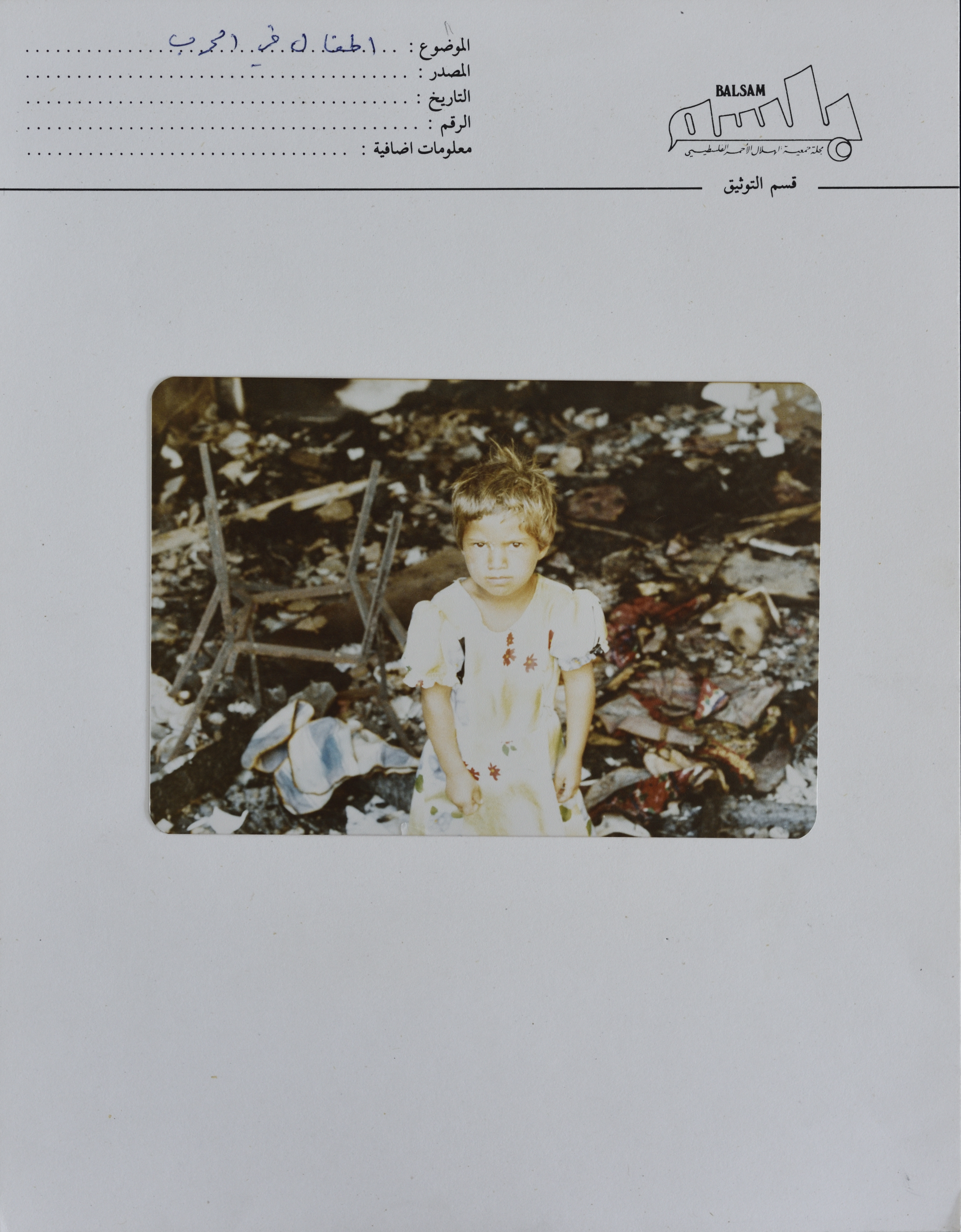 Taken during the course of the war in 1980s, this photograph shows a girl in a Palestinian refugee camp in Lebanon. It was found on a card with a header displaying Balsam Magazine's slogan, a method of archiving used by the Palestine Red Crescent Society.