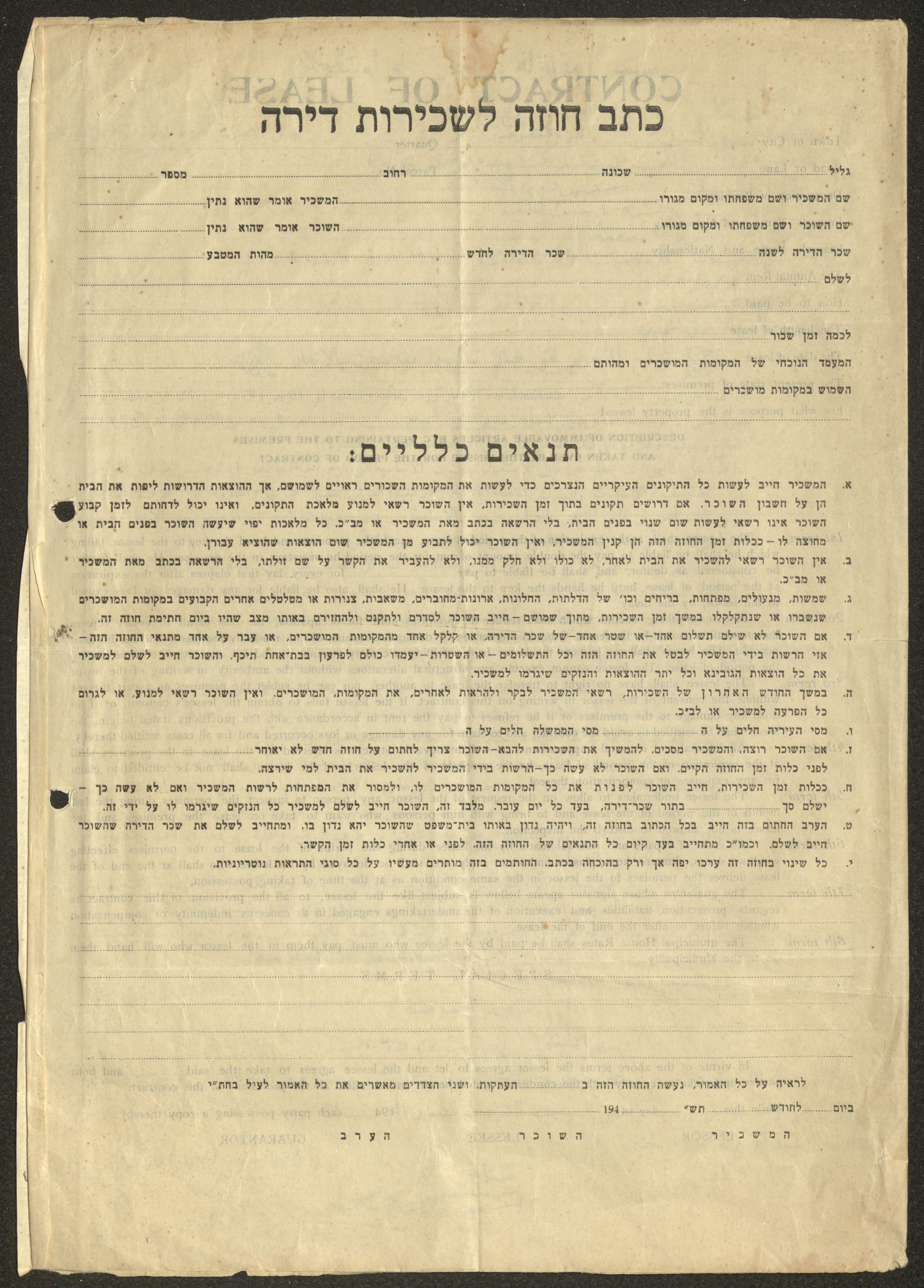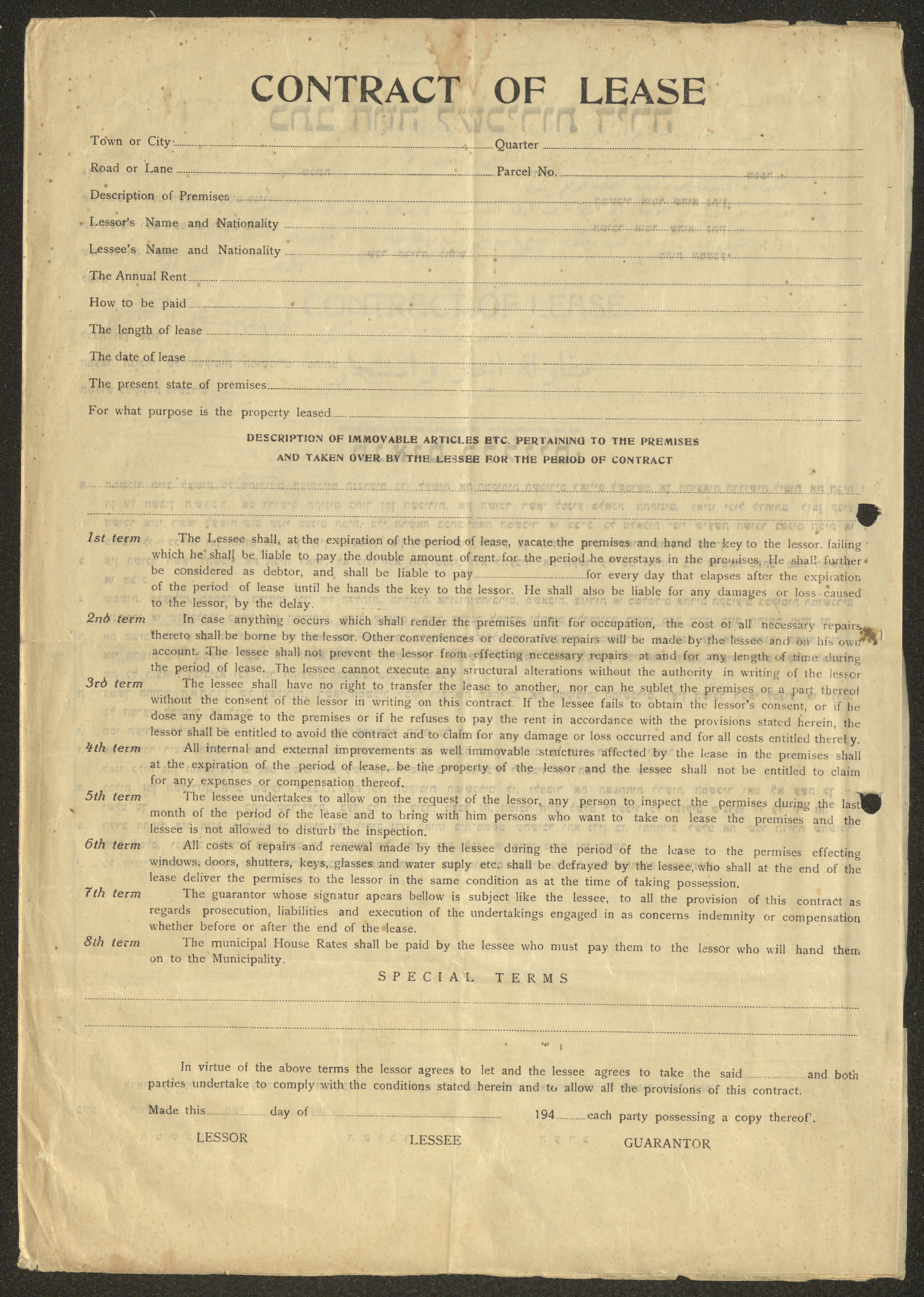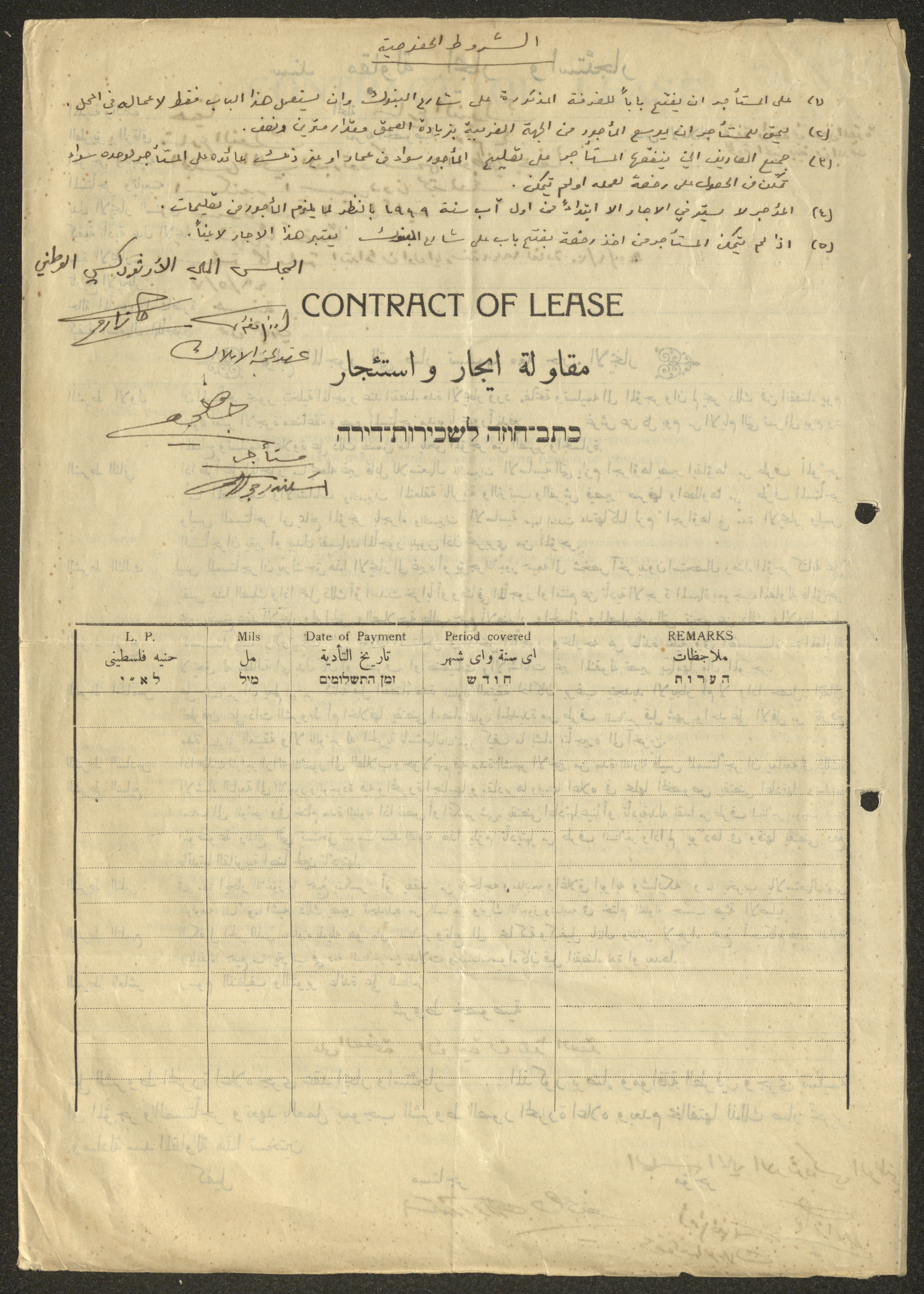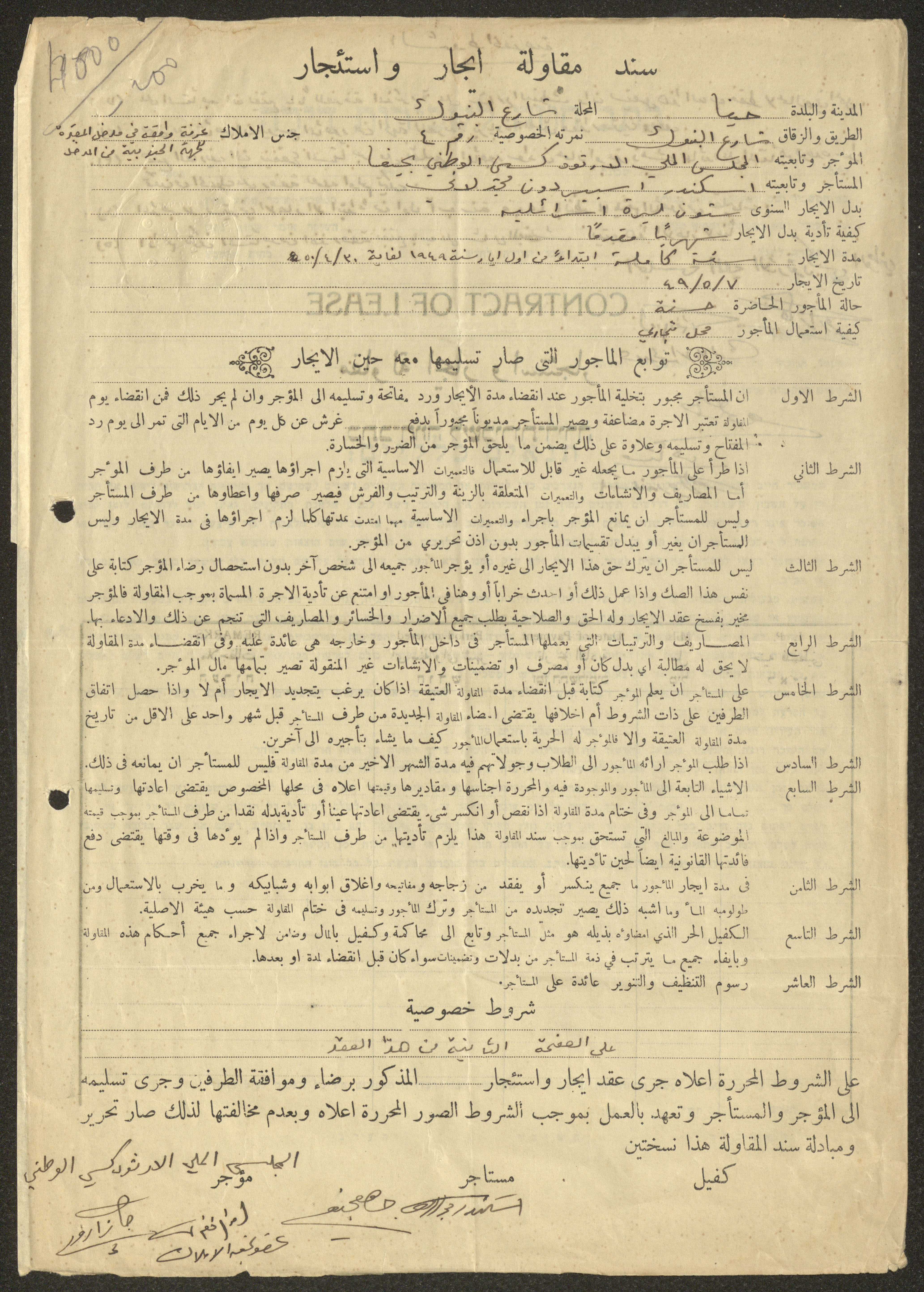 Issued on 7 May 1949, this document shows a contract of lease that was concluded between the National Orthodox Communal Council in Haifa, the lessor, and Iskandar Majdalani, the lessee, and provides that the Council leases out a shop to him for 60 Israeli Liras for the period from 1 May 1949 to 30 April 1950.