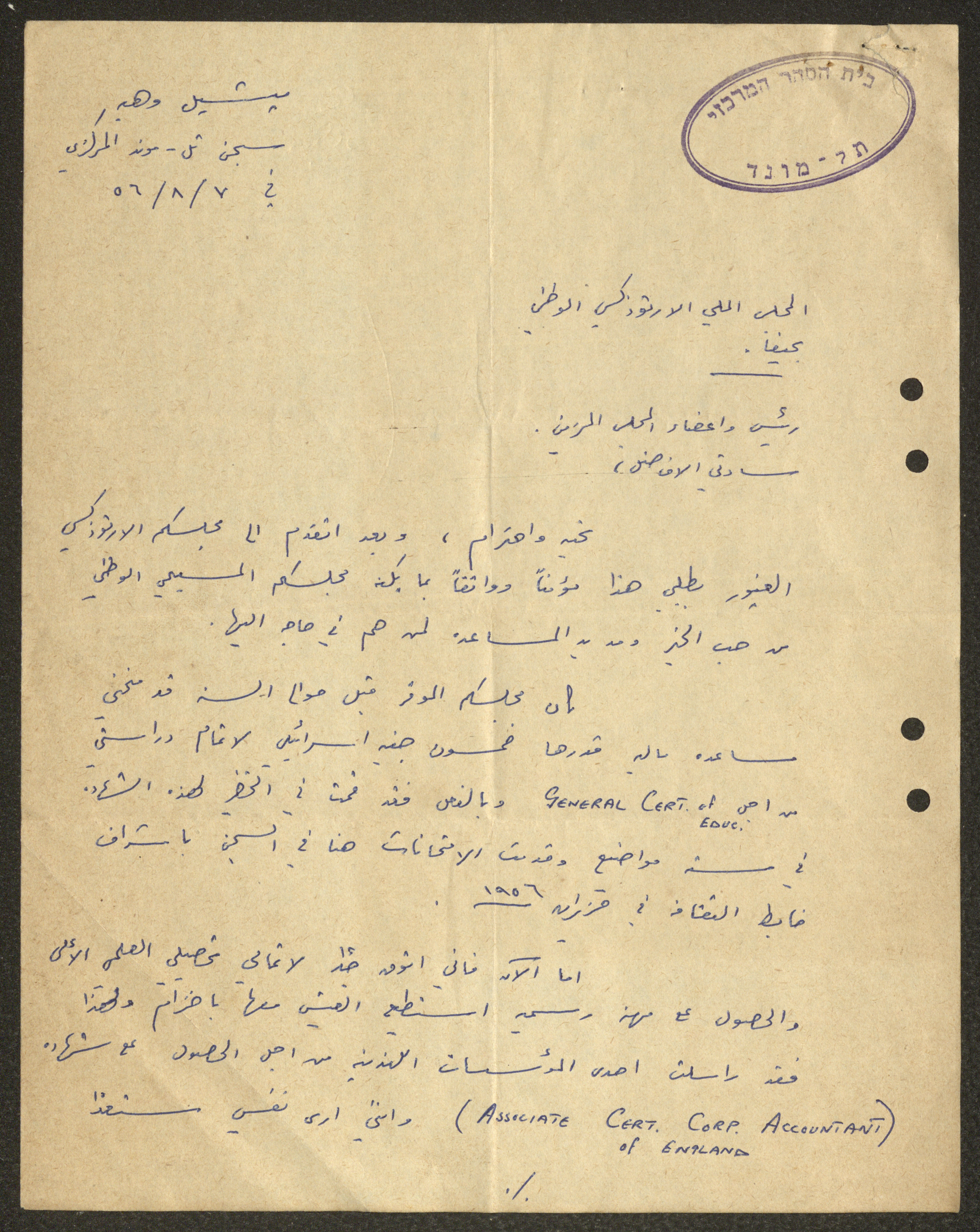 A Letter from Michel Wahbeh to the Orthodox Communal Council, Haifa, 7 August 1956
