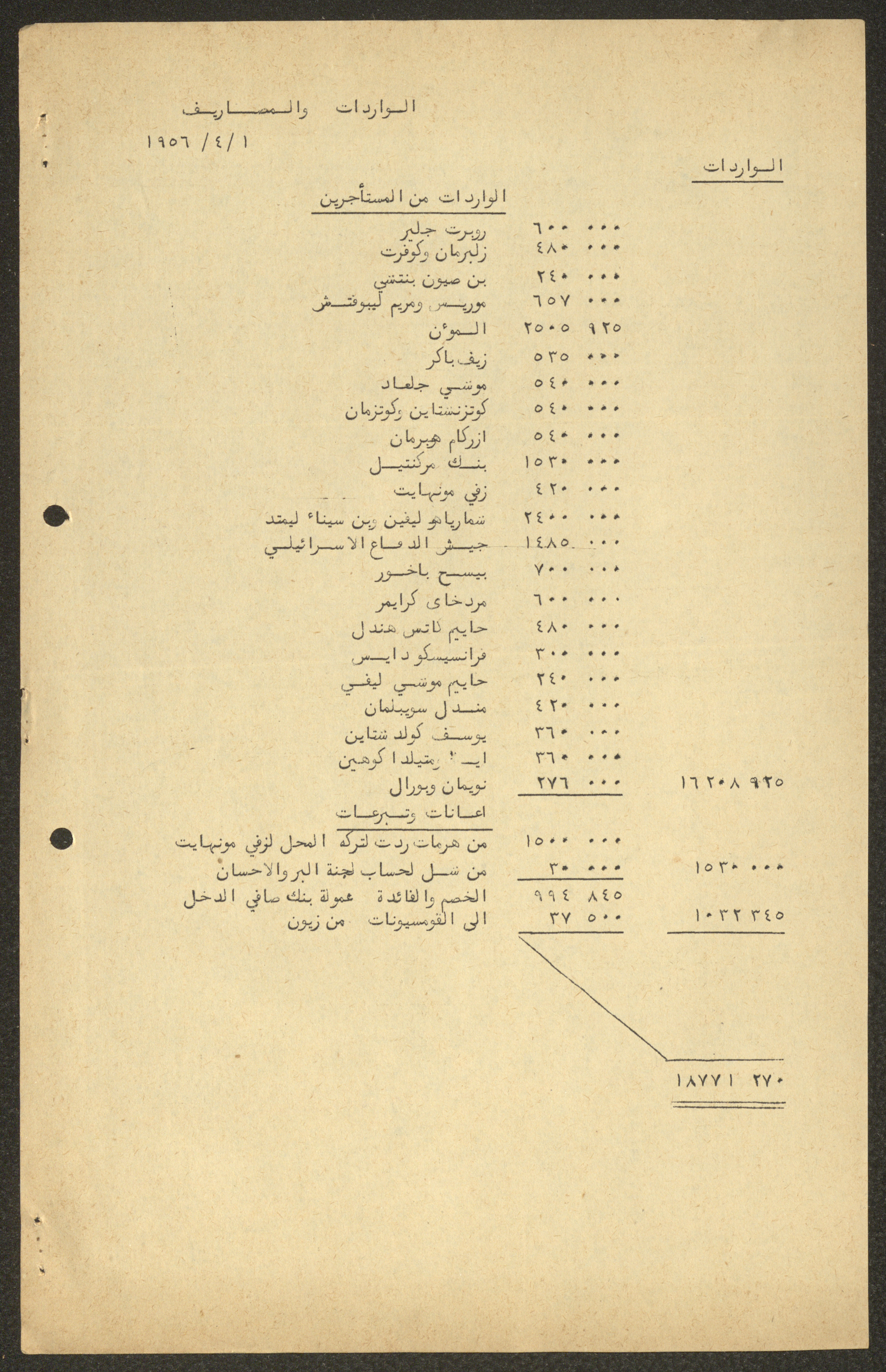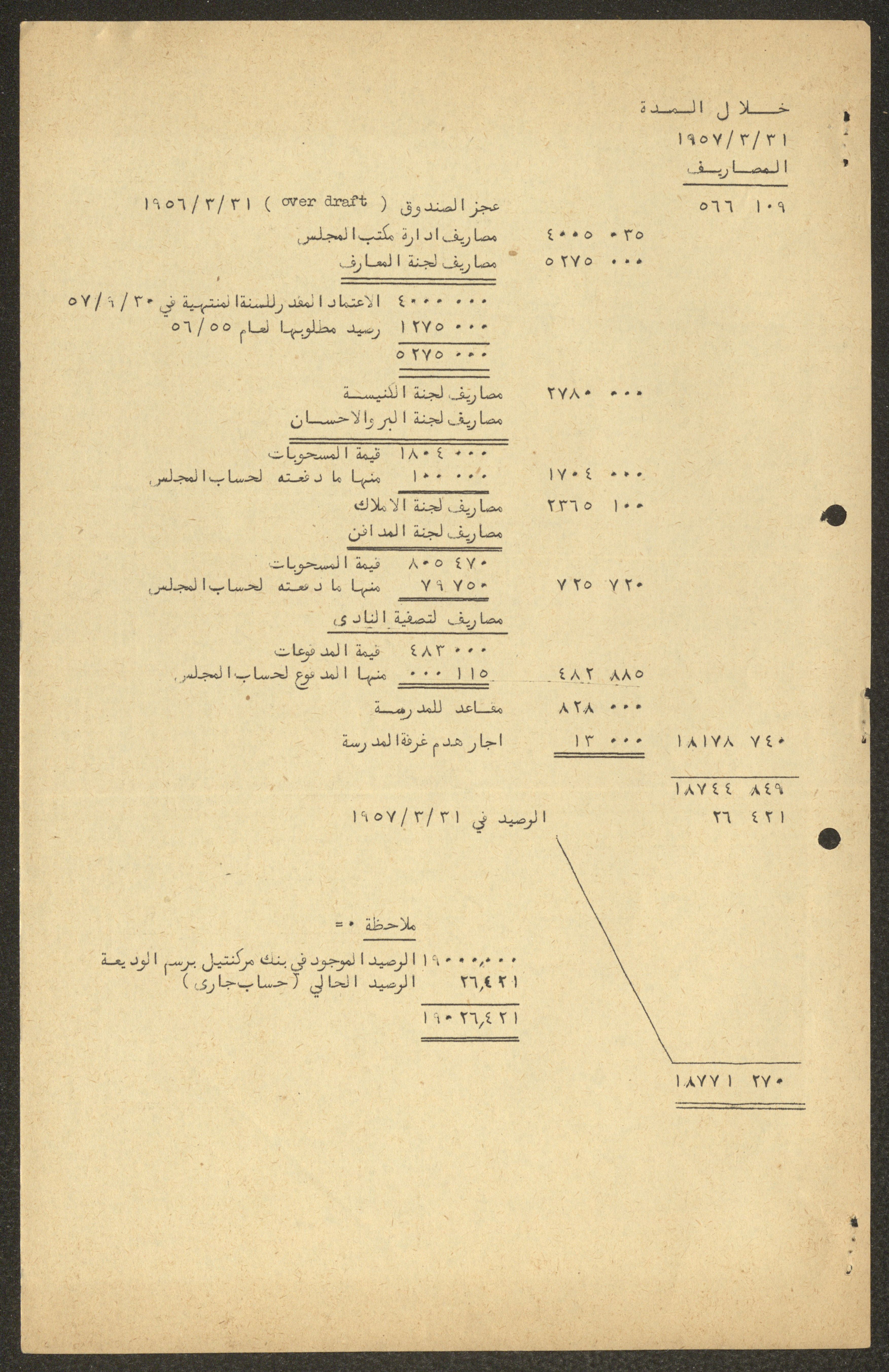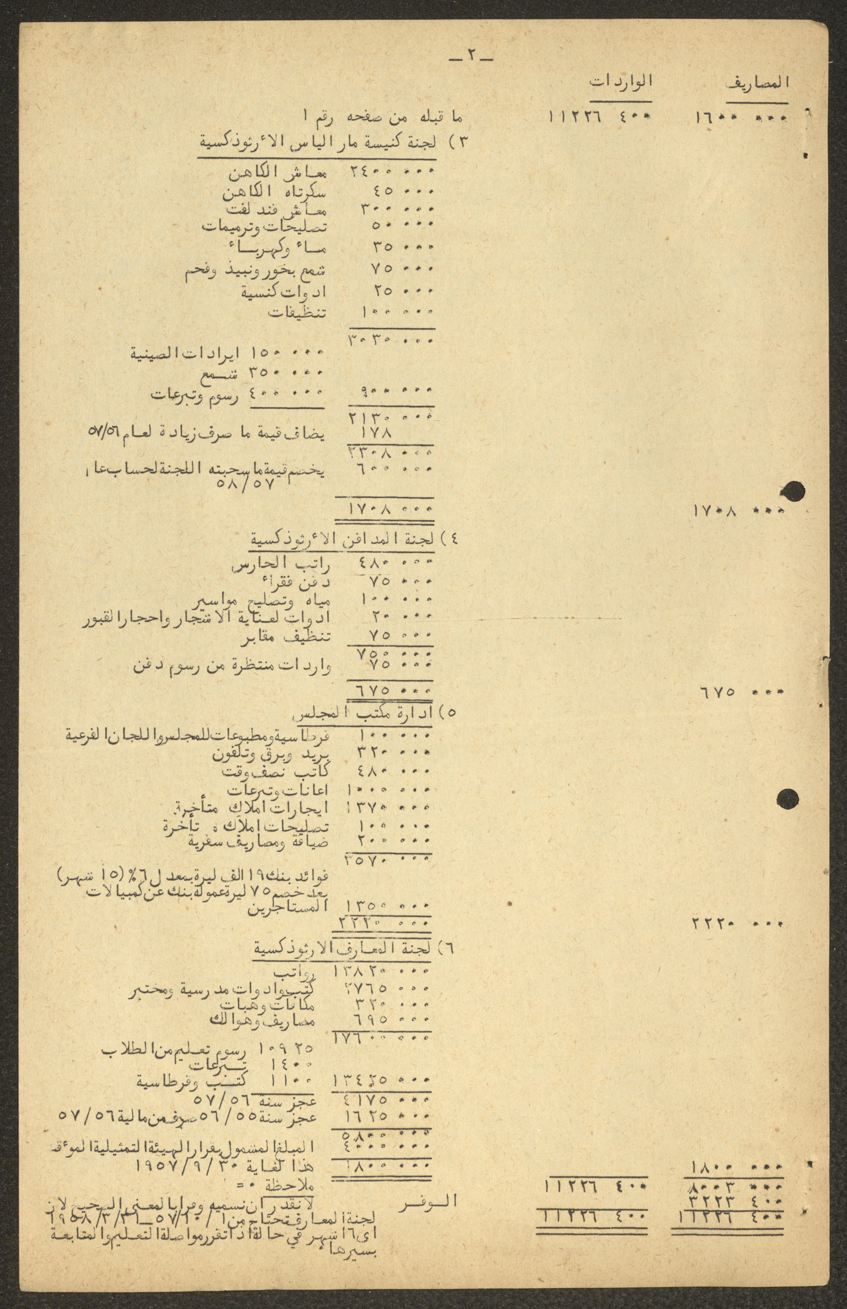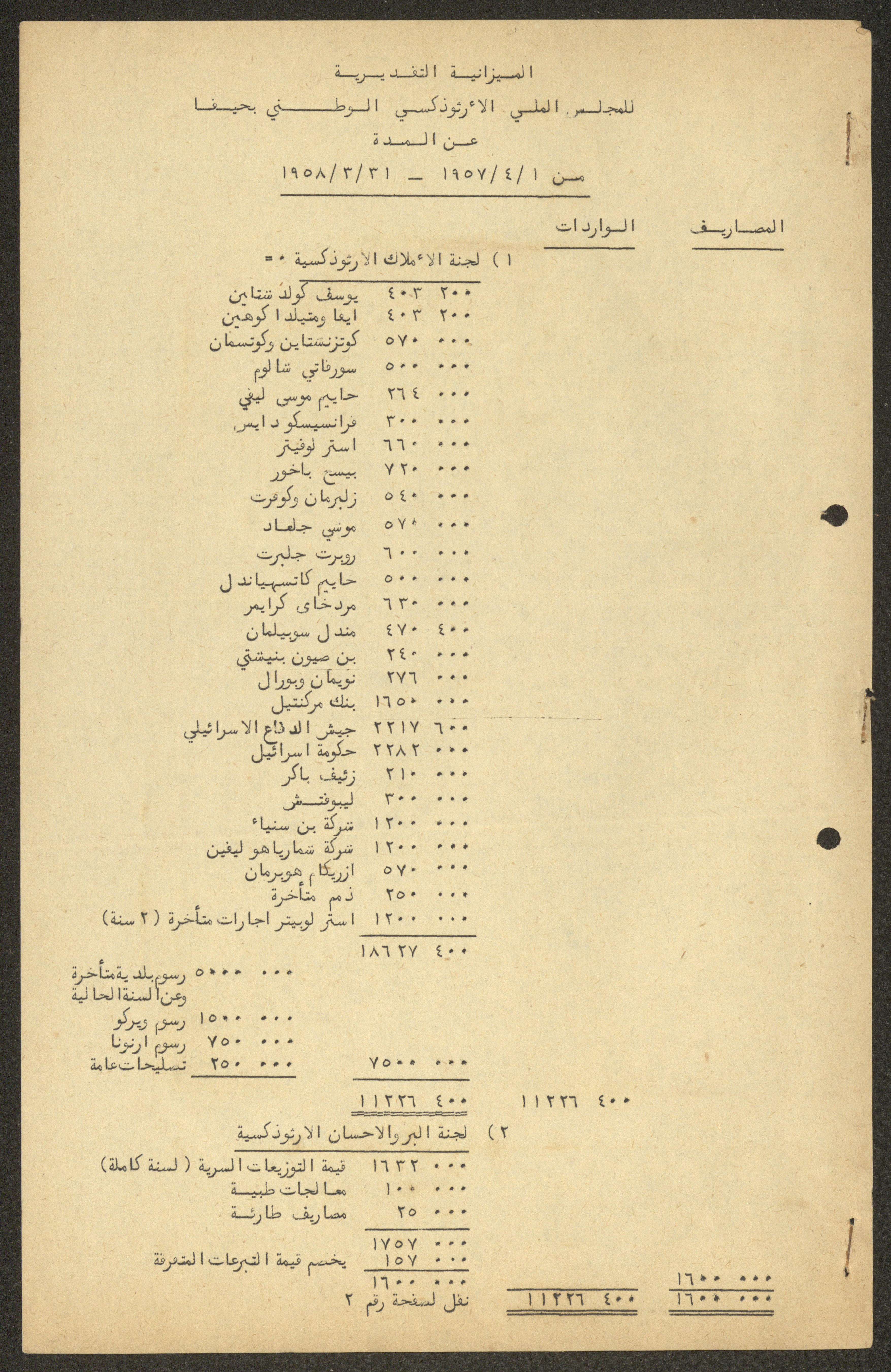 Issued between 1957 and 1958, this document shows the estimated budget of the expenses of the National Orthodox Communal Council in Haifa for the period from 1 April 1957 to 31 March 1958.