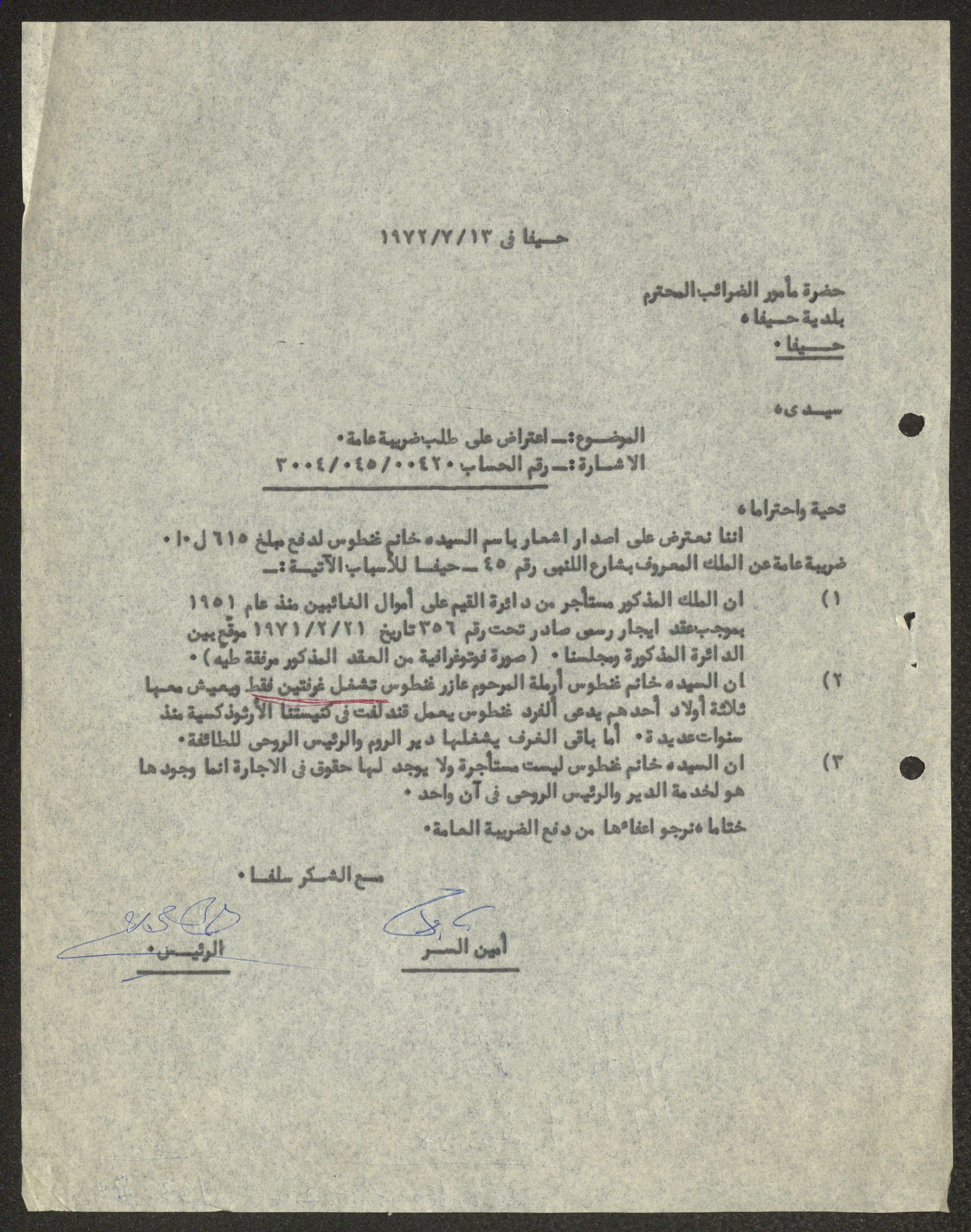 Abu Khdair, Nour. "The National Orthodox Communal Council-Haifa Collection". Archival Inventory. July 2021. The Palestinian Museum Digital Archive.
