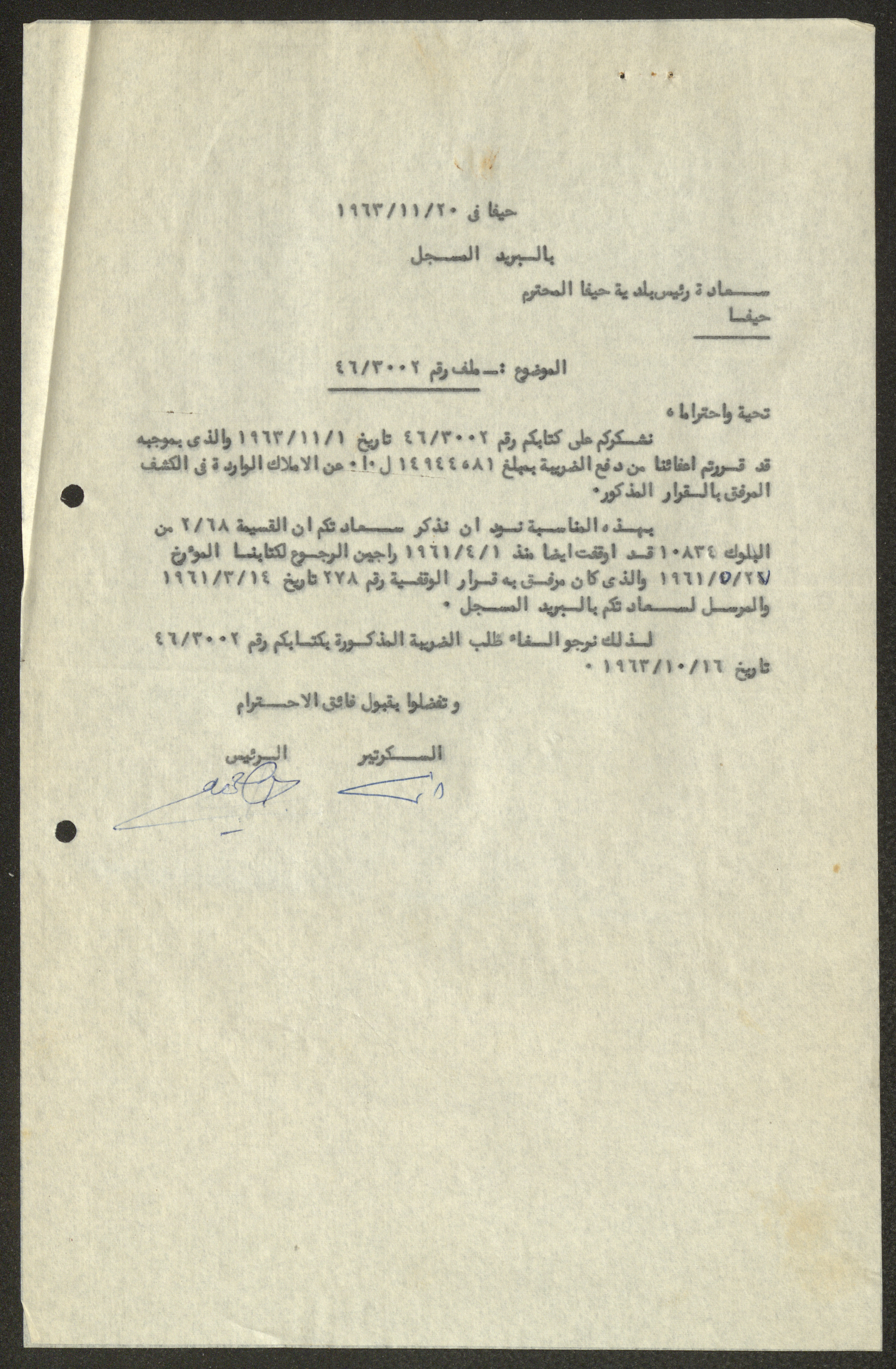 Issued on 30 November 1963, this document shows a letter that was addressed from the National Orthodox Communal Council to the mayor of Haifa regarding a tax exemption decision.