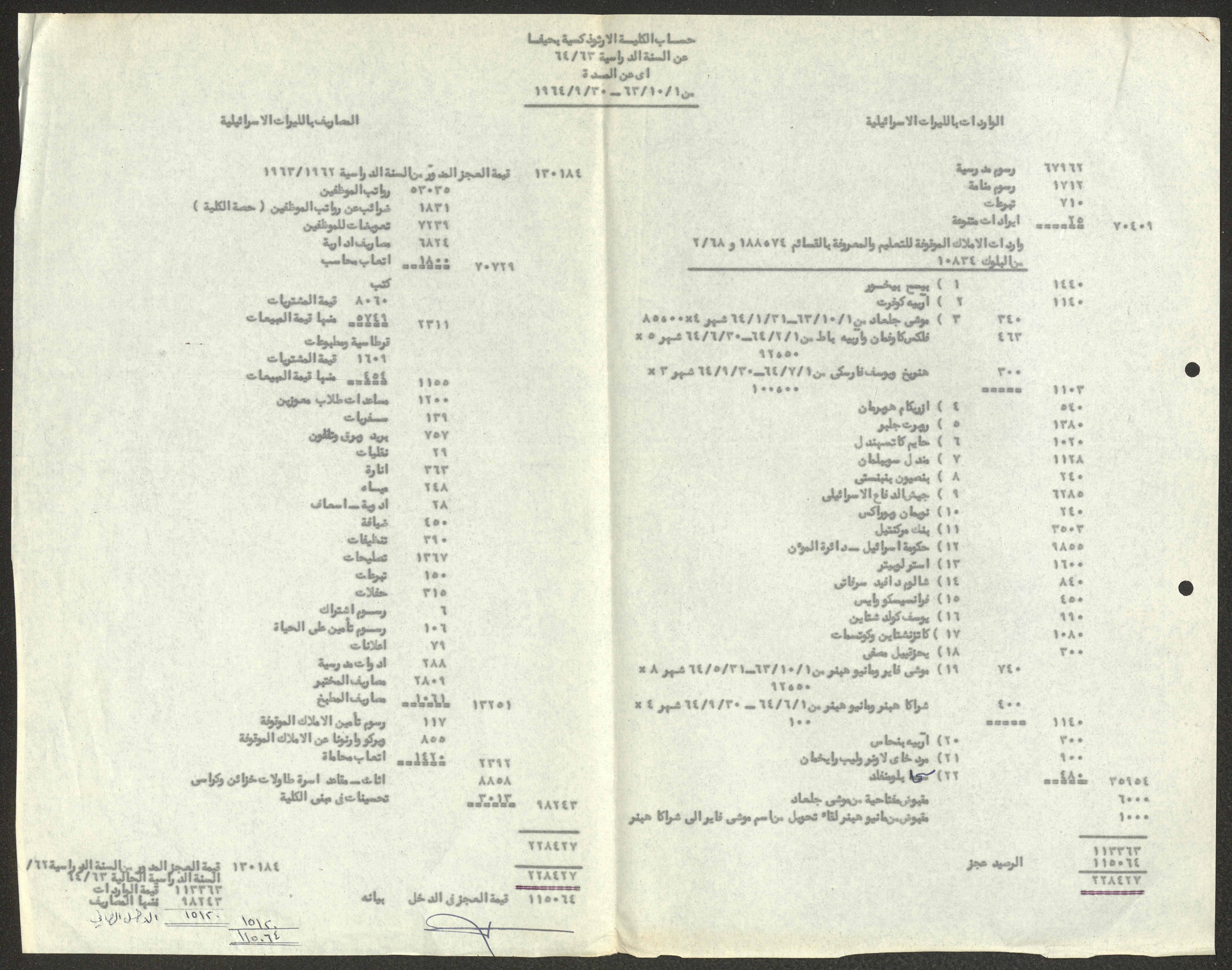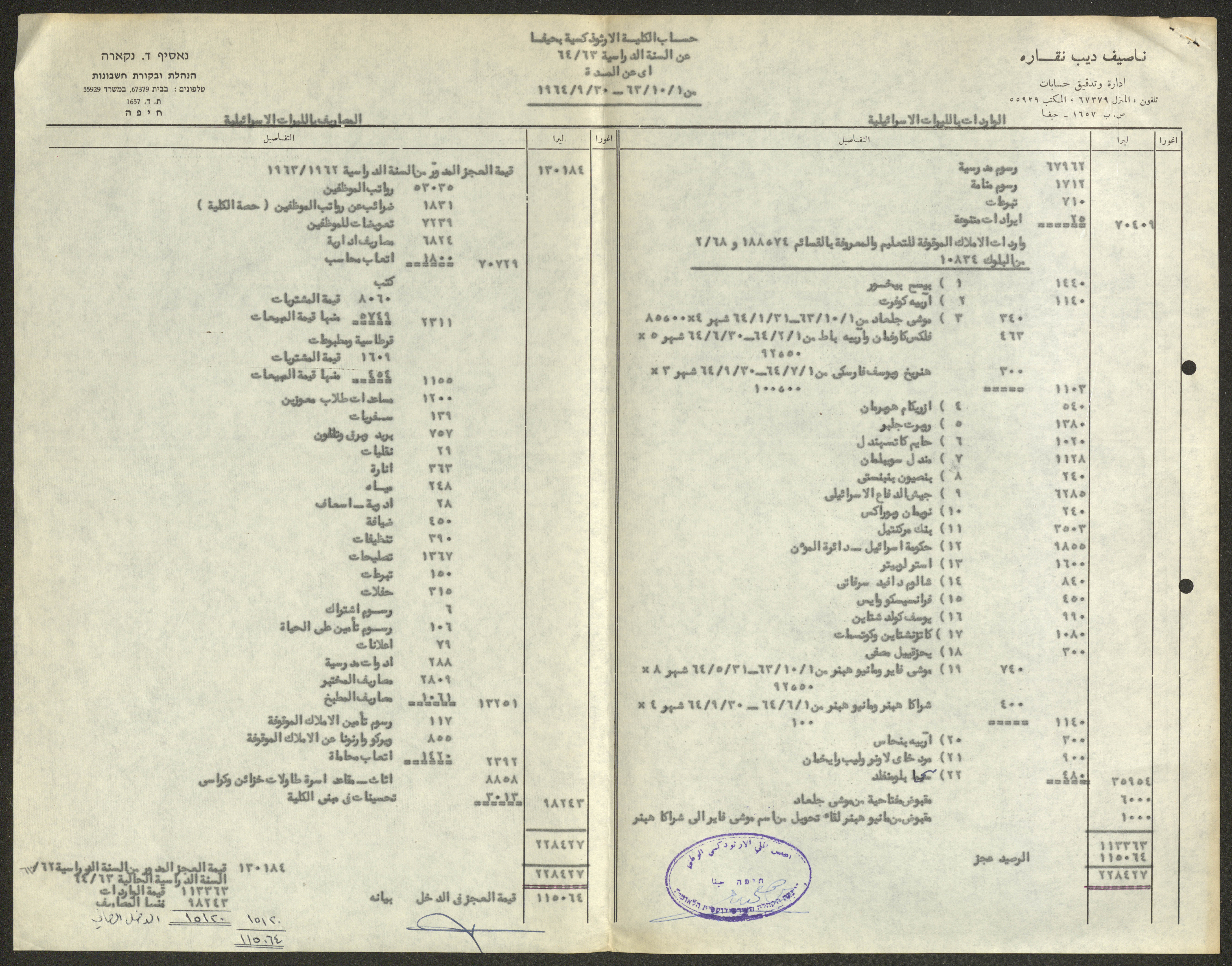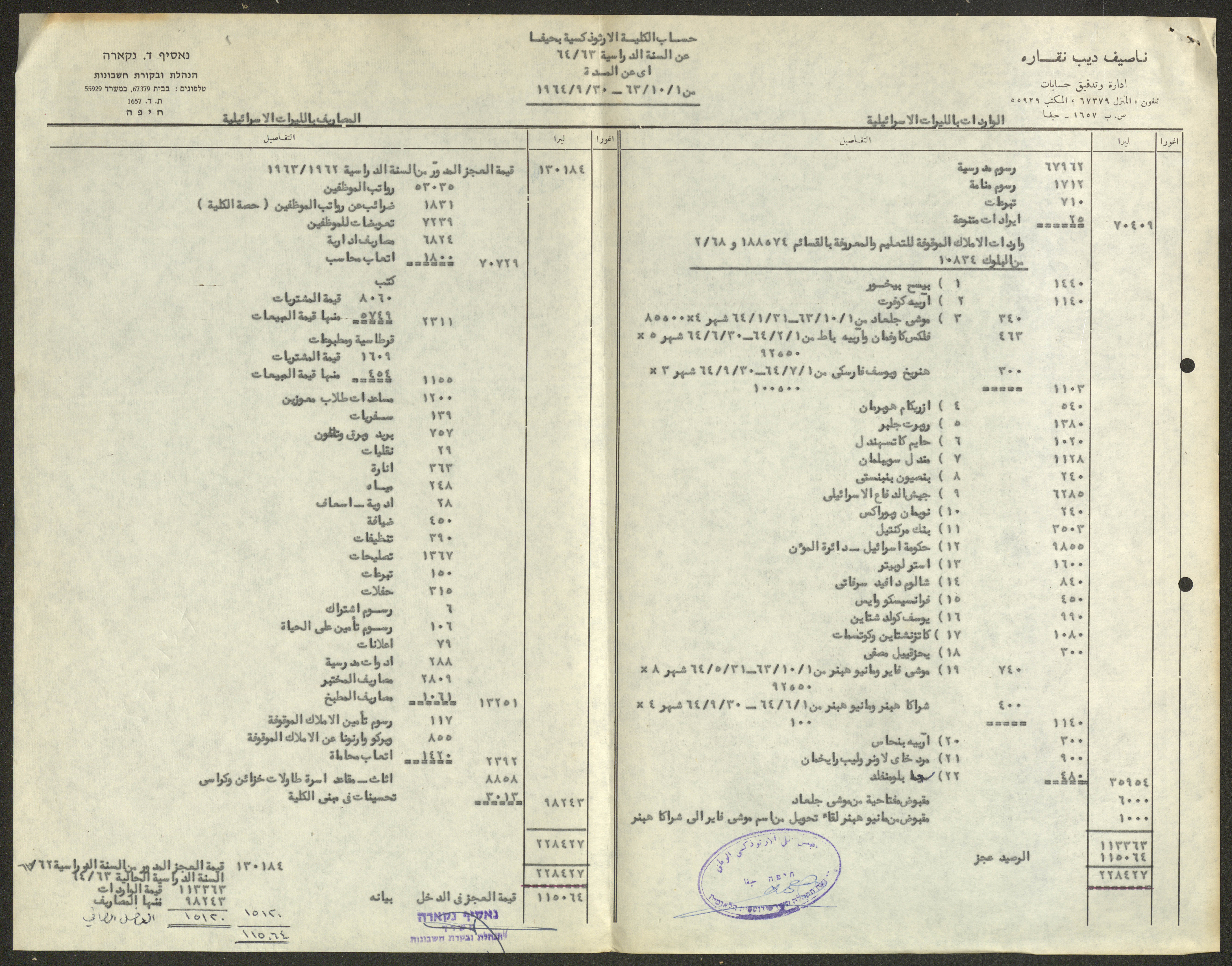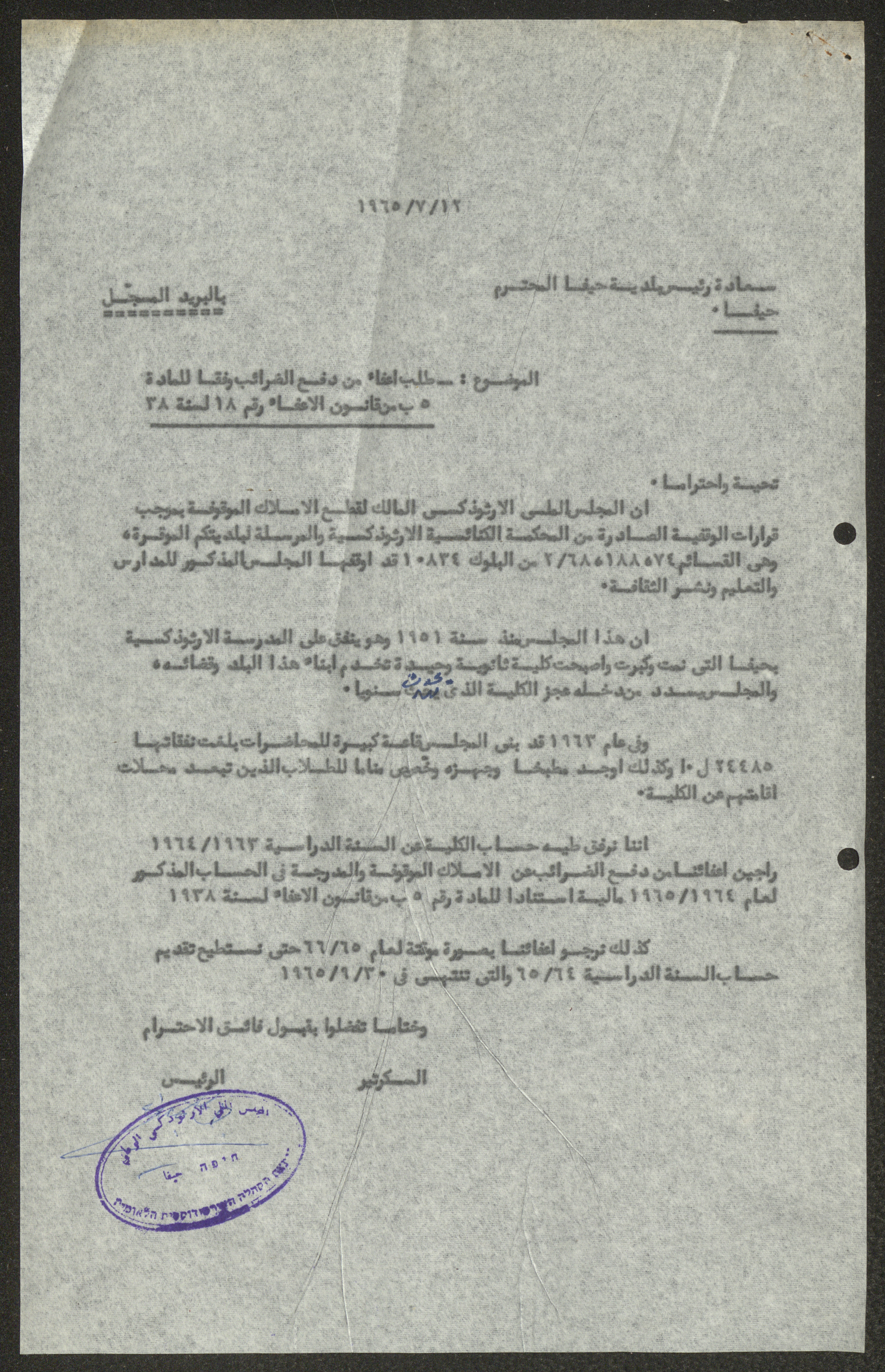 رسالة من المجلس الملي الأرثوذكسي الوطني في حيفا إلى رئيس بلدية حيفا، بتاريخ 12 تموز 1965، حول طلب إعفاء من دفع ضريبة. كما تتضمن الرسالة حسابات خاصة بالكلية الأرثوذكسية.
