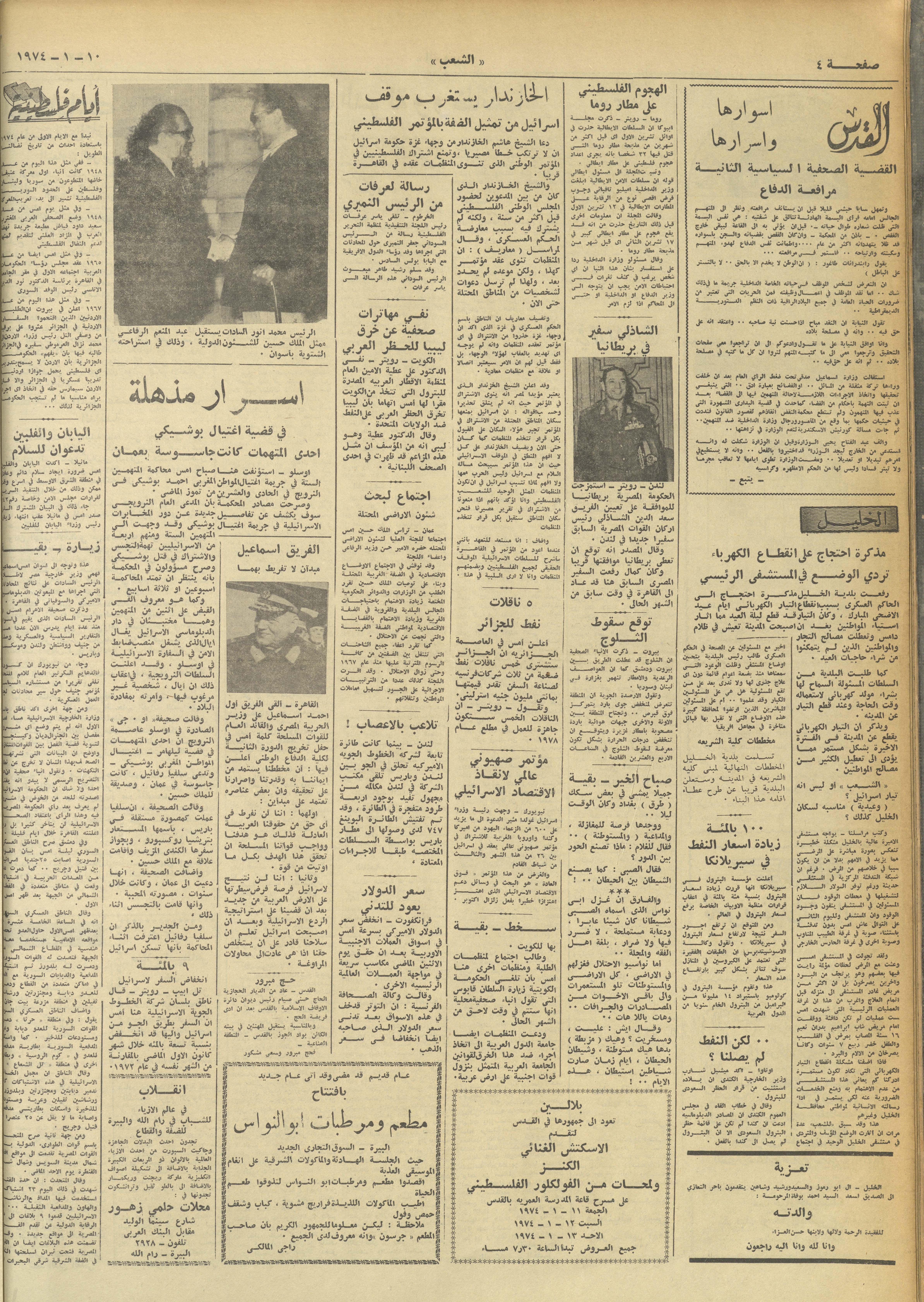 وثيقة مطبوعة باللغة العربية، مكونة من 4 صفحات، تتضمن العدد 432 من جريدة الشعب الصادر بتاريخ 10 كانون الثاني 1974، وهي جريدة يومية سياسية مصورة تصدر في القدس، بلغ ثمن العدد 40 أغورة واشتمل على مجموعة من البيانات والإعلانات والدعايات والأخبار السياسية والرياضية، منها: - نقلاً عن منظمة البلدان المصدرة للنفط (أوبيك)، أية محاولة ضد النفط العربي تؤدي الى كارثة عالمية كبرى، والحكومة السعودية تلغم جميع حقول النفط في أراضيها. - رسالة أمهات سجناء بئر السبع الى سكرتير هيئة الأمم المتحدة ولجنة حقوق الانسان وهيئة الصليب الأحمر الدولي. - القاء قنبلة يدوية على دورية إسرائيلية في دورا قضاء الخليل. - في حديث نشرته صحيفة لومانتيه الفرنسية، ياسر عرفات يرفض عودة الضفة المحتلة الى الأردن. - نابلس تؤكد استنكارها لمحاولة إنشاء مستعمرة يهودية، وتبعث برقيات احتجاجية الى وزير دفاع الاحتلال الإسرائيلي والحاكم العسكري للضفة المحتلة. - حول نتائج الانتخابات وتشكيل الحكومة الجديدة في إسرائيل. - "غايات الدولة ووظائفها"، مقال بقلم رجائي عبد الله.