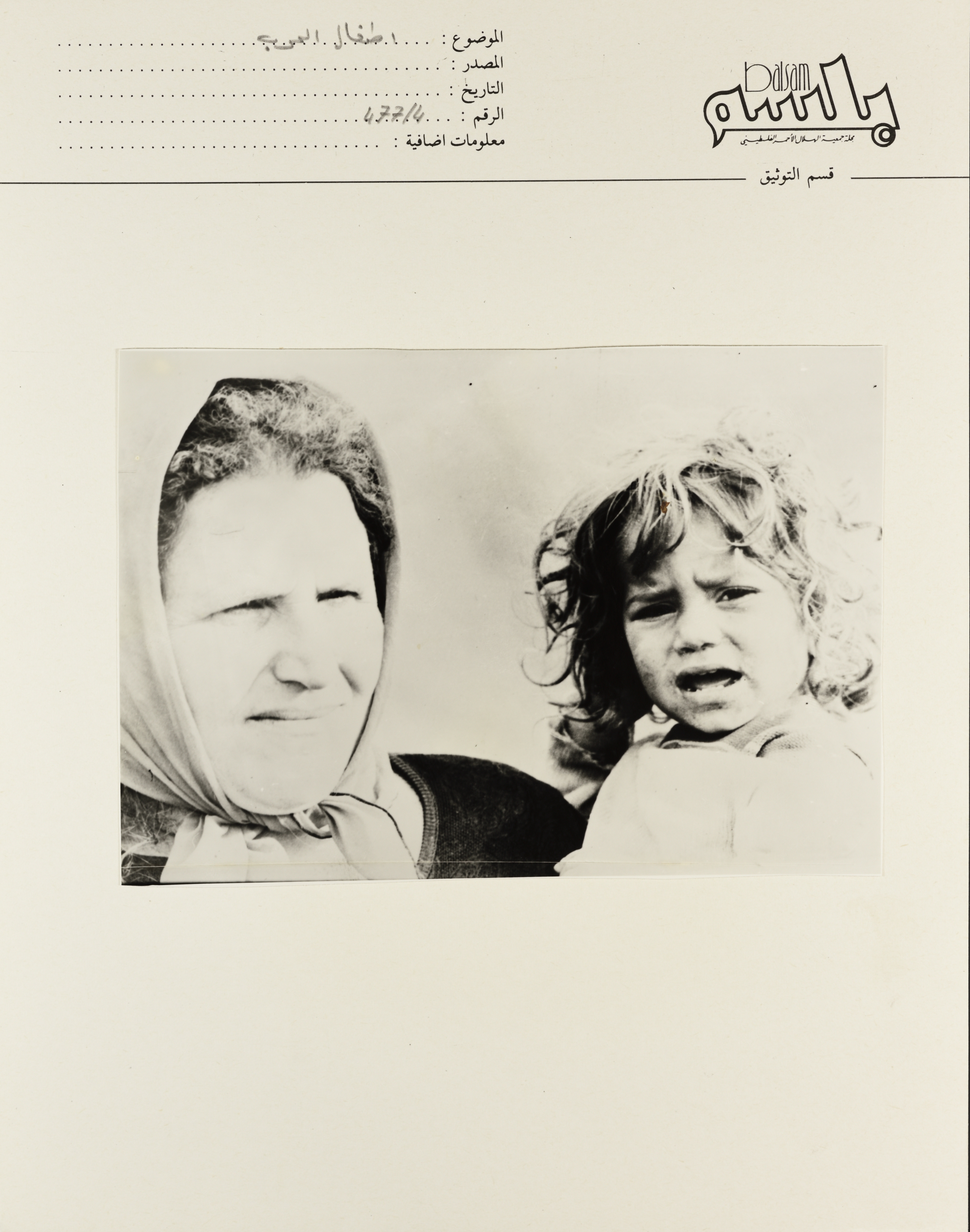صورةٌ لامرأةٍ فلسطينيةٍ تحمل طفلةً في أحد مخيمات اللاجئين الفلسطينيين في لبنان خلال فترة الحرب في ثمانينات القرن العشرين. وُجِدَت الصورة ملصقةً على بطاقةٍ مروسّةٍ بشعار مجلة بلسم، وهي طريقةٌ للأرشفة استخدمتها جمعية الهلال الأحمر الفلسطيني.