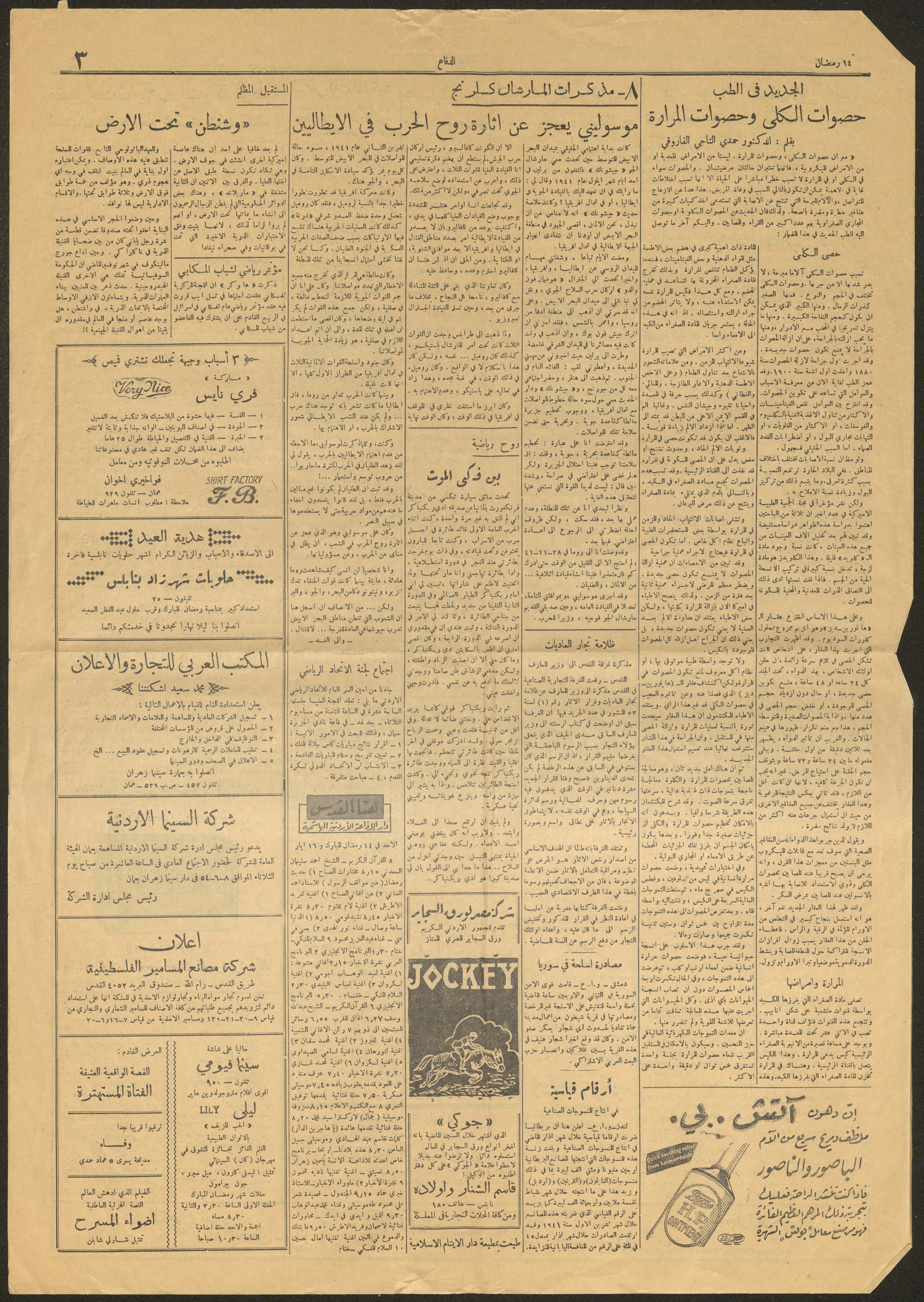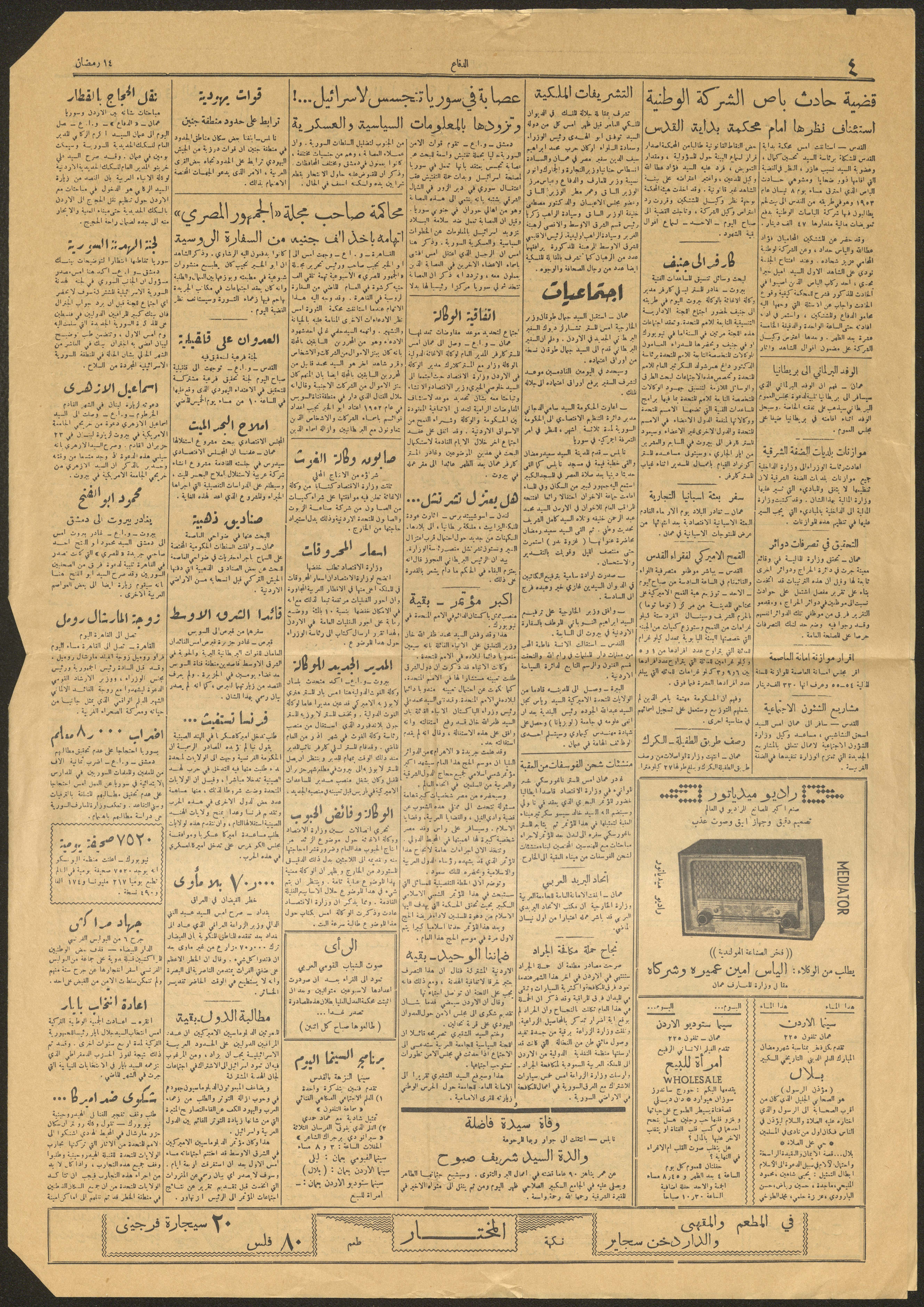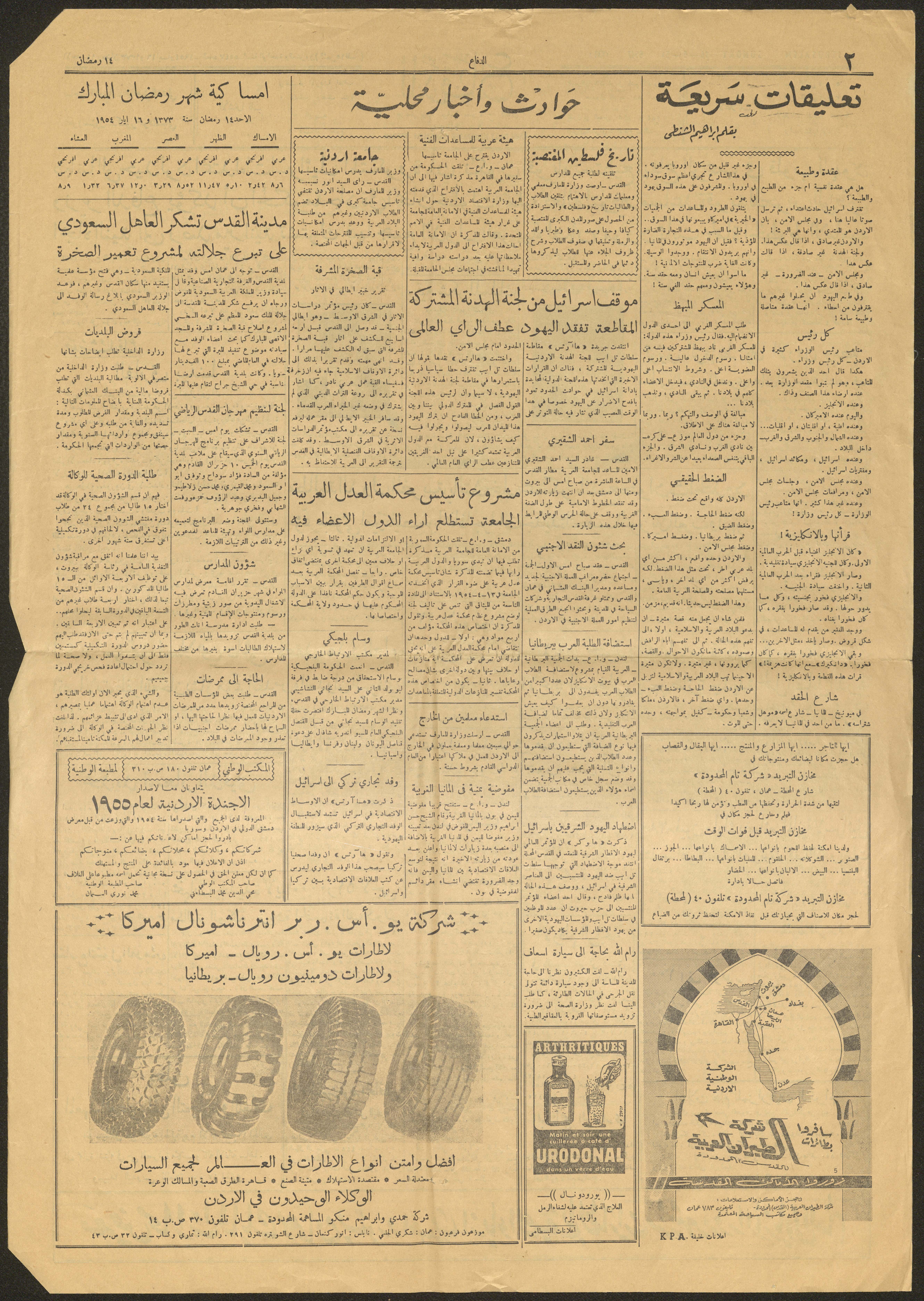 العدد 5547 من صحيفة الدفاع، القدس، 16 أيار 1954