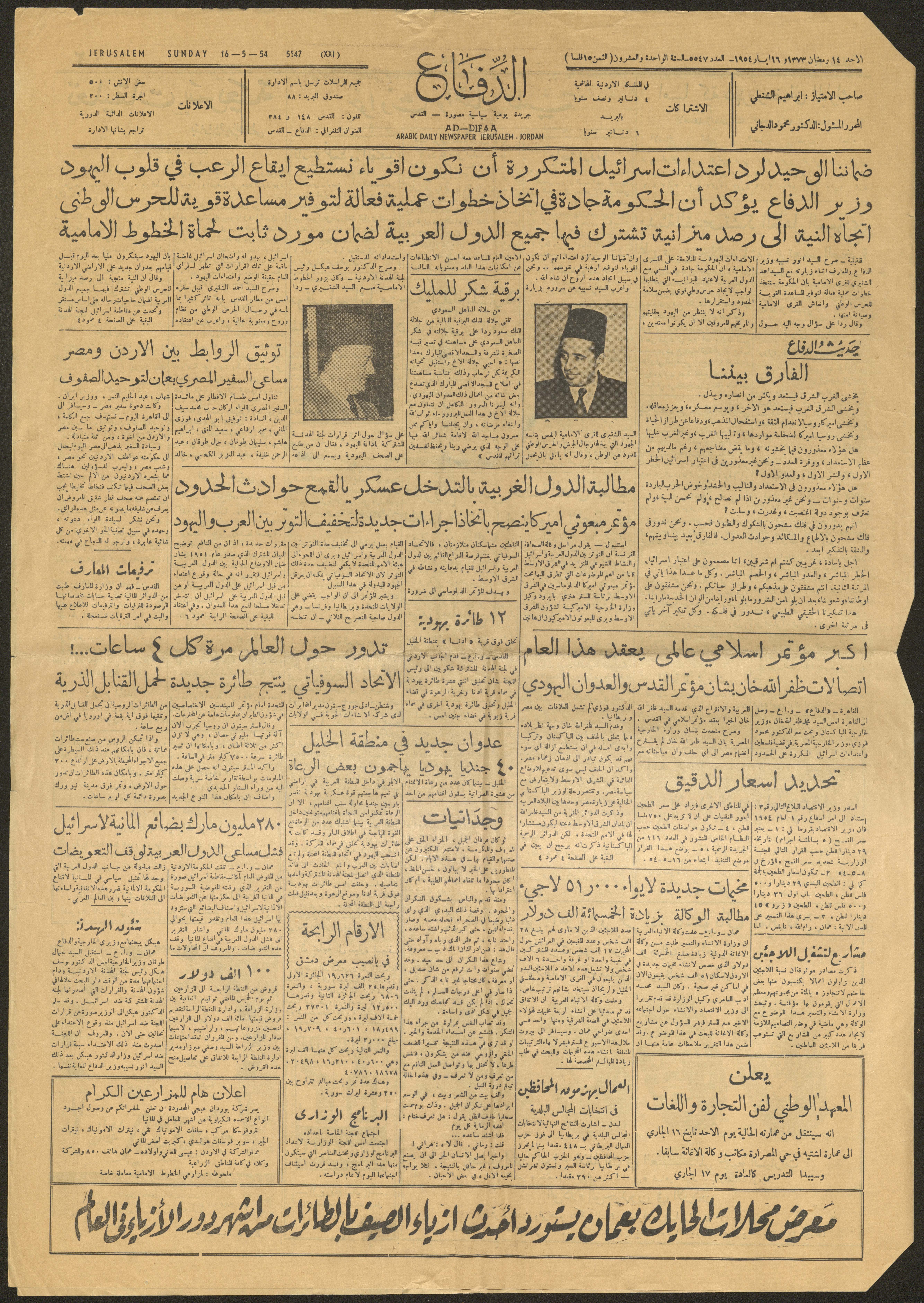 تتضمن هذه الوثيقة المطبوعة باللغة العربية العدد 5547 من صحيفة الدفاع للسنة الواحدة والعشرين على التوالي الصادر يوم الأحد الموافق 16 أيار 1954 في القدس، وهي صحيفة يومية سياسية مصورة ويملكُ امتيازها إبراهيم الشنطي ومُحررها المسؤول الدكتور محمد الدجاني وتباع مقابل 15 فلس. في هذا العدد يطالع القارئ العناوين الرئيسية على الشكل التالي: - ضماننا الوحيد لرد اعتداءات إسرائيل المتكررة أن نكون أقوياء نستطيع إيقاع الرعب في قلوب اليهود ووزير الدفاع يؤكد أن الحكومة جادة في اتخاذ خطواب عملية فعالية لتوفير مسعادة قوية للحرس الوطني واتجاه النية لرصد ميزانية تشترك فيها جميع الدول العربية لضمان موروث ثابت لحماة الخطوط الأمامية. - توثيق الروابط بين الأردن ومصر: مساعي السفير المصري بعمان لتوحيد الصفوف. - مطالبة الدول الغربية بالتدخل العسكري لقمع حوادث الحدود: مؤتمر مبعوثي أميركا ينصح باتخاذ إجراءات جديدة لتخفيف التوتر بين العرب واليهود. - أكبر مؤتمر إسلامي عالمي يعقد هذا العام: اتصالات ظفرالله خان بشأن مؤتمر القدس والعدوان اليهودي. - مخيمات جديدة لإيواء 51.000 لاجئ ومطالبة الوكالة بزيادة قيمتها 500.000 دولار. - عدوان جديد في منطقة الخليل: 40 جندي يهاجمون بعض الرعاة. - بضائع ألمانية بقيمة 280 مليون مارك لإسرائيل وفشل مساعي الدول العربية لوقف التعويضات. - تدور حول العالم مرة كل 4 ساعات: الاتحاد السوفياتي ينتج طائرة جديدة لحمل القنابل الذرية. بالإضافة إلى جملة من الحوادث والأخبار المحلية والعربية والعالمية فضلاً عن الزوايا الاجتماعية والمساحات الإعلانية.