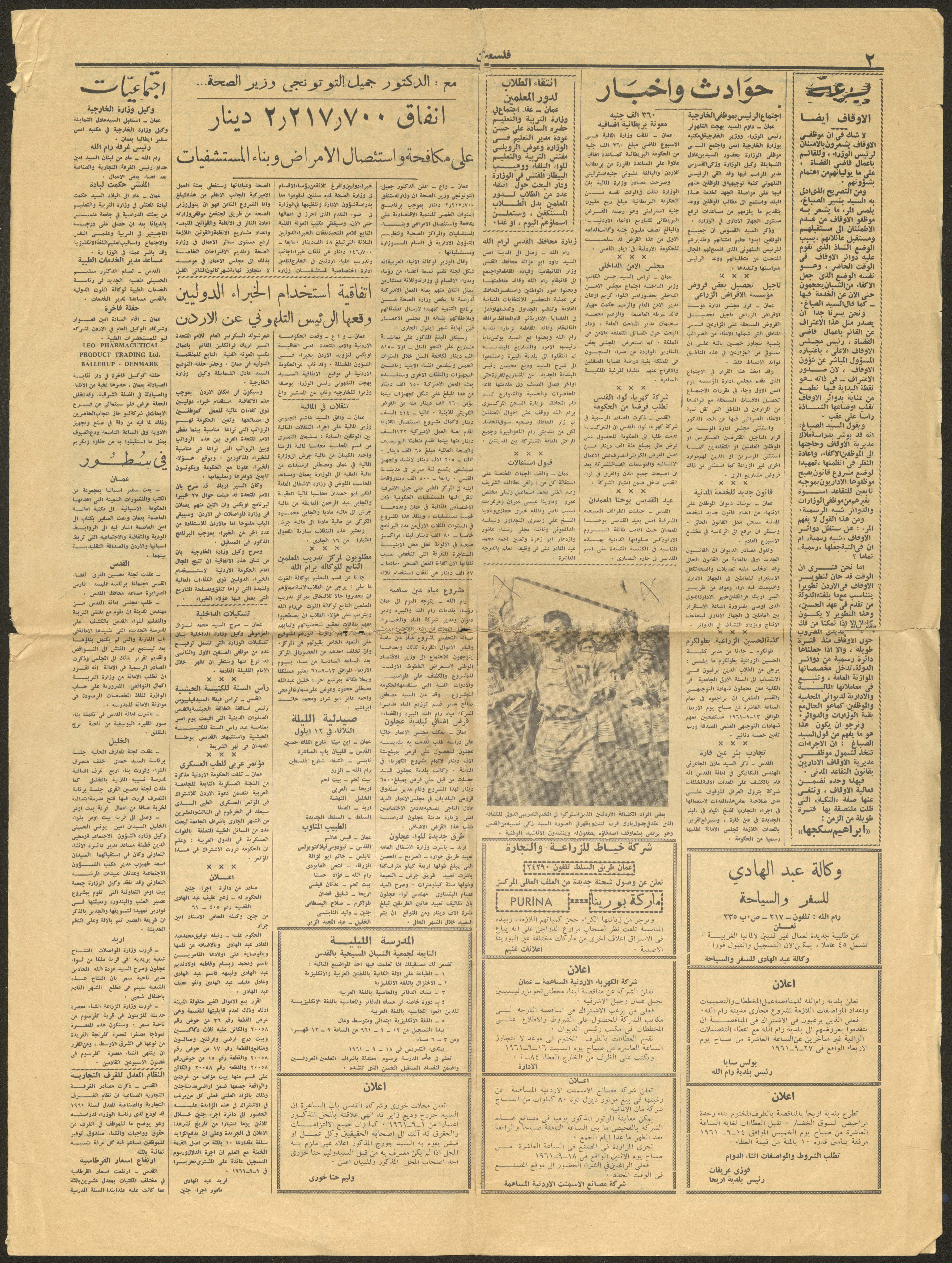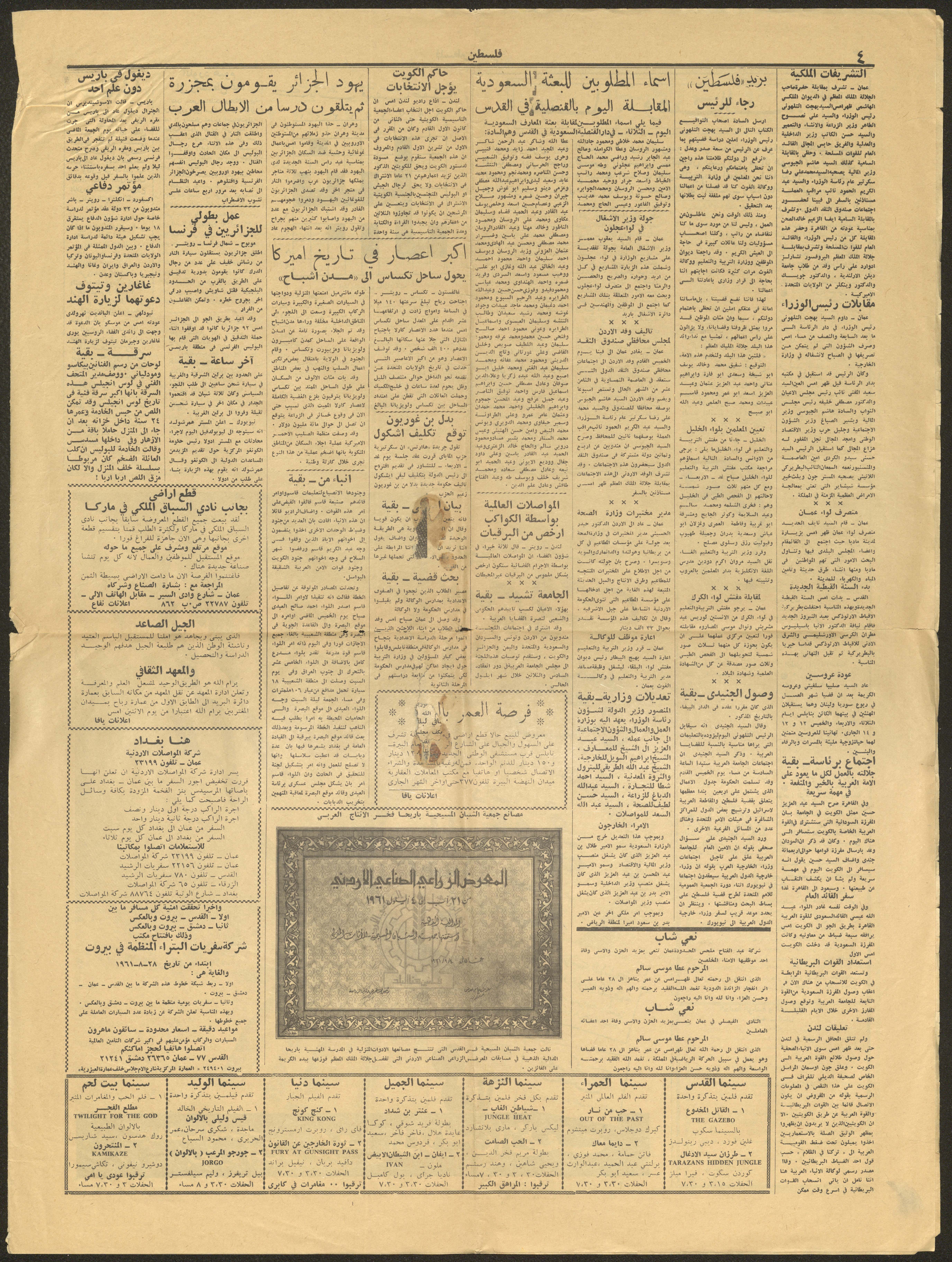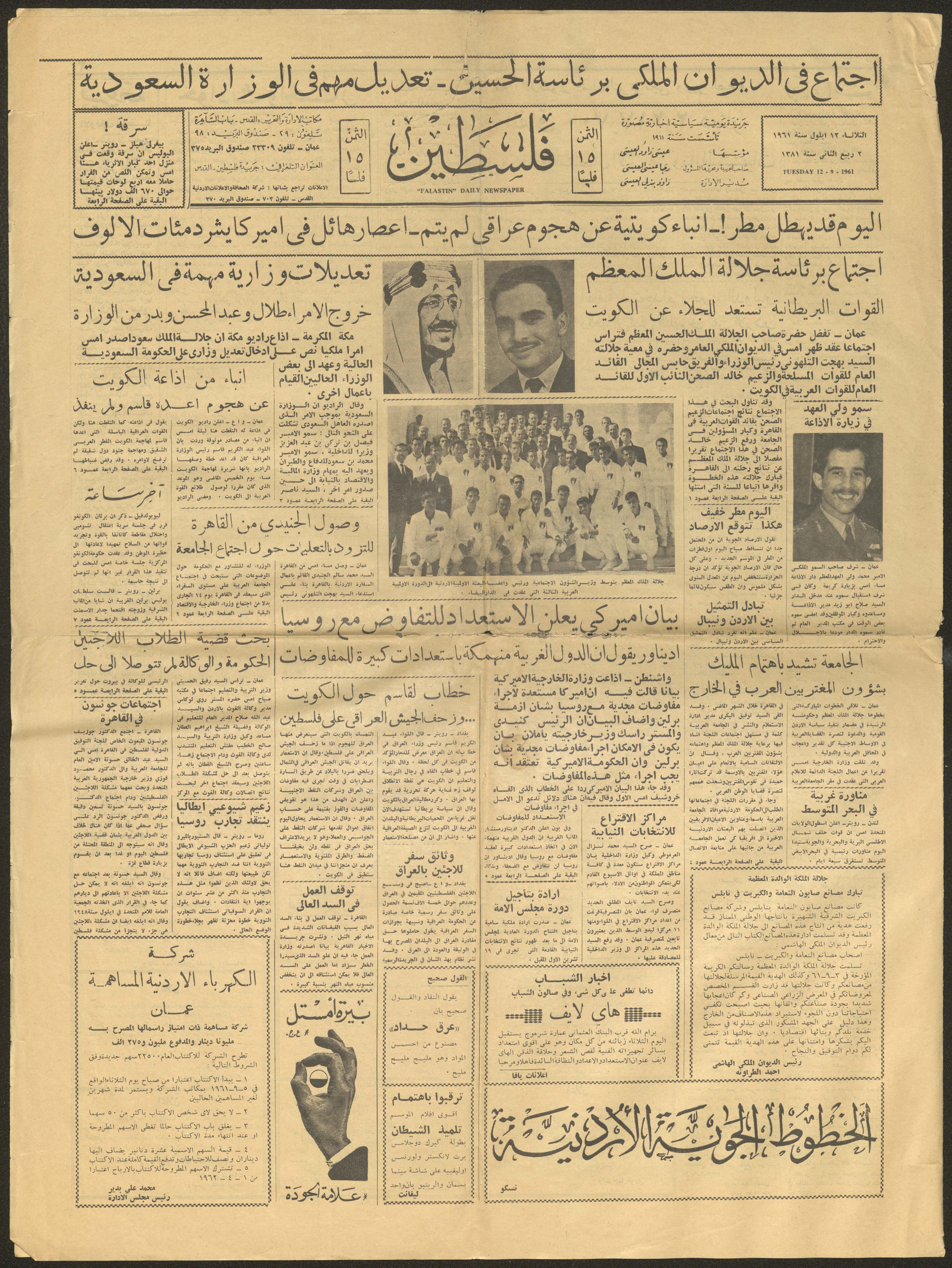 Printed in Arabic, this document includes an issue of the newspaper “Palestine” sold for 15 fils, which is a daily political and news illustrated newspaper issued in Jerusalem in 1911. This issue was issued on Tuesday, corresponding to 12 September 1961. It was founded by Issa Daoud al-Issa and its owner and responsible editor Raja Issa al-Issa. It is managed by Daoud Bandali al-Issa, and its administrative and editorial office is located in Jerusalem- Bab al-Sahira. Concerning advertisements, the advertiser is requested to review the Jordanian Press and Advertising Company in Jerusalem. This issue includes the headlines as follows: - Meeting chaired by His Majesty the King and British forces preparing to evacuate Kuwait. - Important ministerial changes in Saudi Arabia: Princes Talal, Abdel-Mohsen and Badr left the ministry. - News from Radio Kuwait about an attack prepared by al-Qassem, but it was not carried out. - Al-Junaidi arrived from Cairo to provide instructions on the meeting of the League of Arab States. - The Arab League praises the King's interest in the affairs of Arab expatriates abroad. - A speech by Qassem about Kuwait and the Iraqi army's advance on Palestine. - An American statement declaring a readiness to negotiate with Russia: Adenauer says that Western countries are concerned with great preparations for negotiations. In addition to several incidents, local, Arab and international news, as well as social angles and advertising spaces.