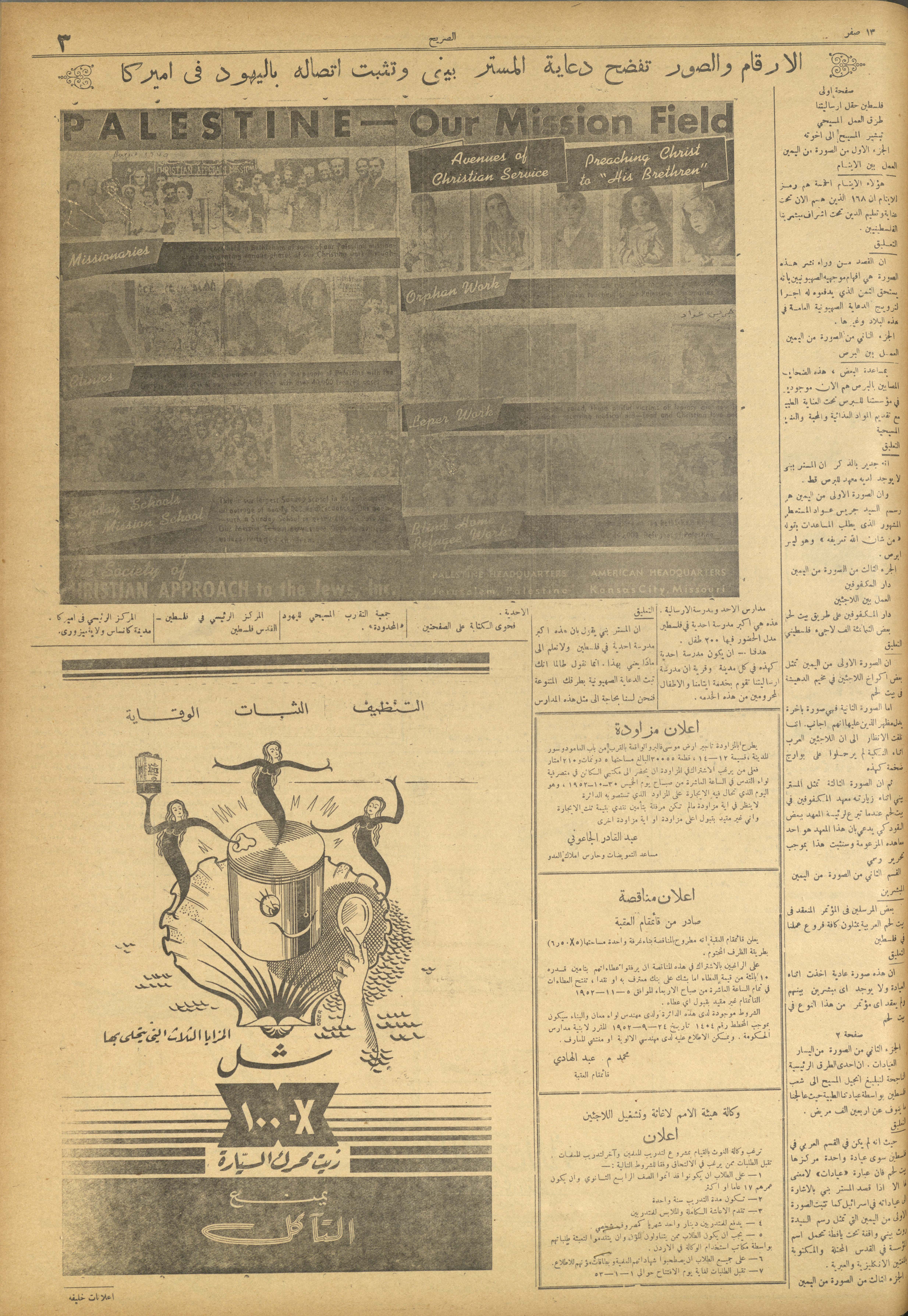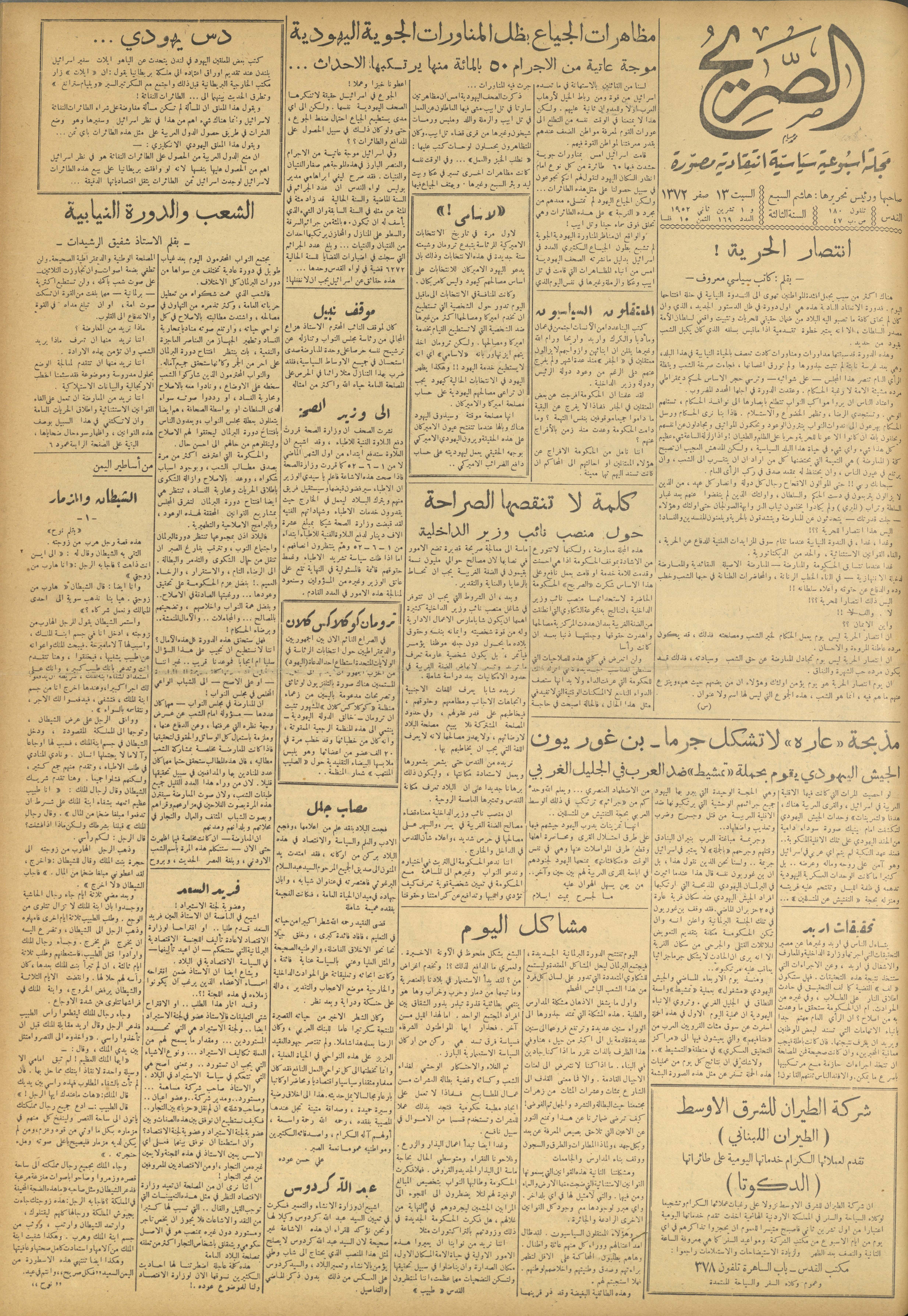 Printed in Arabic, this document shows issue no.169 of the al-Sarih weekly political critique Magazine, published by its owner and editor Hashim al-Saba' on 1 November 1952 and sold for 15 mils, the issue features many article critiques dealing with the political events of that period, including: - The Israeli Occupation show of sixty aeroplanes in manoeuvres in front of settlers in order to raise their morale. - The renewal of the constitution and the new parliamentary session. - The Israeli Occupation Forces (IOF) conducted search campaigns in Western Galilee under the pretext of searching for "infiltrators". - Exploitation of Palestinian refugee causes to collect donations by the United Nations (UN). - The trial of Muhammad Ibrahim al-Zangari from Shefa Amr by the Magistrate's Court on charges of entering the country illegally. - The opening of a Sunday school in Palestine, which al-Sareeh accuses of spreading Zionist propaganda.