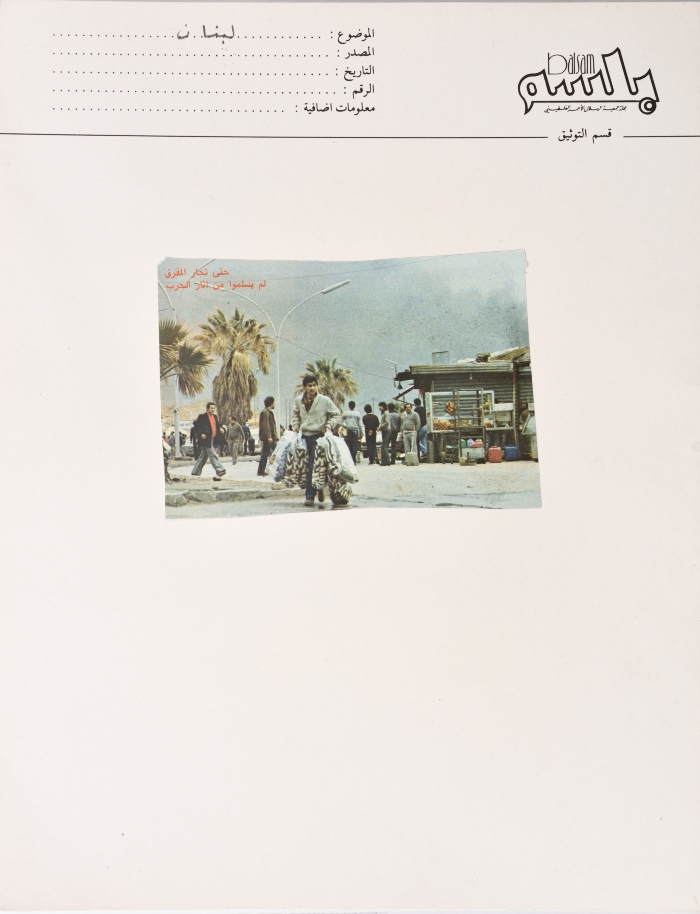 Taken in the 1980s, this photograph is pasted on the card of Balsam Magazine, affiliated with the Palestine Red Crescent Society (PRCS), and shows one of the retail traders on a street in Beirut