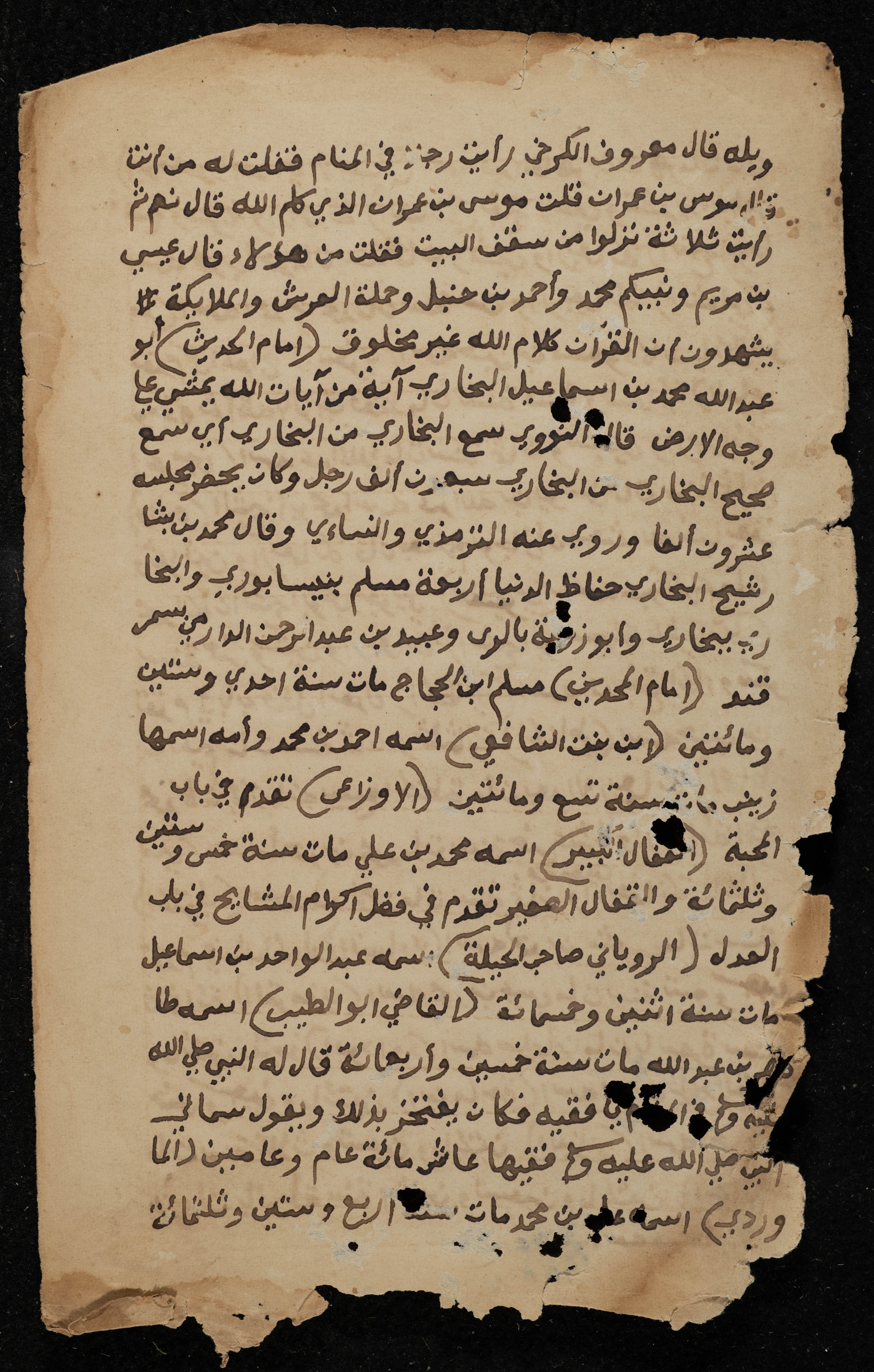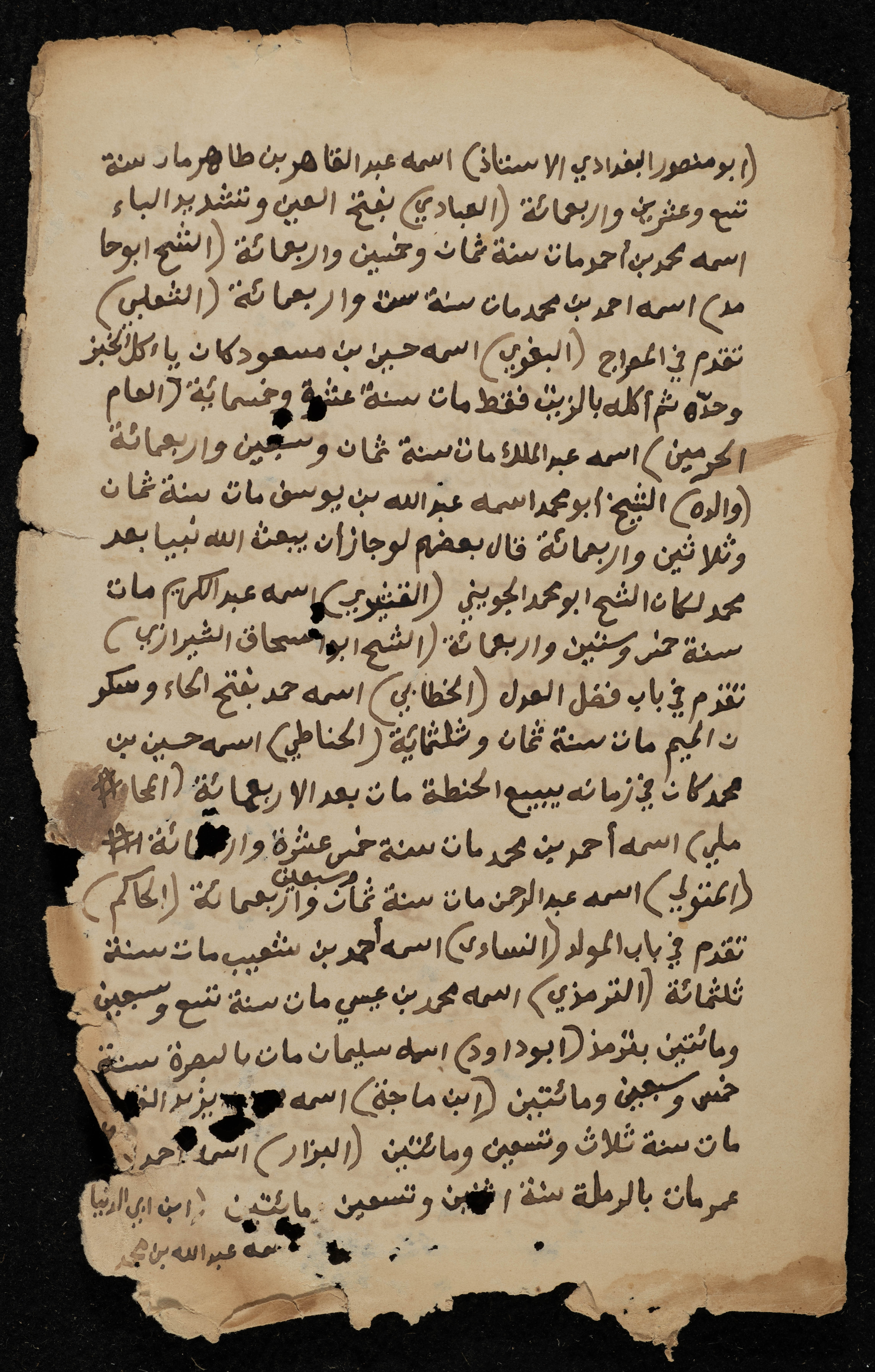 صفحتان من مخطوطة تعود إلى القرن الثامن عشر، تتناول الأحاديث النبوية، وتذكر أسماء وتواريخ ميلاد الأئمة الذين دونوا الحديث ونقلوه عن النبي محمد، مثل الشافعي، وابن ماجة، والنسائي، والبزار، والعبادي، والثعلبي، والخطابي.