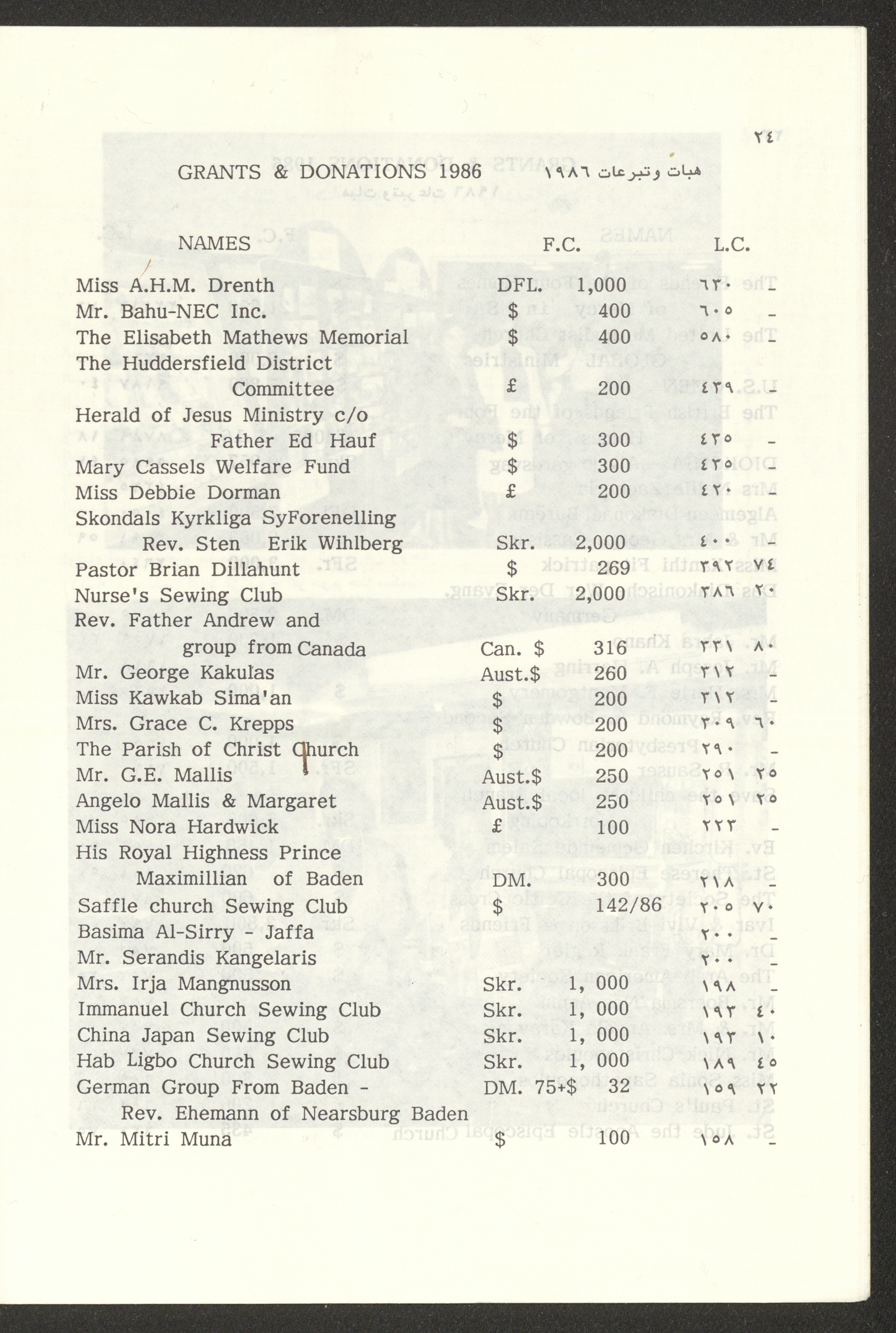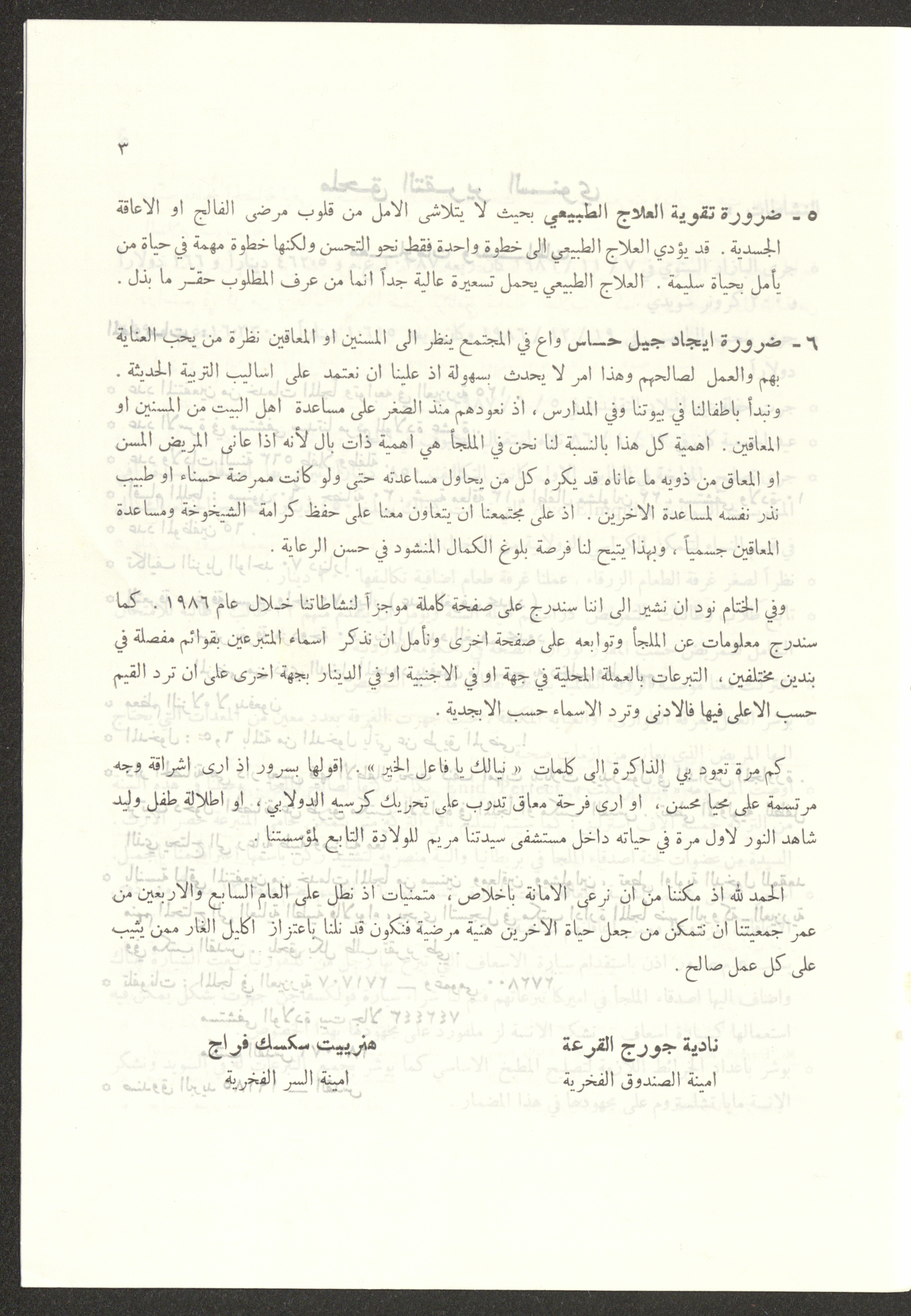 This archival item documents an annual report on the budget of the Orthodox Charitable Refuge Association for the Sick and the Paralyzed in Jerusalem for the year 1986, which includes a presentation of the budget of the Refuge and its activities during 1986 with the budget of each activity. It also mentions the names of the women who are members of the general committee outside the country, members of the administrative board and heads of departments in the Refuge and its institutions, in addition to the names of the doctors at the Refuge and its needs for the year 1987.