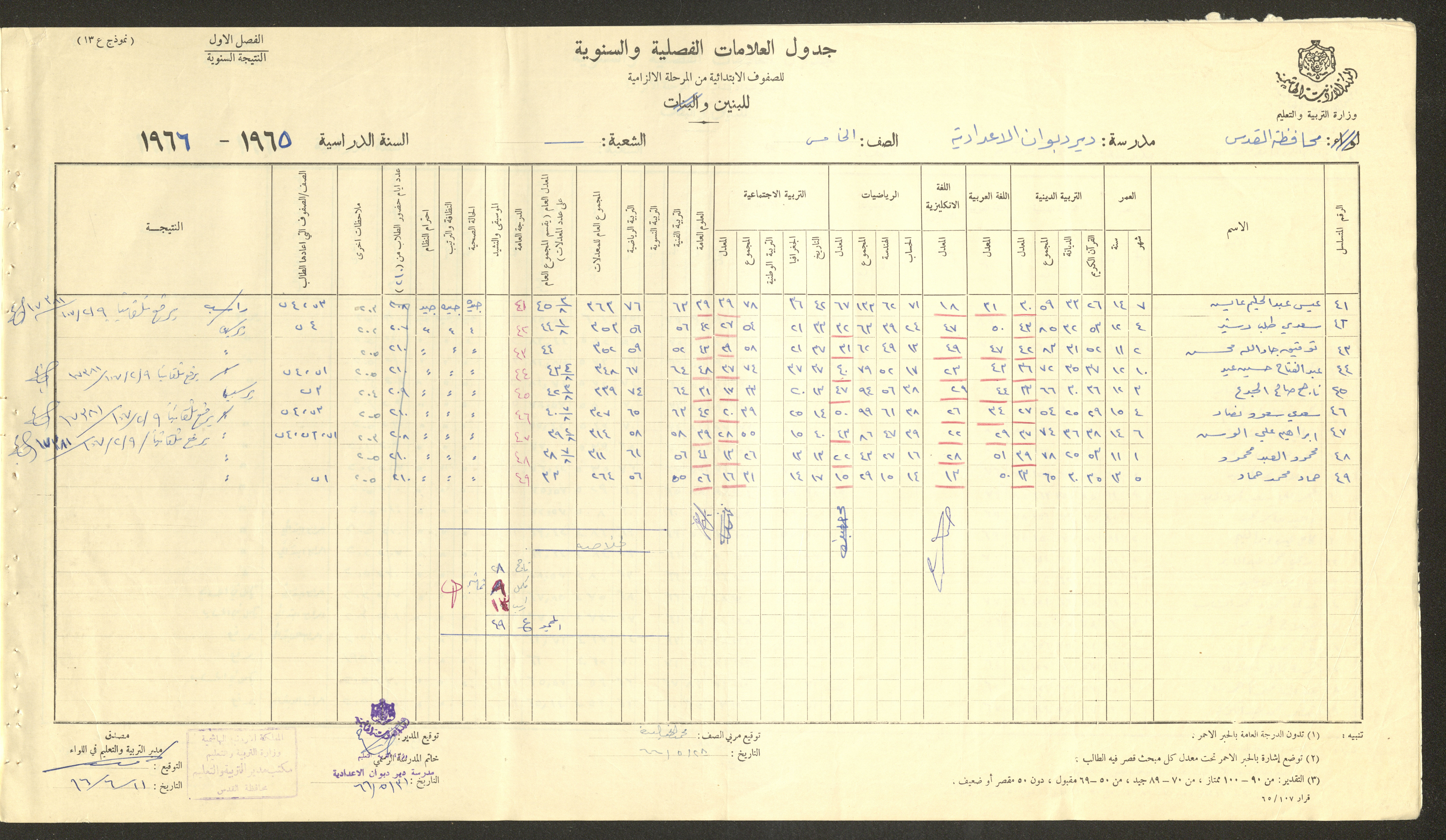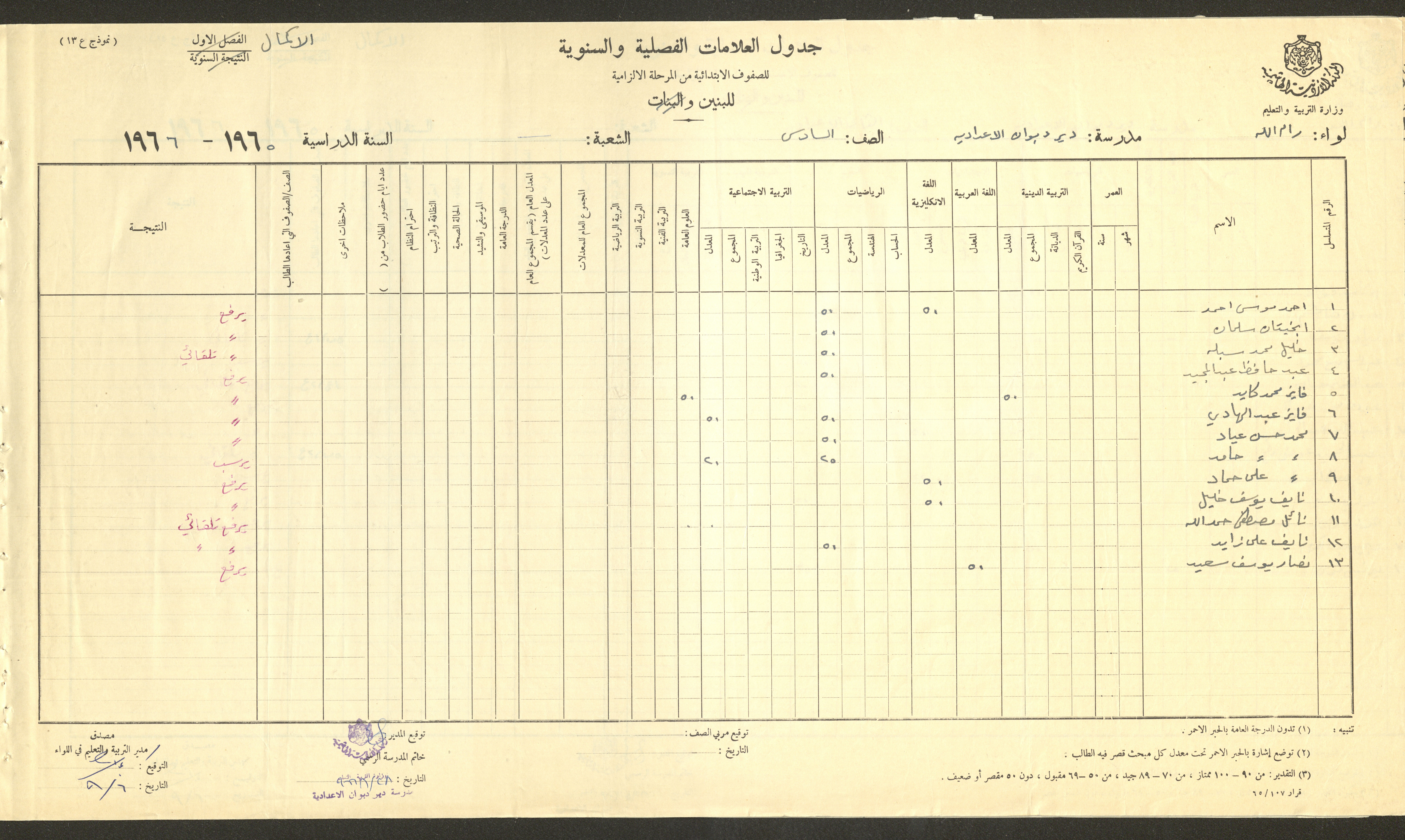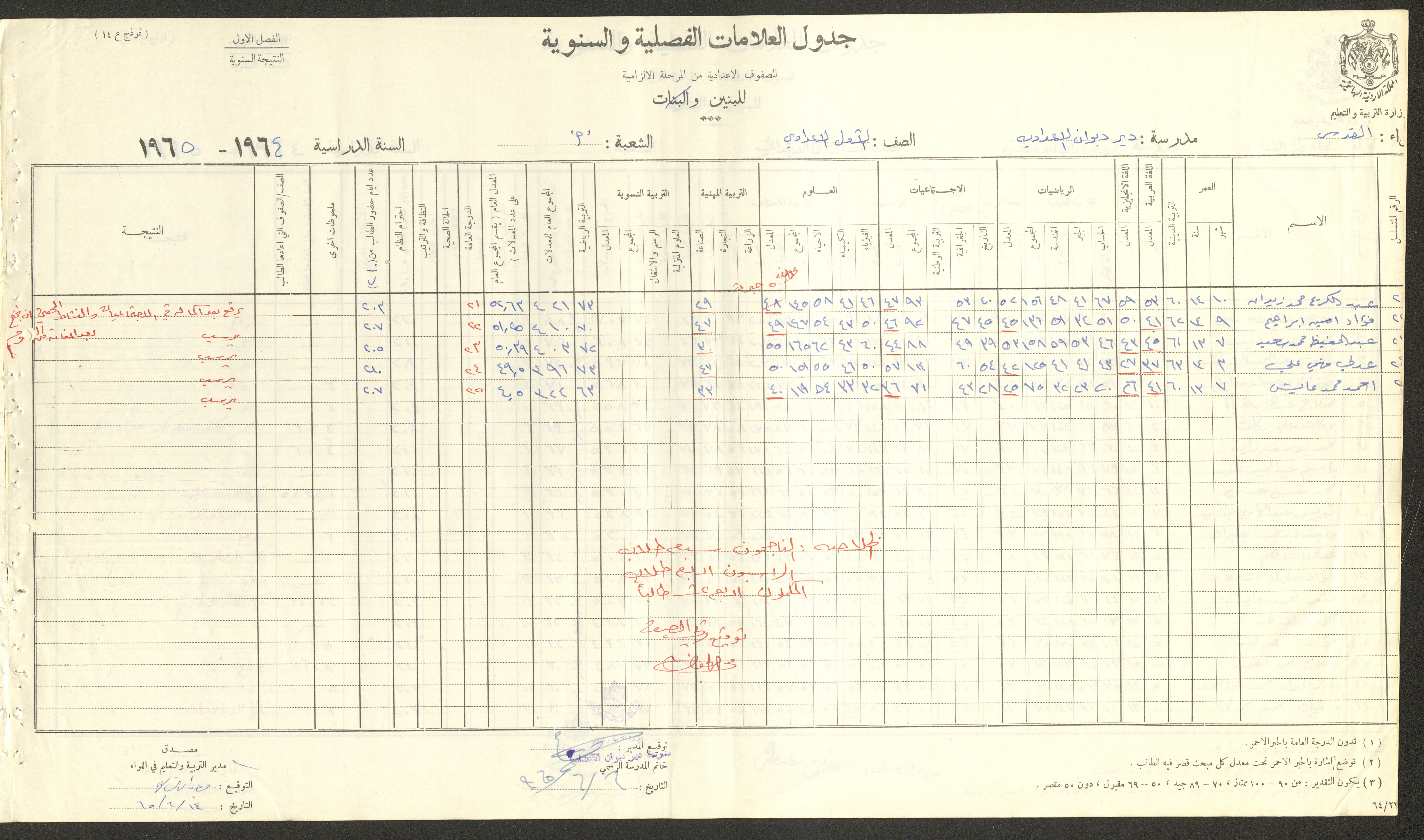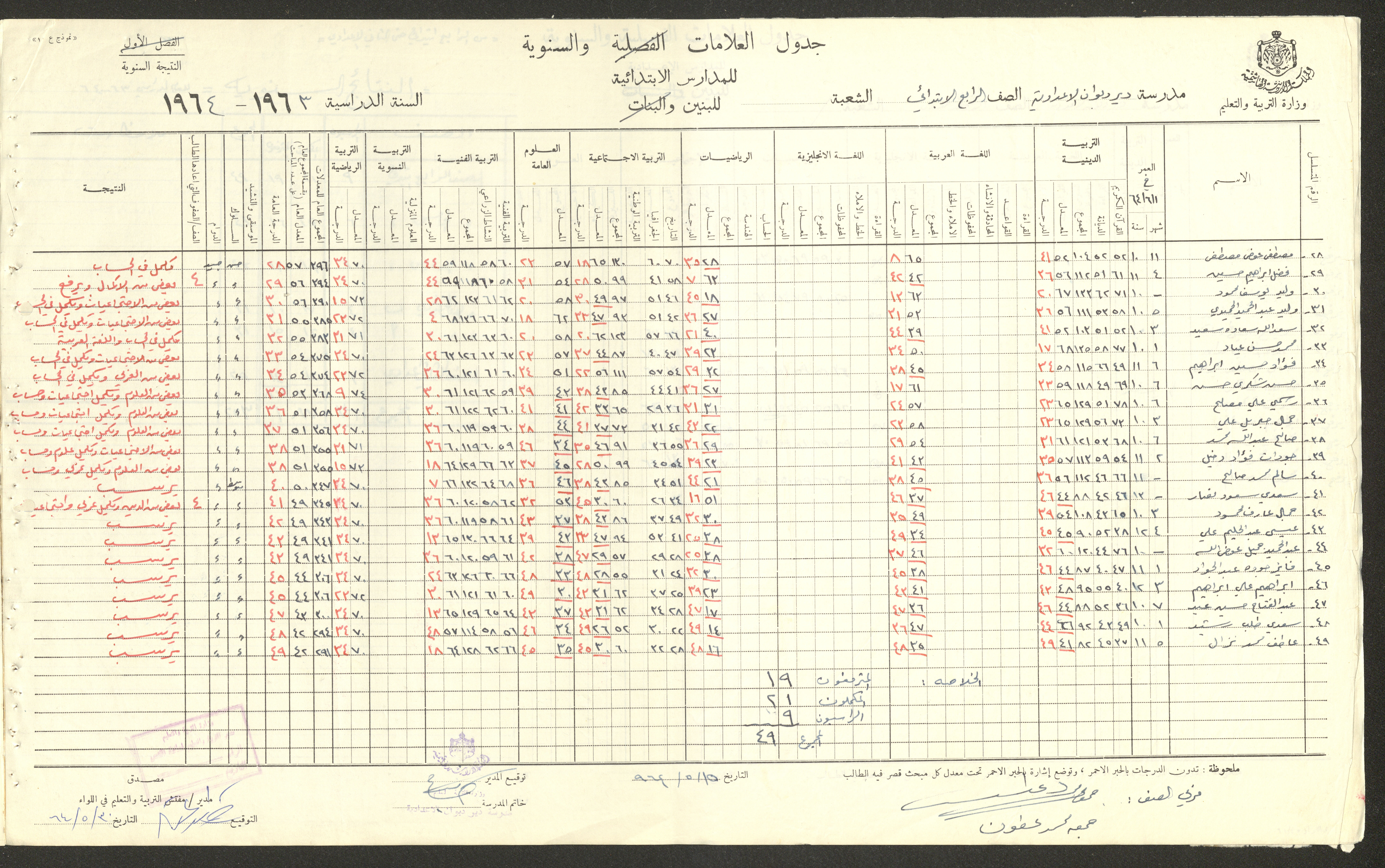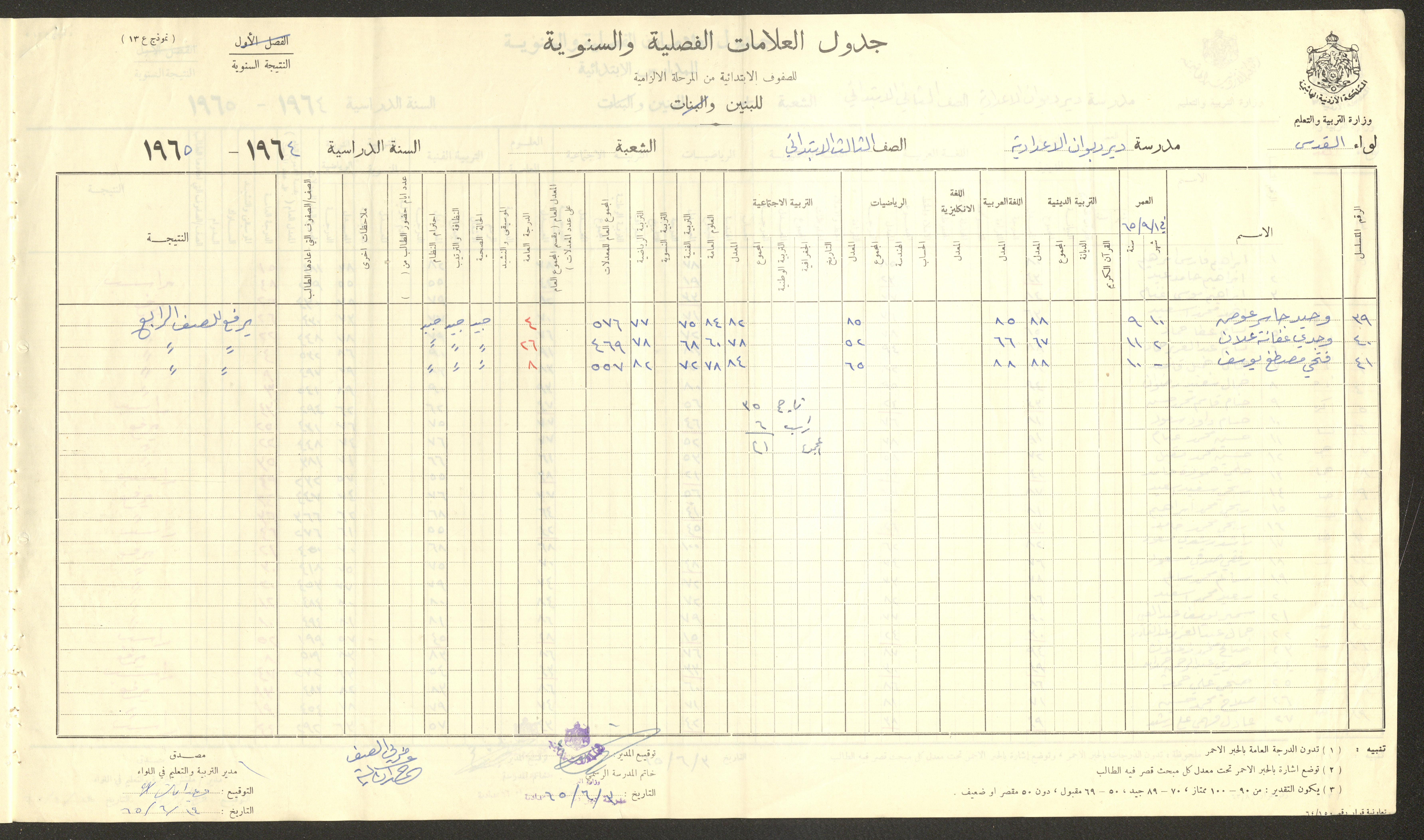 Students Marks Sheets, Deir Dibwan School, 1962-65