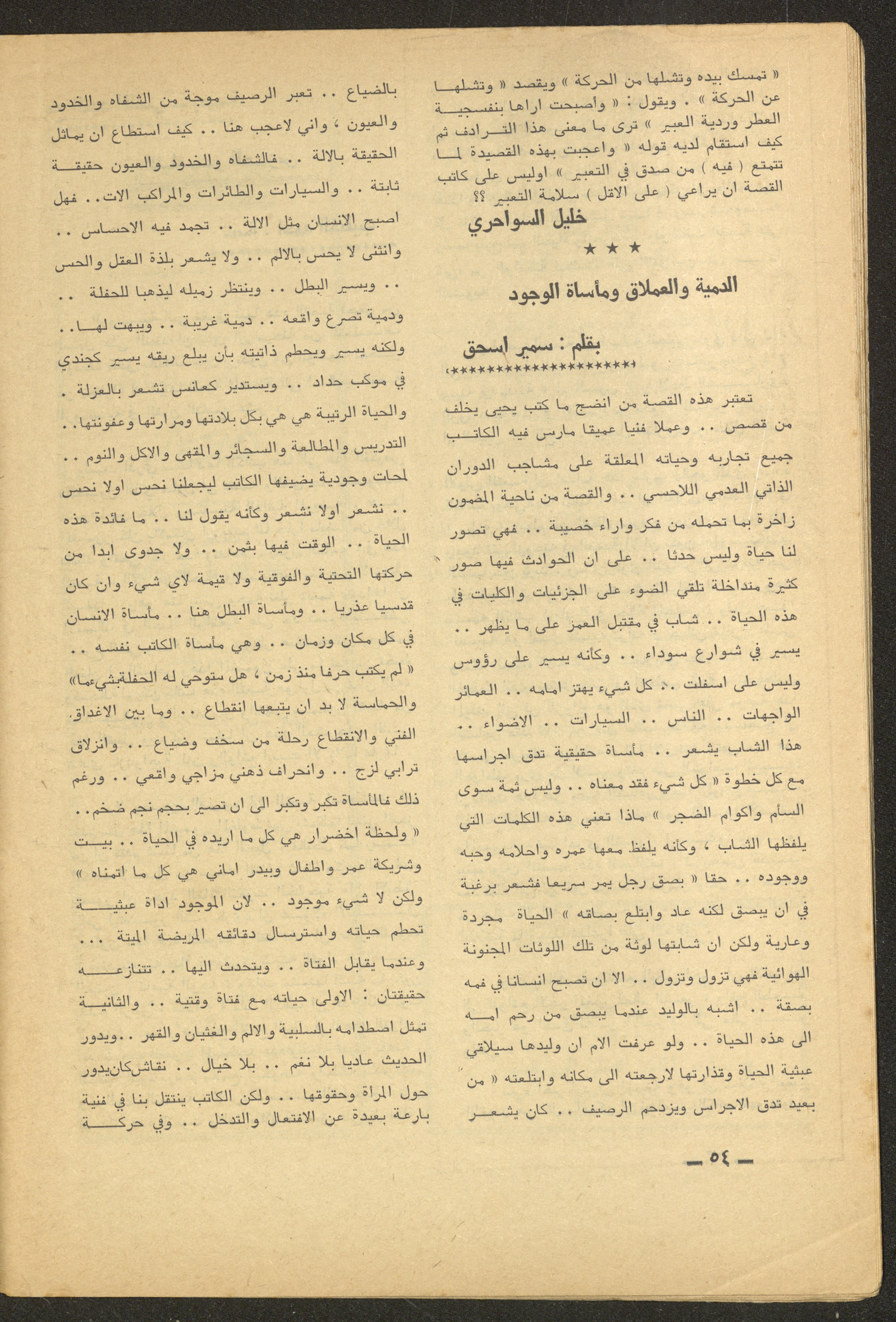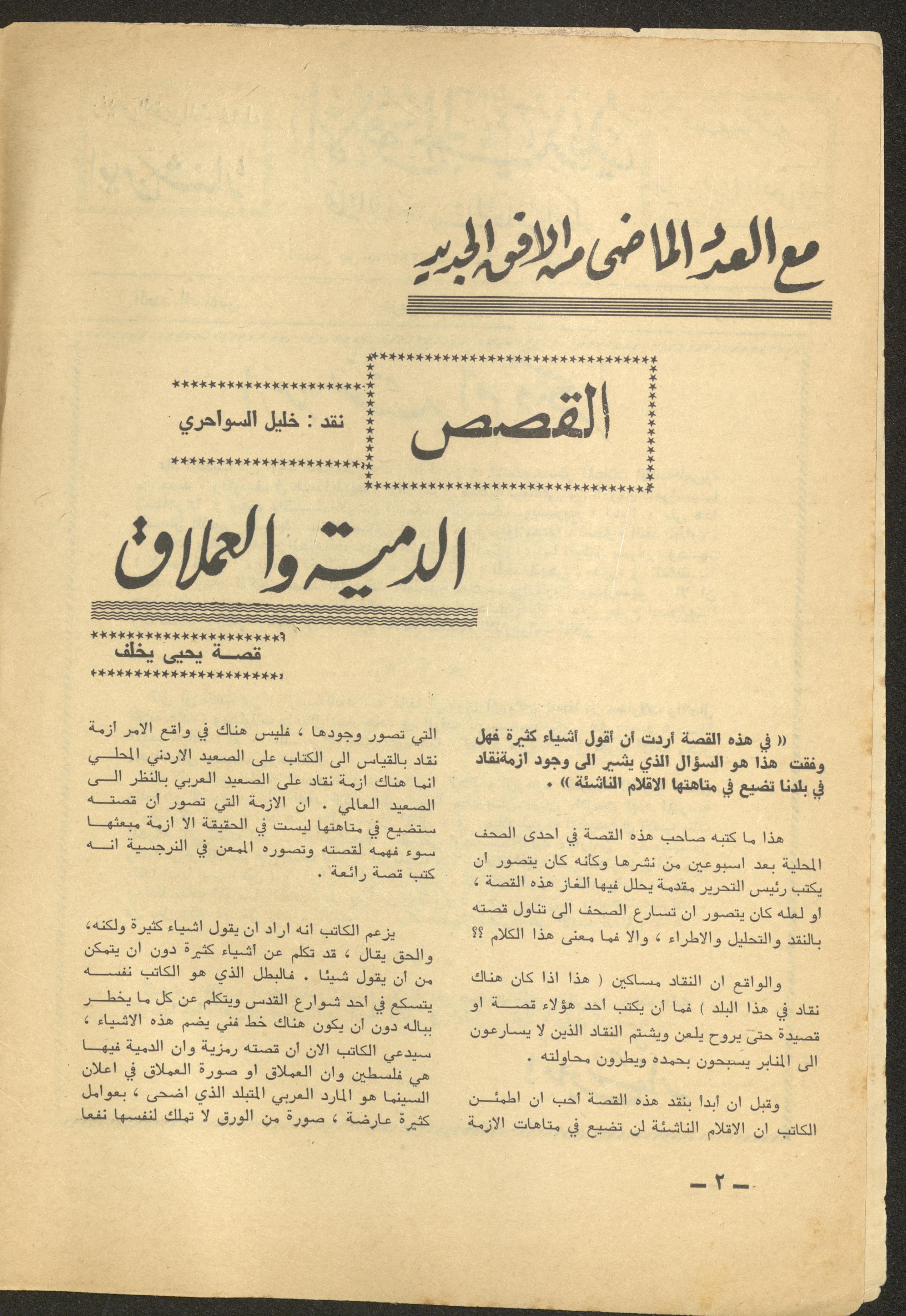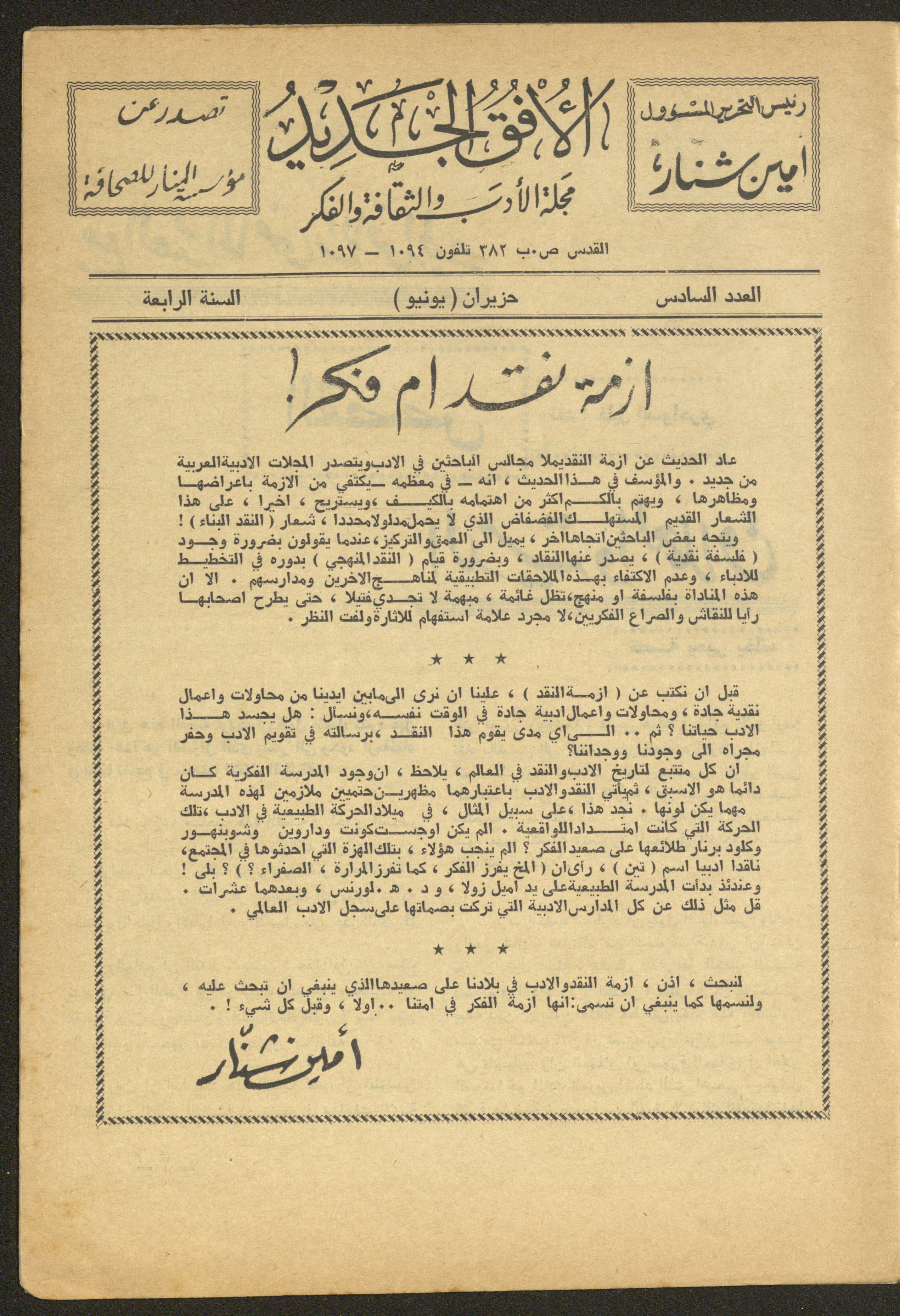 Issued by al-Manar Press Foundation in June 1965 and printed in Arabic, this 58-page document shows the 6th issue of al-Ofuq al-Jadeed Magazine issued, which is a monthly magazine concerned with literature, culture and thought, under the supervision of Editor-in-Chief Amin Shannar, and was printed in Dar al-Manar Press in Jerusalem. The price of the issue amounted to 60 fils and included photographs, articles, research, poems and stories, including: - "Crisis of Criticism or Thought", an article by Amin Shinnar. - "Resala Ela Sukrat (A Letter to Socrates)", a poem by Muhammad al-Jayyar. - "The First Day", a story by Yahya Yakhlaf. - "The Contemporary Existential Hero", research by Muhammad abu Hantash. - "Ath-Thel (The Shadow)", a poem by Malak Abdel-Aziz. - "Something on the Roof", a story by Nimr Sarhan.