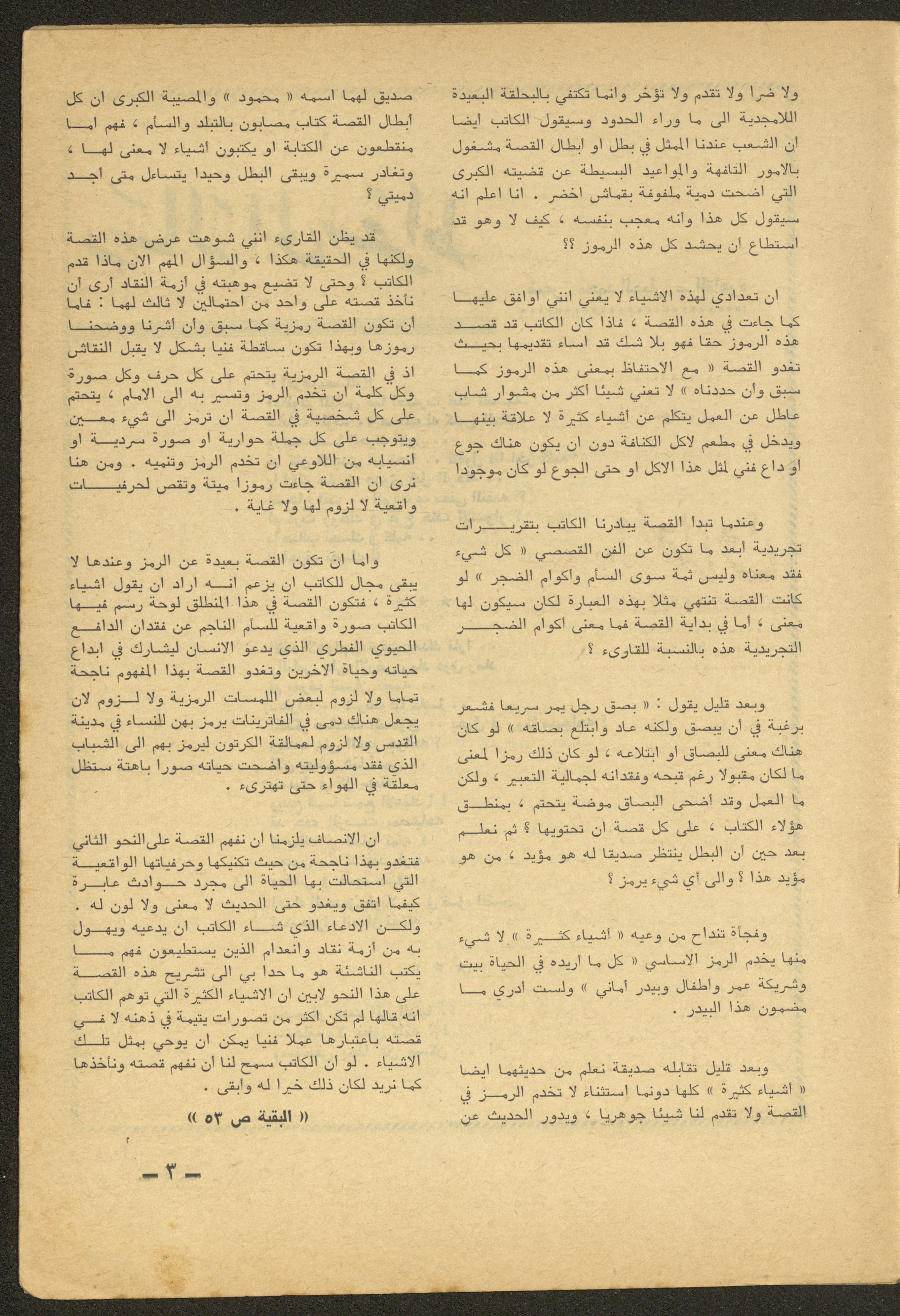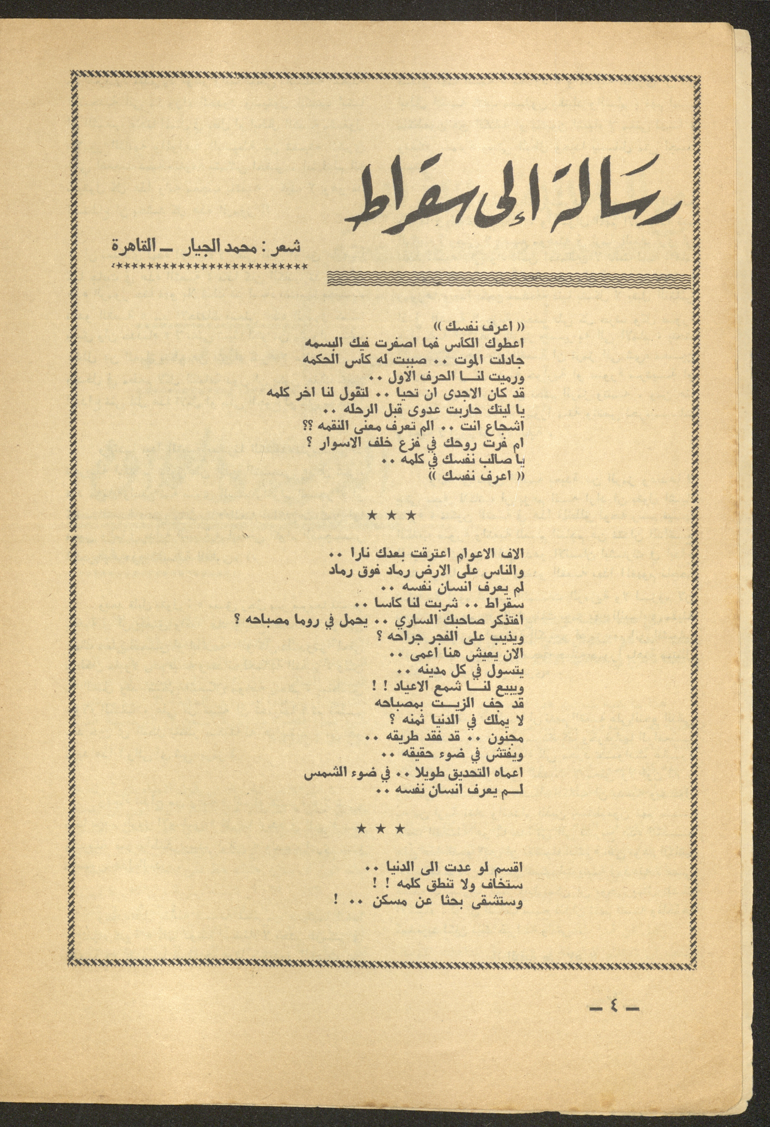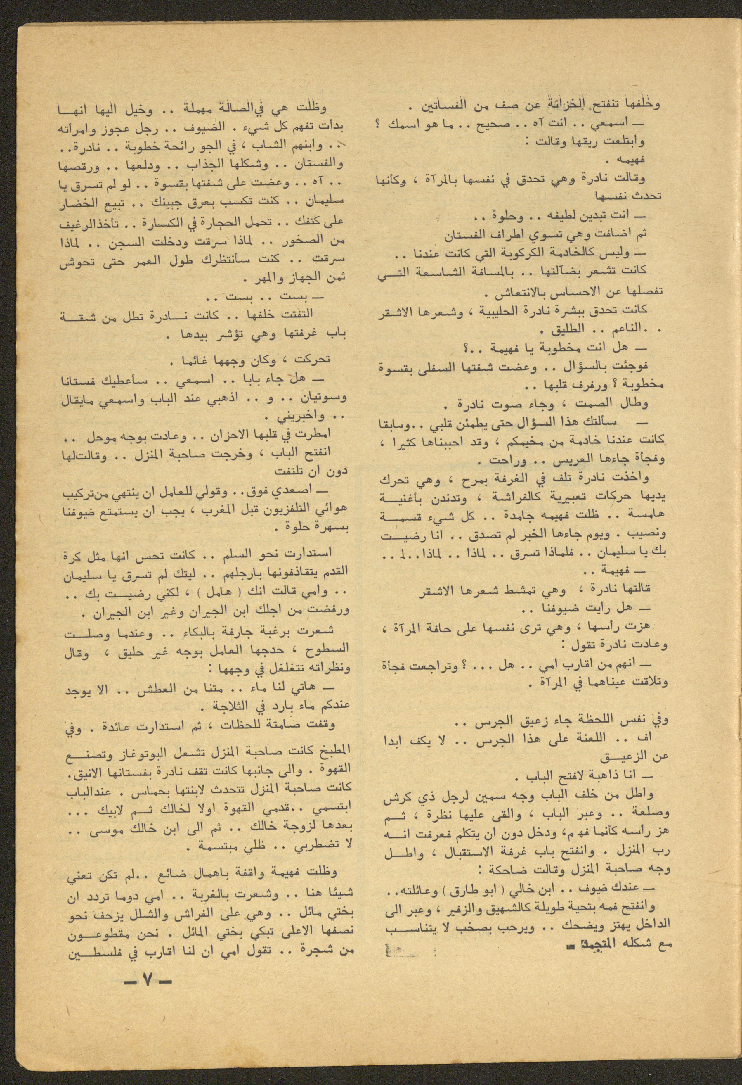 Issued by al-Manar Press Foundation in June 1965 and printed in Arabic, this 58-page document shows the 6th issue of al-Ofuq al-Jadeed Magazine issued, which is a monthly magazine concerned with literature, culture and thought, under the supervision of Editor-in-Chief Amin Shannar, and was printed in Dar al-Manar Press in Jerusalem. The price of the issue amounted to 60 fils and included photographs, articles, research, poems and stories, including: - "Crisis of Criticism or Thought", an article by Amin Shinnar. - "Resala Ela Sukrat (A Letter to Socrates)", a poem by Muhammad al-Jayyar. - "The First Day", a story by Yahya Yakhlaf. - "The Contemporary Existential Hero", research by Muhammad abu Hantash. - "Ath-Thel (The Shadow)", a poem by Malak Abdel-Aziz. - "Something on the Roof", a story by Nimr Sarhan.