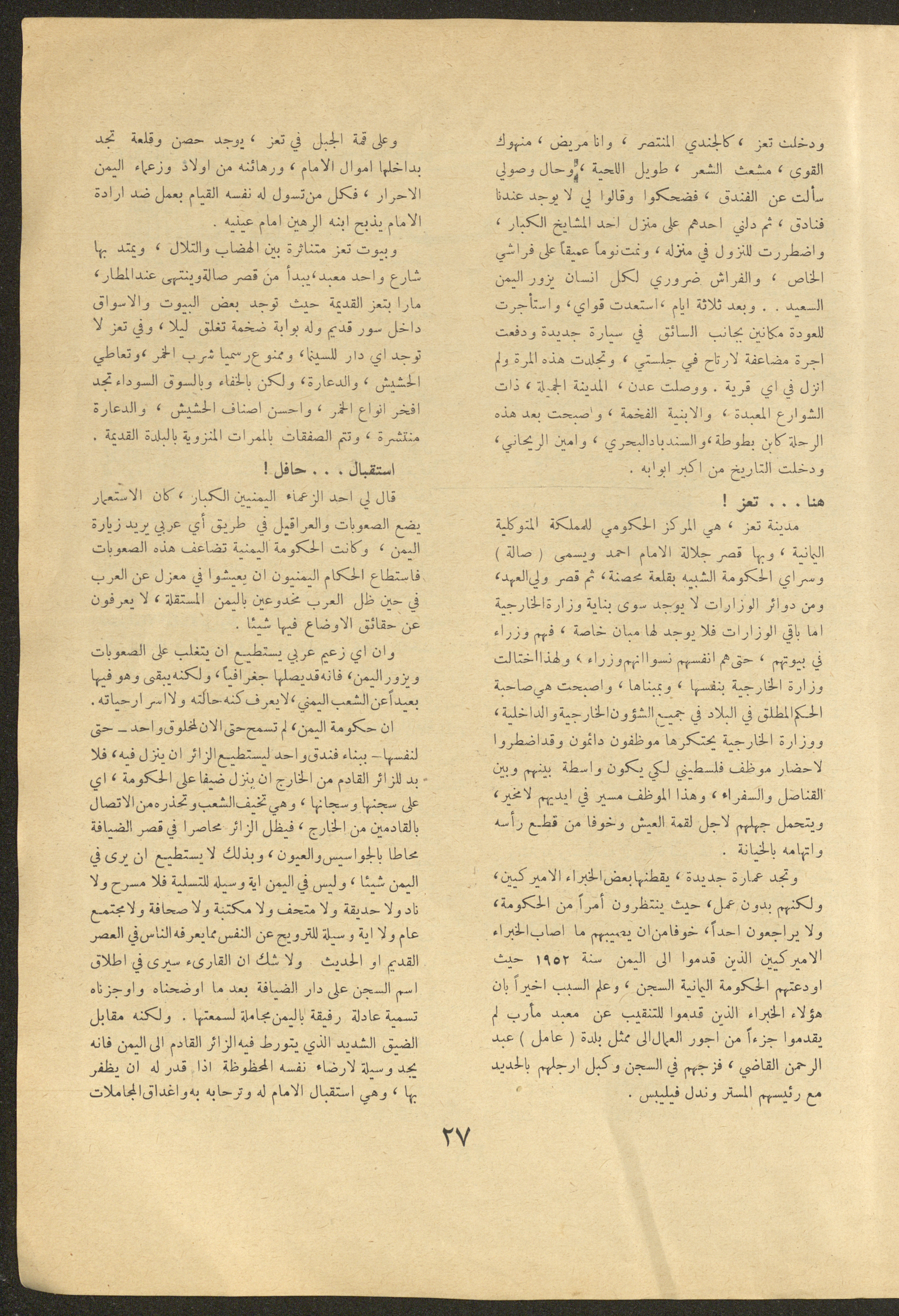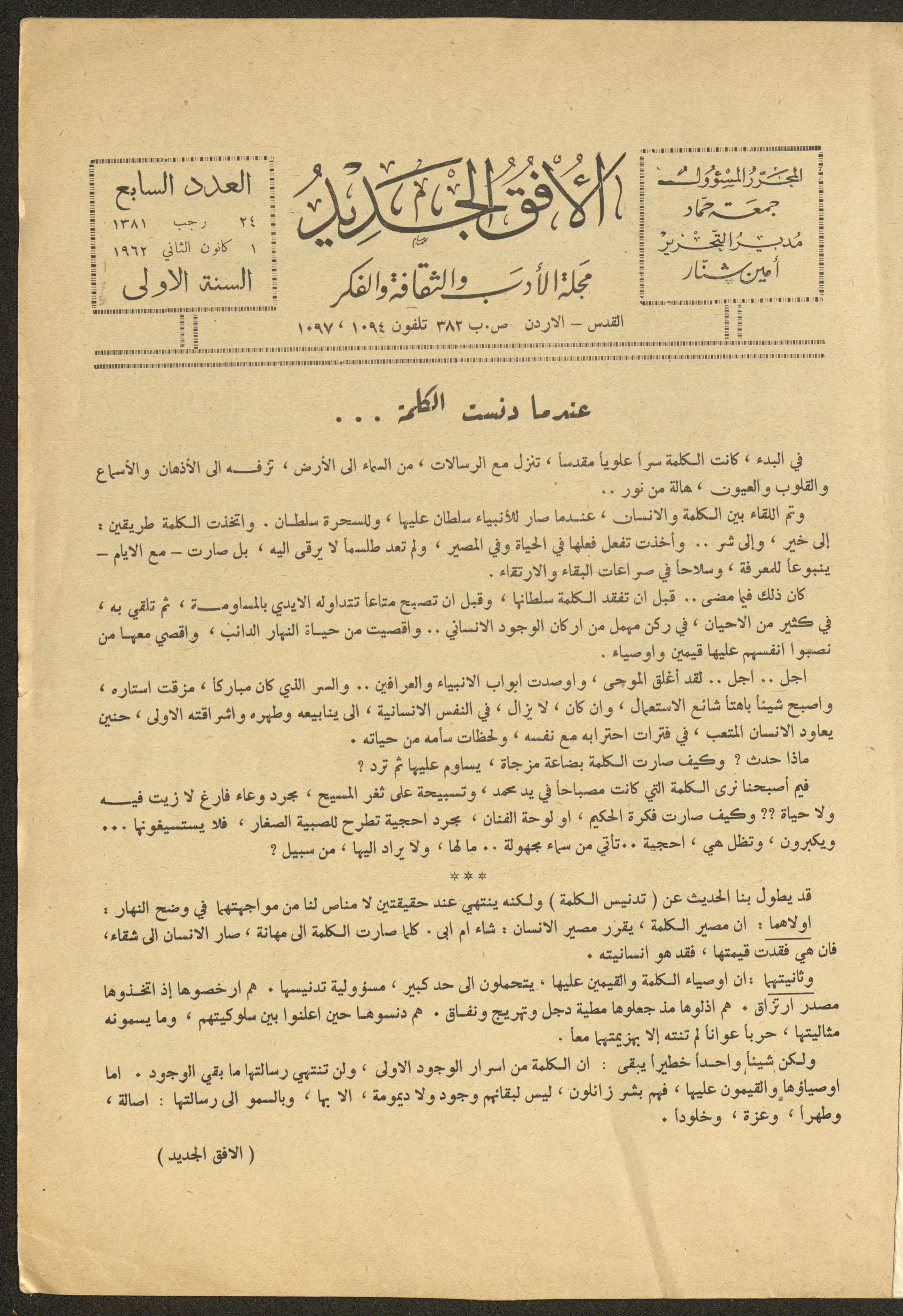 Issued by al-Manar Press Foundation in January 1962 and printed in Arabic, this 58-page document shows the 7th issue of al-Ofuq al-Jadeed Magazine, which is a monthly magazine concerned with literature, culture and thought, under the supervision of Editor-in-Chief Amin Shannar, and was printed in Dar al-Manar Press in Jerusalem. The price of the issue amounted to 60 fils and included photographs, articles, research, poems and stories, including: - "Big Eyes", an article by Abderrahim Badr. - "Islam and Sexual Education", Wajih Zain al-Abidin. - "Literature, Language and Letters", an article by Ibrahim Madkour. - "Leman Taqra al-Ajras (For Whom the Bell Tolls)", a poem by Abderrahim Omar. - "Bait al-Maqdis", Amin Shinnar. - "Zeina", a story by Sobhi Shahrouri. - "The Defeated", a story by Zahia.
