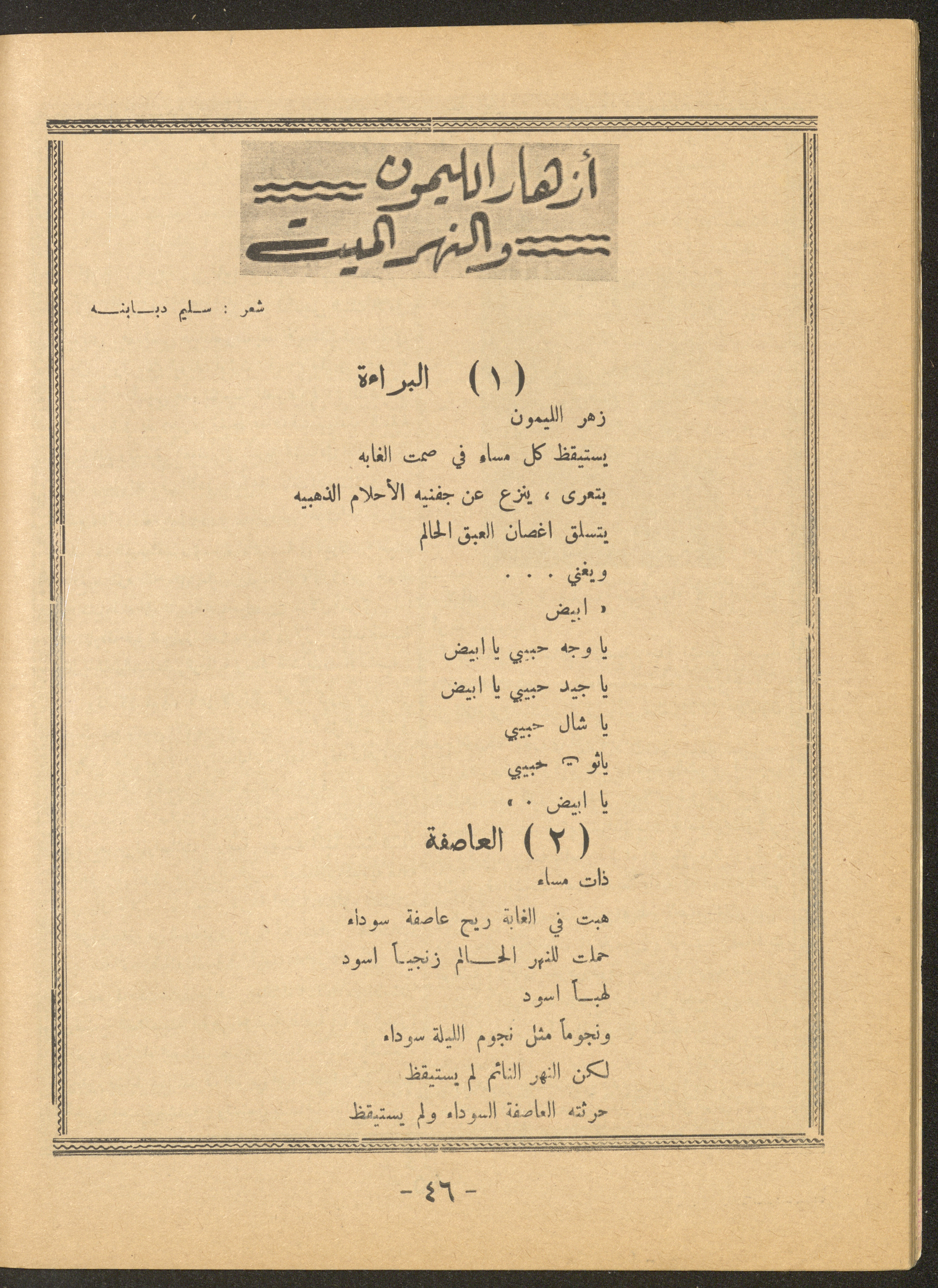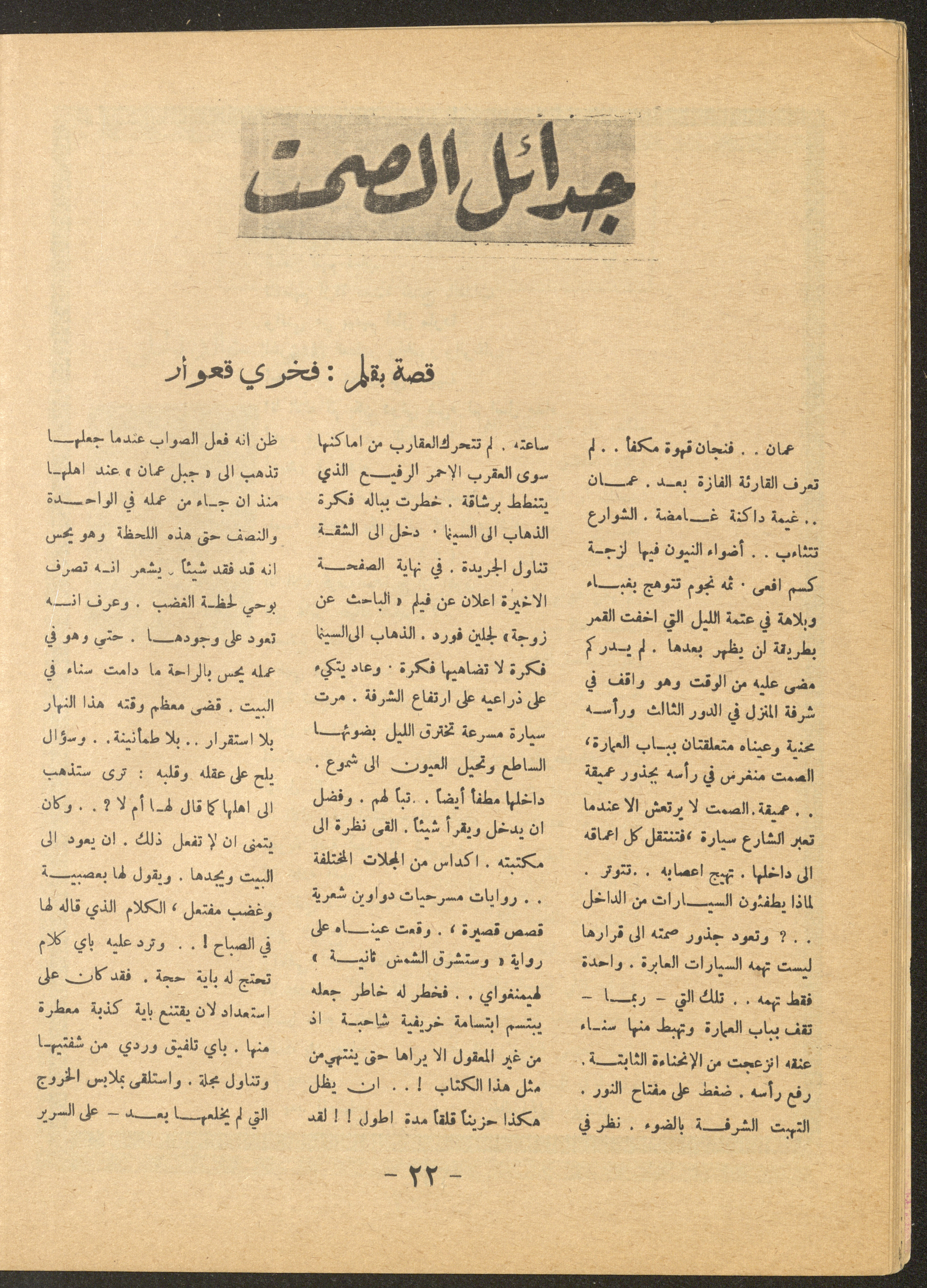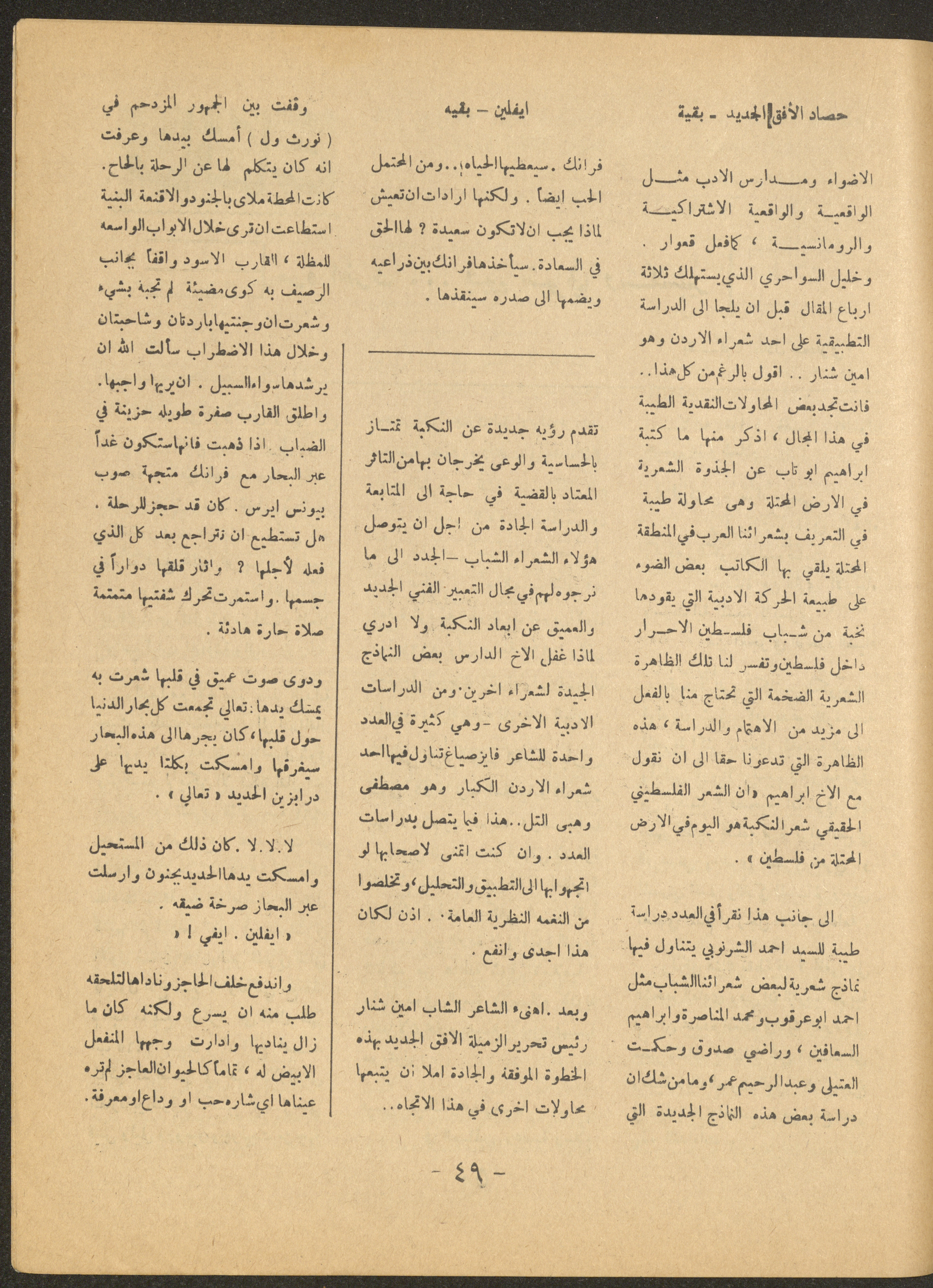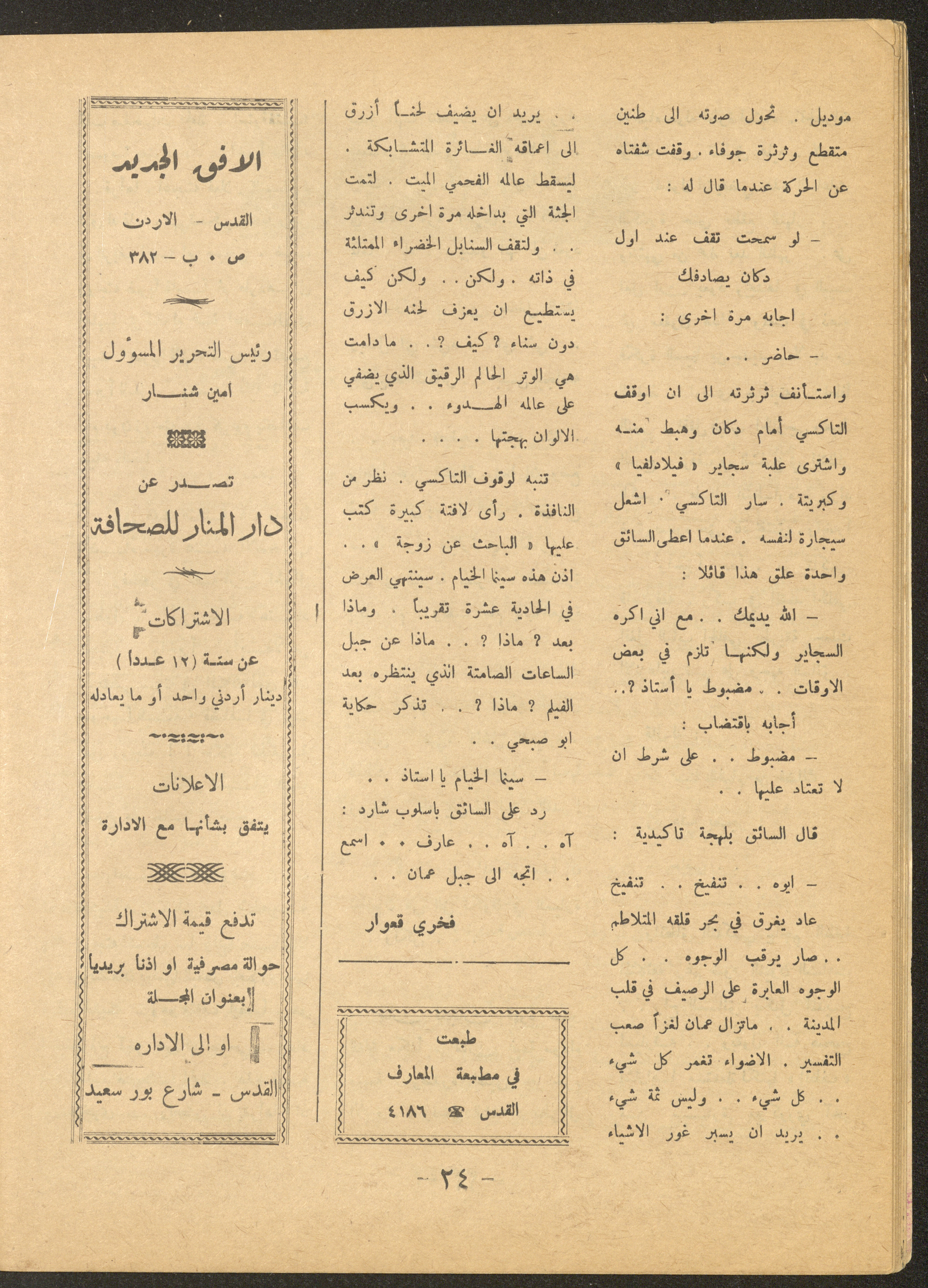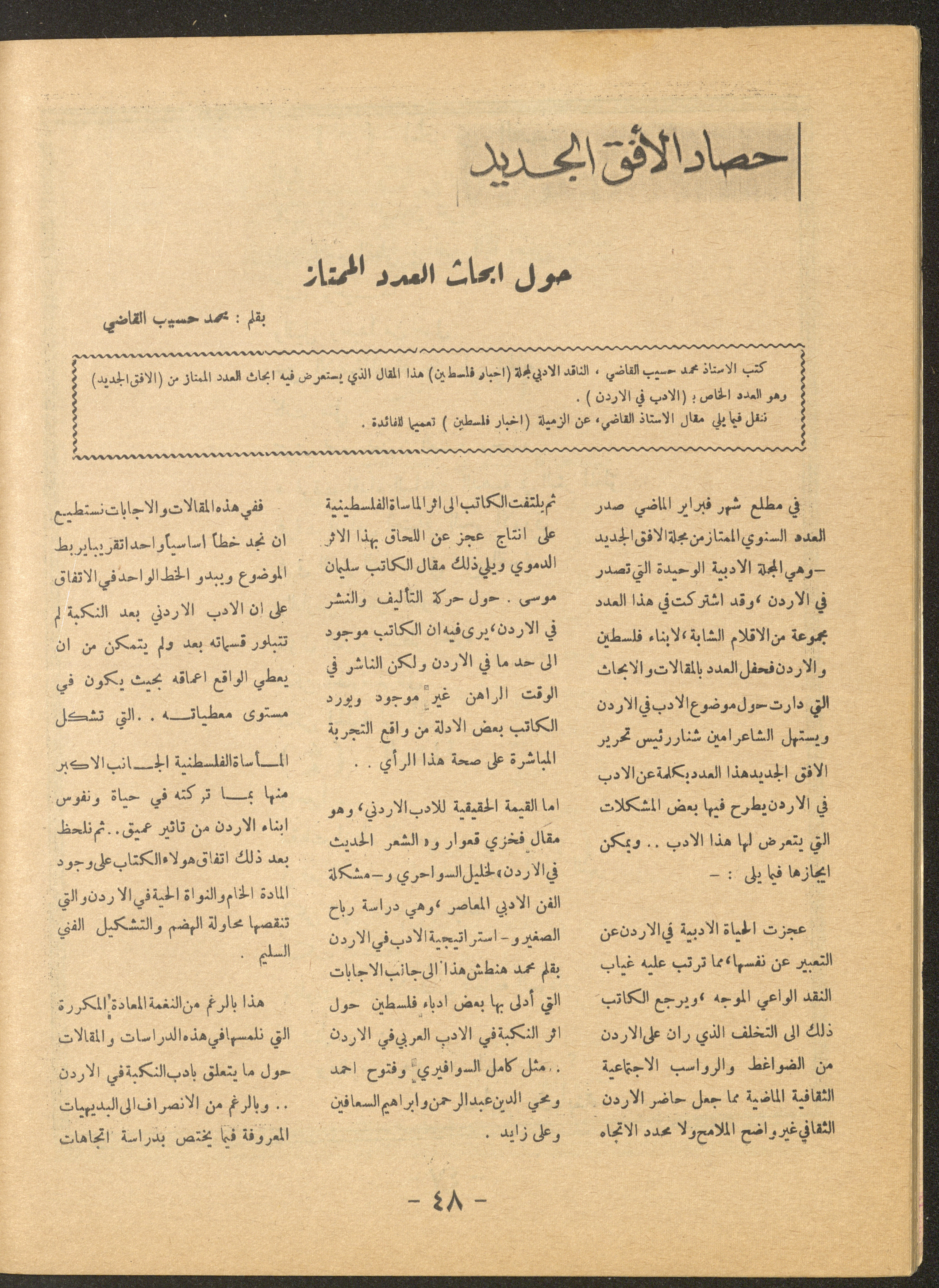 Issued by al-Manar Press Foundation in May 1966 and printed in Arabic, this 58-page document shows the 4th issue of al-Ofuq al-Jadeed Magazine, which is a monthly magazine concerned with literature, culture and thought, under the supervision of Editor-in-Chief Amin Shannar, and was printed in Dar al-Manar Press in Jerusalem. The price of the issue amounted to 60 fils and included photographs, articles, research, poems and stories, including: - "False Death Announcements", an article by Amin Shinnar. - "Mata Tushreqo ash-Shams (When Will the Sun Rise)", a poem by Saeed Taym. - "Kalematon Lerrih (Words for the Wind)", a poem by Abderrahim Ghneim. - "Studies in Theatre", research by Shaker an-Nabulsi. - "At-Tin Was-Samt (Mud and Silence), a poem by Radi Sdouq. - "The Braids of Silence", a story by Fakhri Kawar. - "Bashar bin Burd", research by Hamid Heddo. - "The Weakest Faith (The Bare Minimum)", a story by Nimr Sarhan.