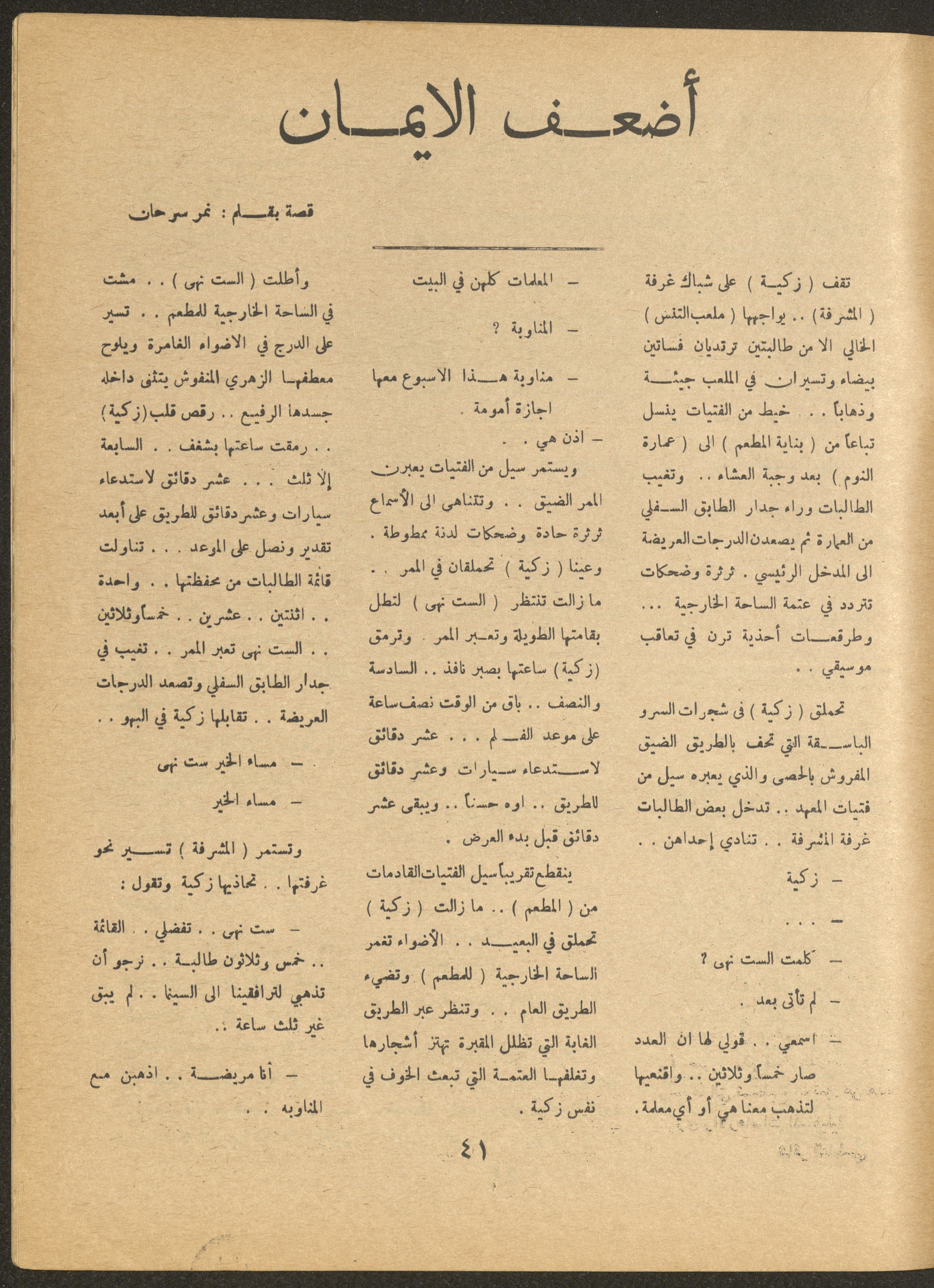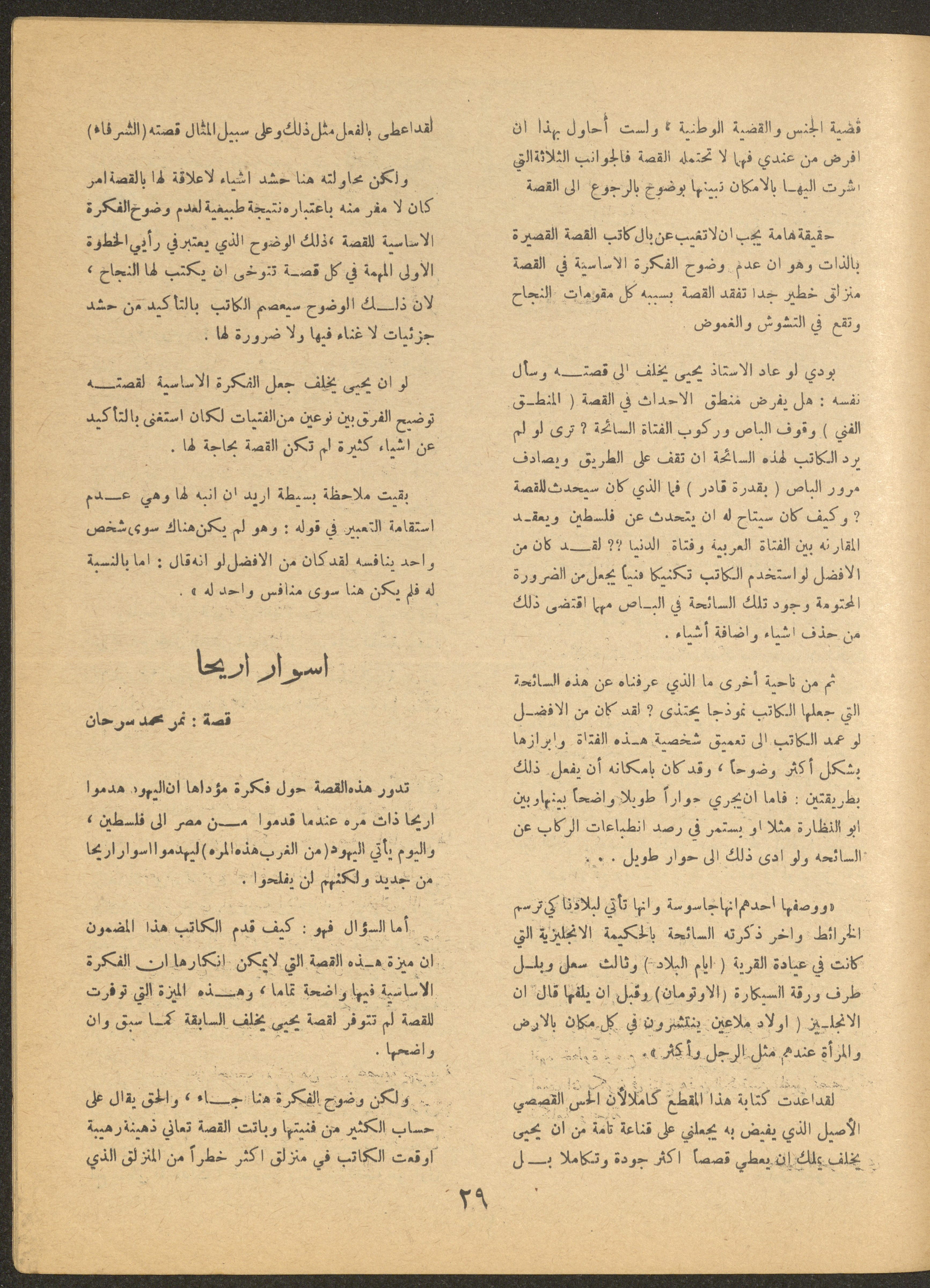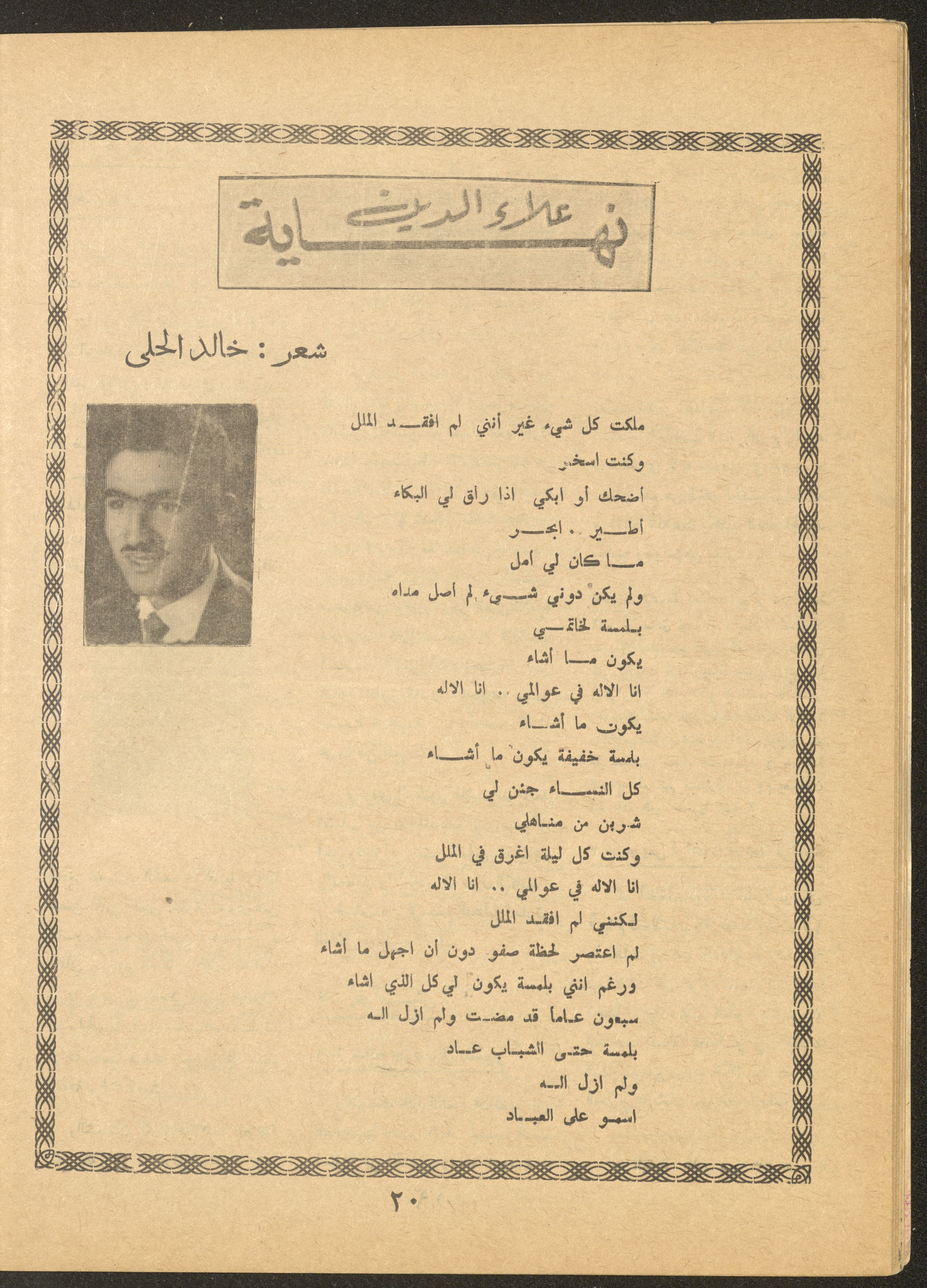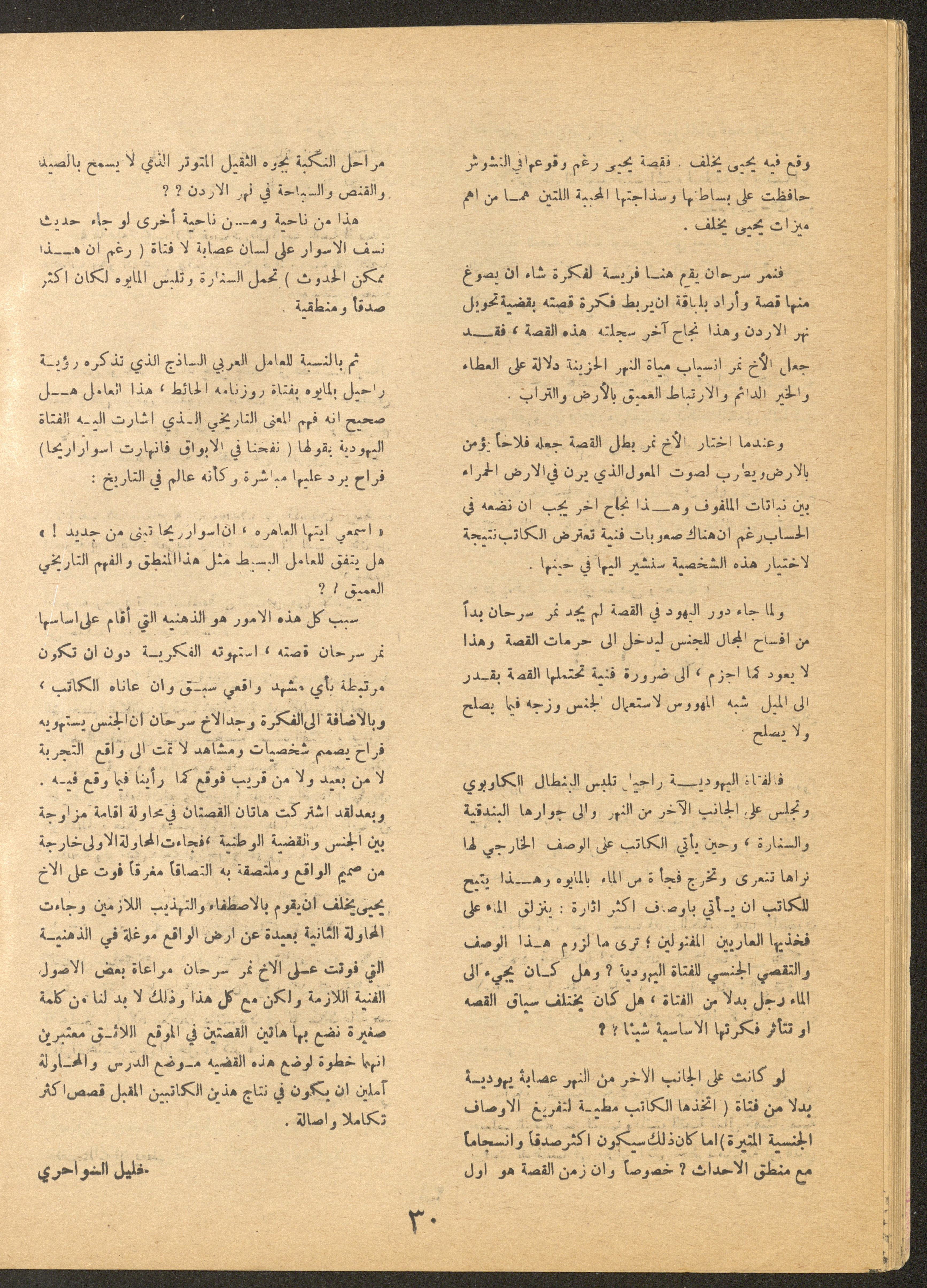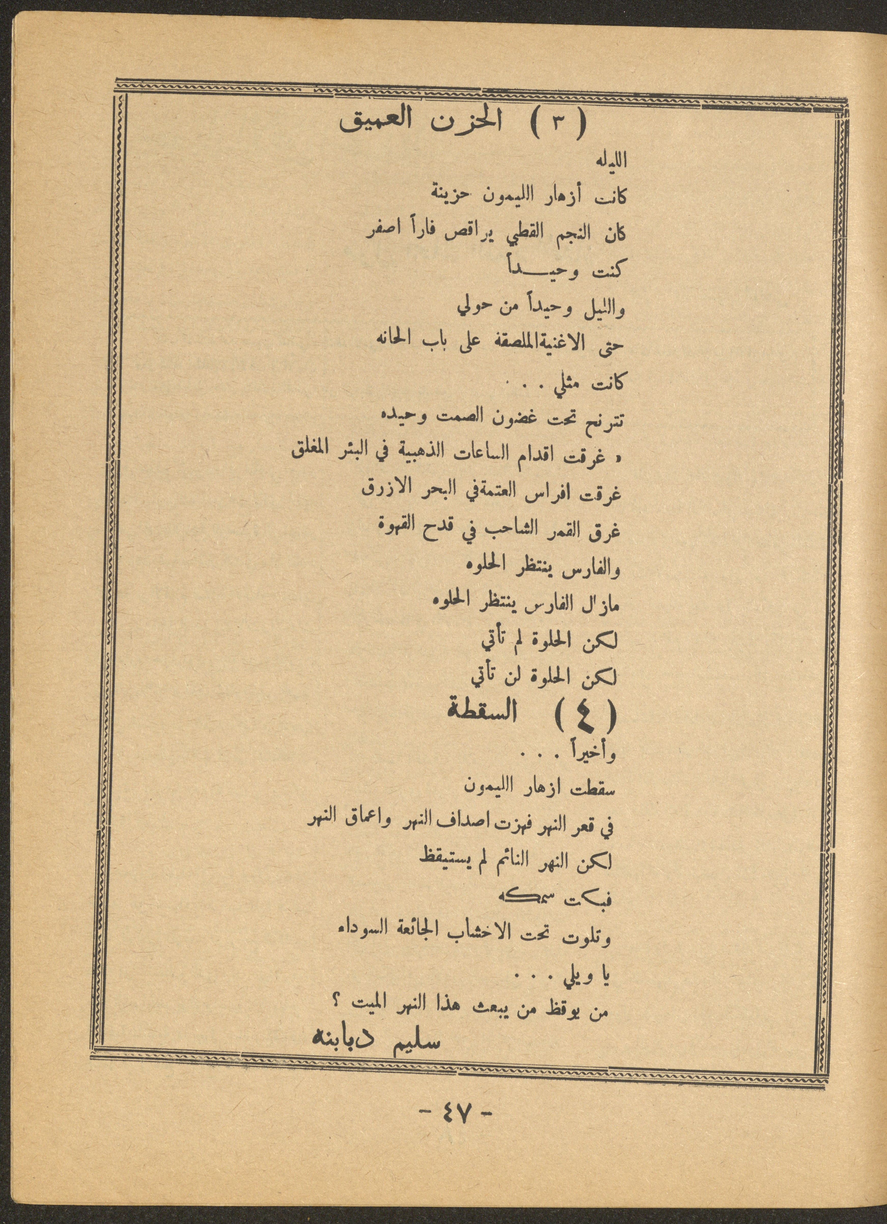 Issued by al-Manar Press Foundation in May 1966 and printed in Arabic, this 58-page document shows the 4th issue of al-Ofuq al-Jadeed Magazine, which is a monthly magazine concerned with literature, culture and thought, under the supervision of Editor-in-Chief Amin Shannar, and was printed in Dar al-Manar Press in Jerusalem. The price of the issue amounted to 60 fils and included photographs, articles, research, poems and stories, including: - "False Death Announcements", an article by Amin Shinnar. - "Mata Tushreqo ash-Shams (When Will the Sun Rise)", a poem by Saeed Taym. - "Kalematon Lerrih (Words for the Wind)", a poem by Abderrahim Ghneim. - "Studies in Theatre", research by Shaker an-Nabulsi. - "At-Tin Was-Samt (Mud and Silence), a poem by Radi Sdouq. - "The Braids of Silence", a story by Fakhri Kawar. - "Bashar bin Burd", research by Hamid Heddo. - "The Weakest Faith (The Bare Minimum)", a story by Nimr Sarhan.