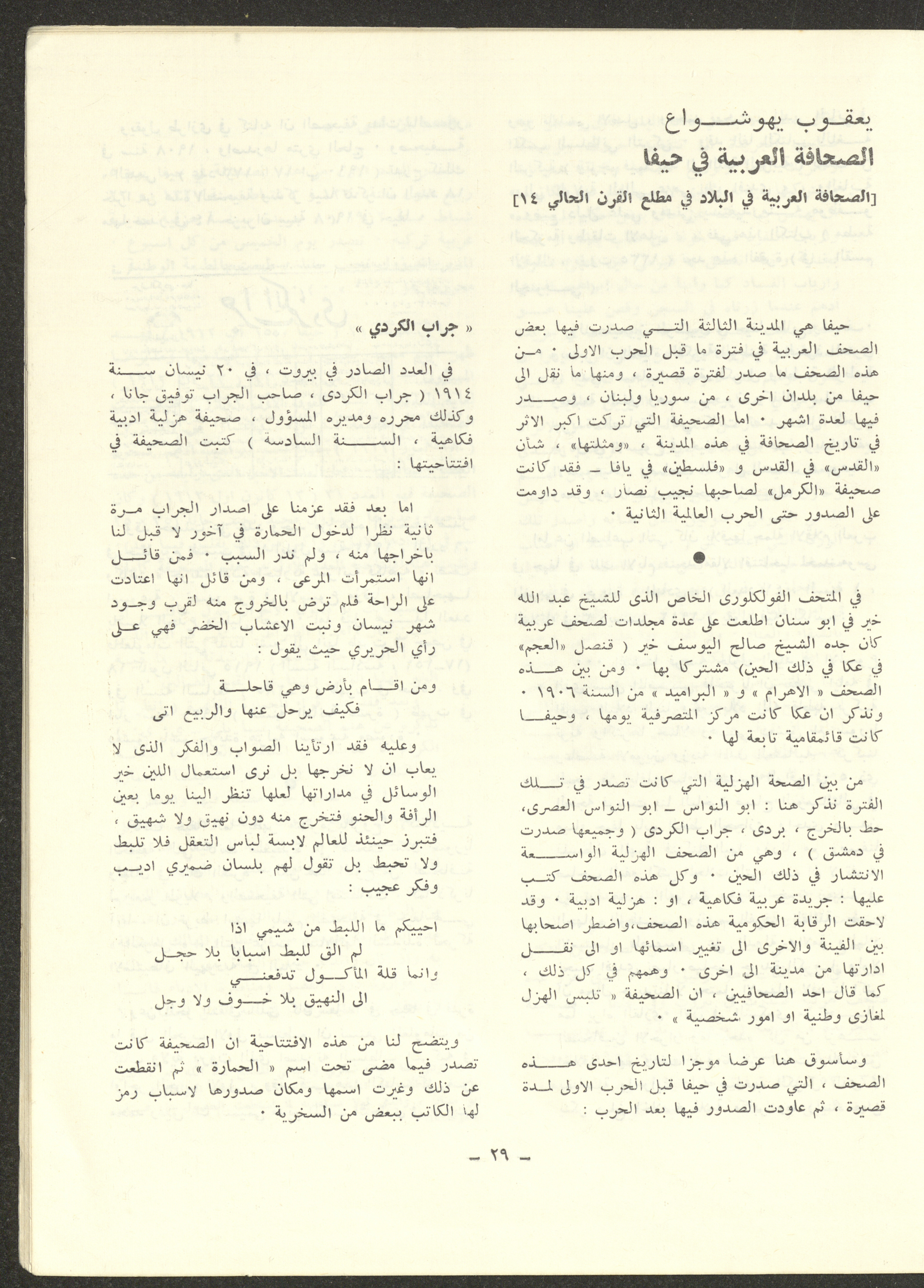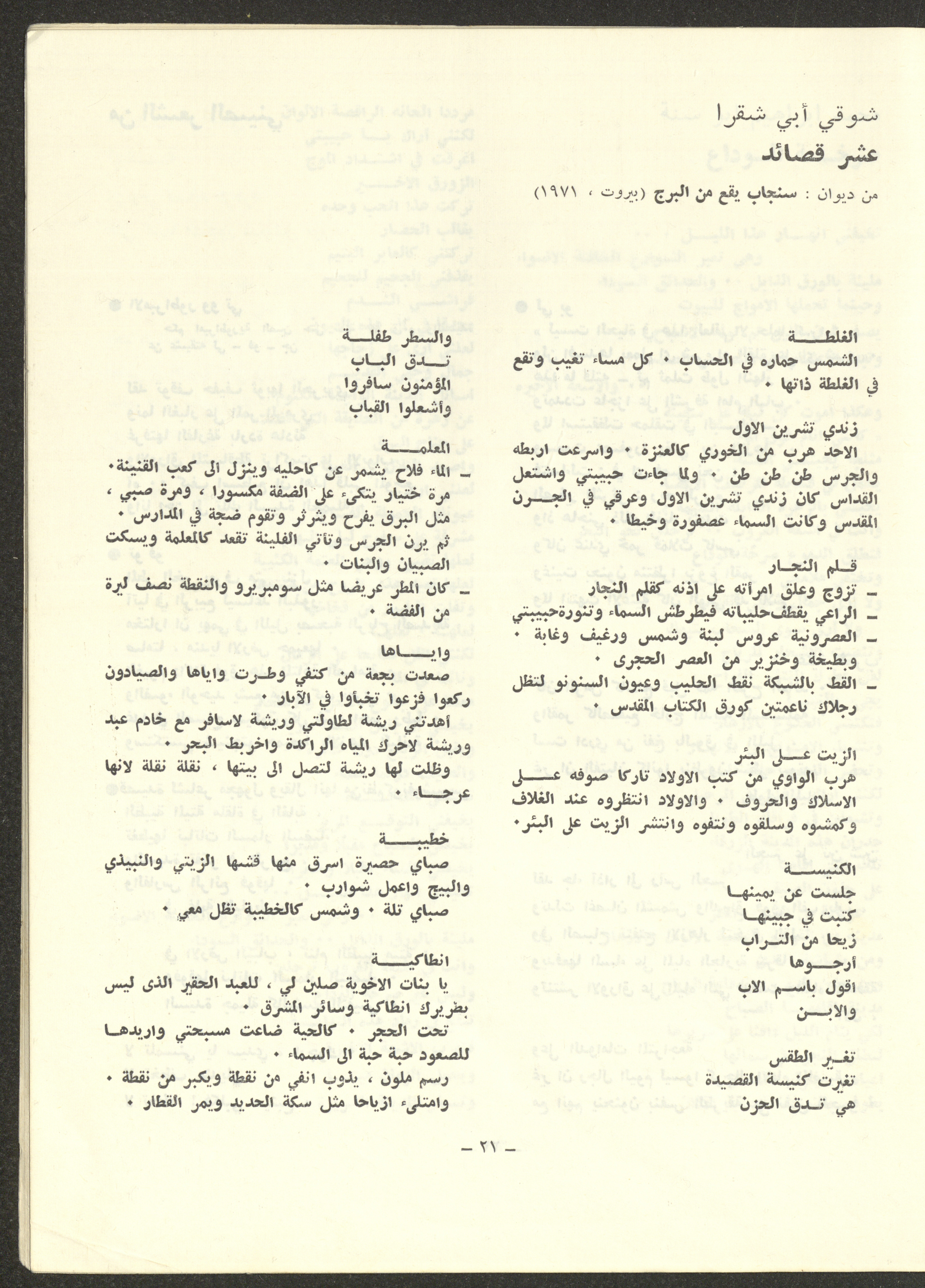 وثيقة مطبوعة باللغة العربية، مكونة من 50 صفحة، تتضمن العدد العاشر من مجلة الشرق الصادر في شهر آذار عام 1973، وهي مجلة شهرية تعنى بشؤون الأدب والفكر والفن، كانت تصدر عن صحيفة الأنباء تحت إشراف مدير التحرير محمود عباسي، وطبعت في مطبعة دوكمة في القدس، إذ بلغ ثمن العدد ليرتان وتضمنت صورًا ومقالات وأبحاث وأشعار وقصص، منها: - "صرخة الوداع"، قصيدة بقلم محمد أبو سنة. - "لهفة"، قصيدة بقلم فاروق مواسي. - "ثلاث قصائد"، قصيدة بقلم انطون شماس. - "الأدب الشركسي"، بحث من إعداد محمود كناعنة. - "الشعر في الكتاب المقدس"، مقال بقلم نير شوحيط. - "الصحافة العربية في حيفا"، مقال بقلم يعقوب يهوشواع. - "عقدة الحياة"، قصة بقلم إسحق بار موشيه.