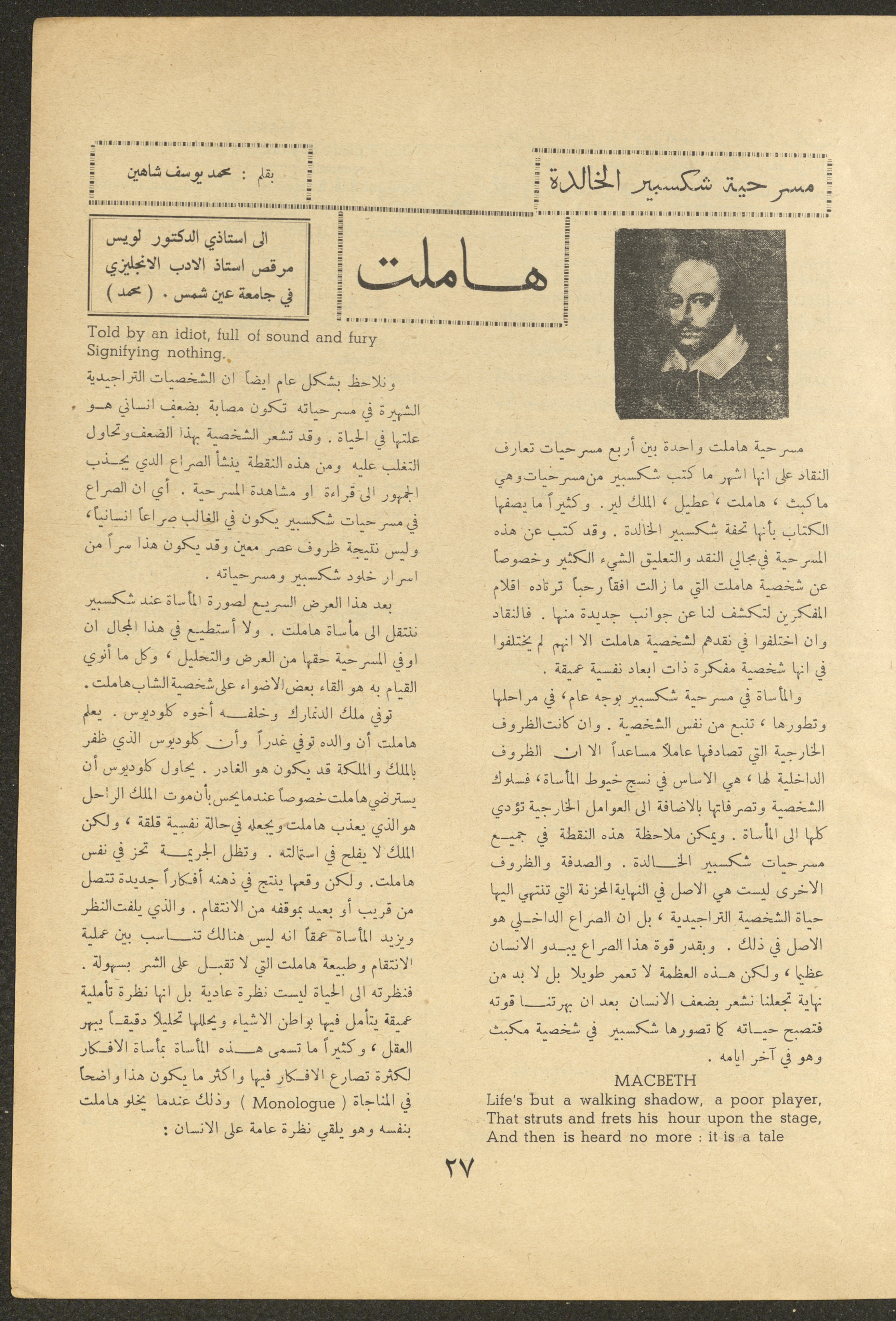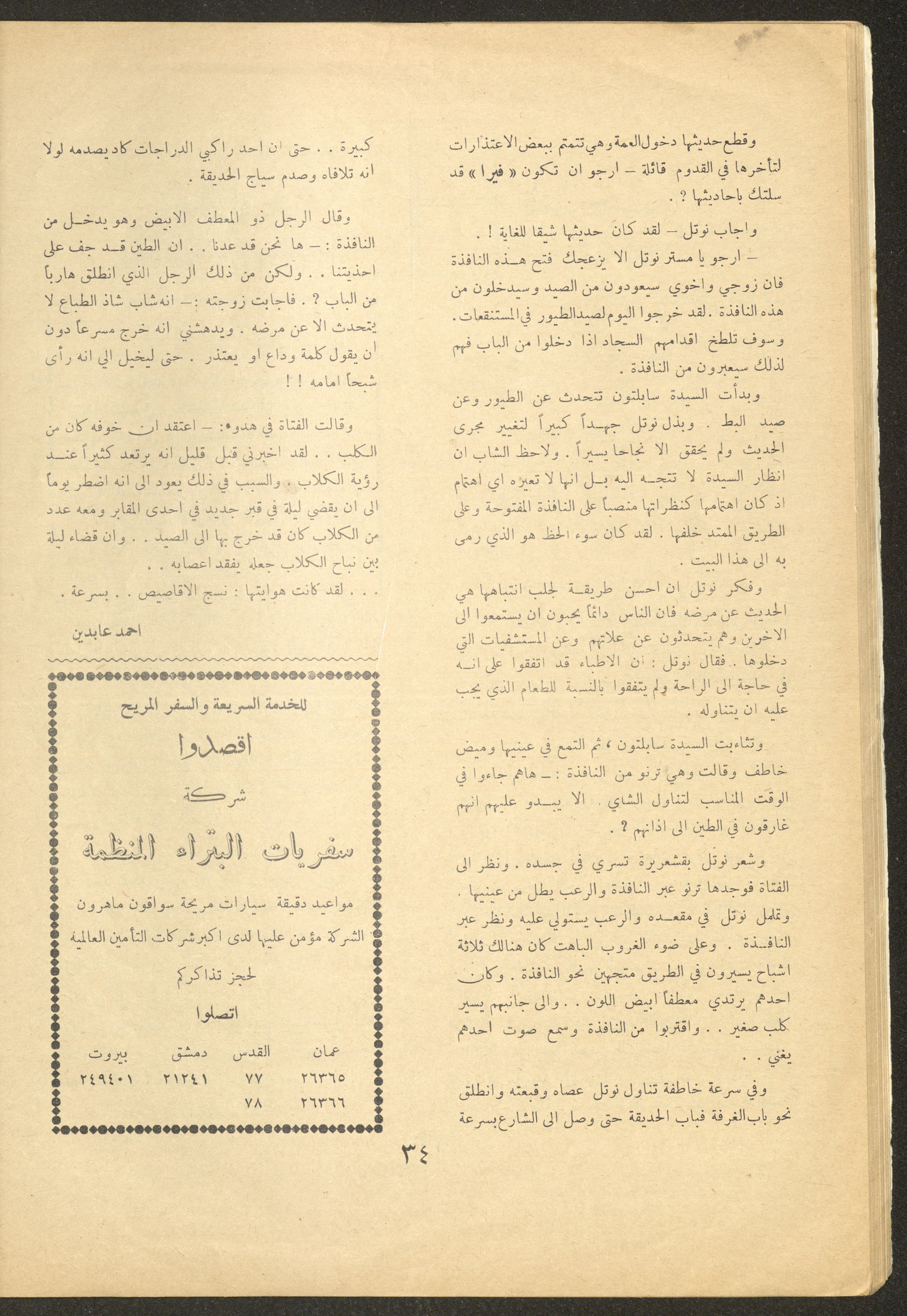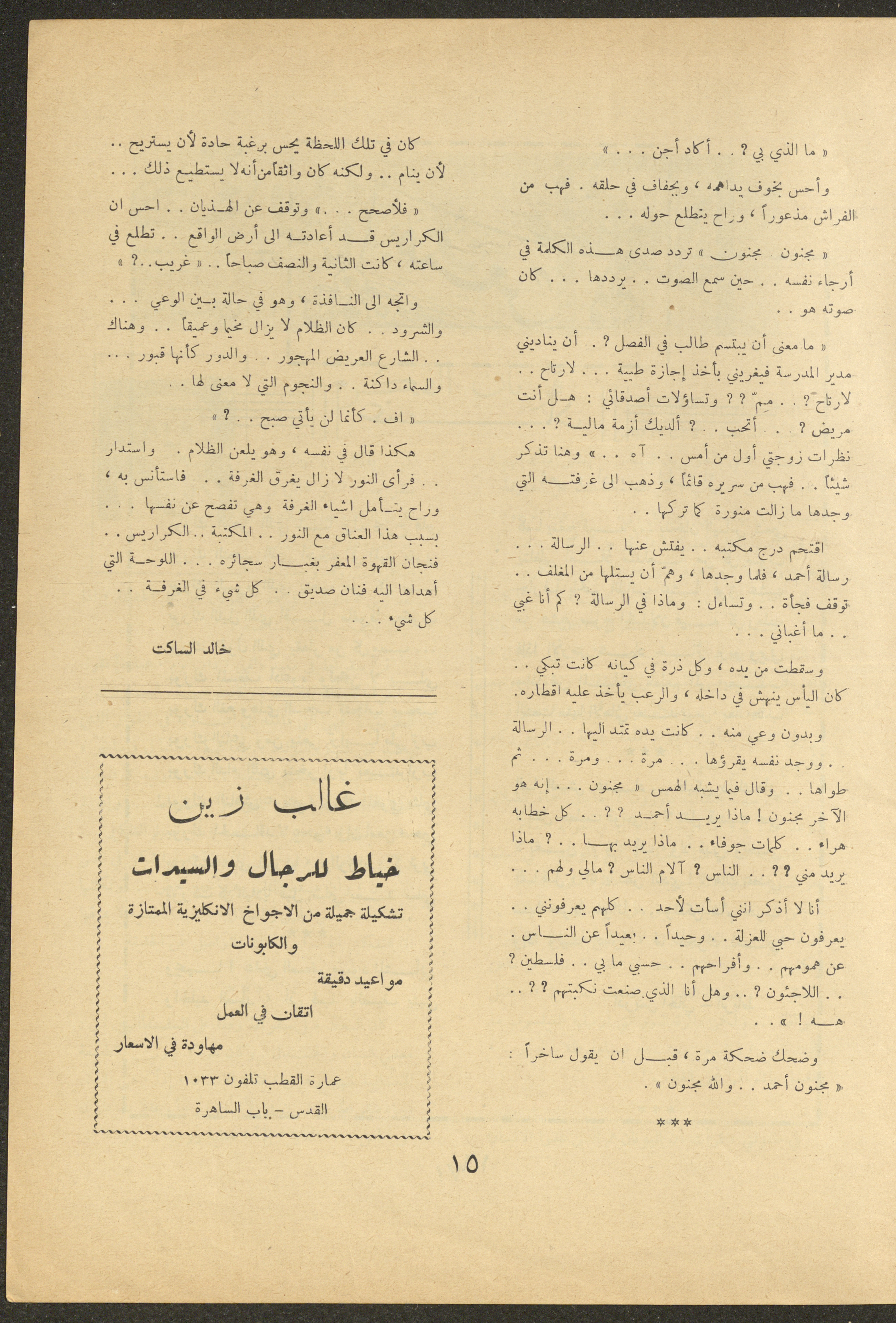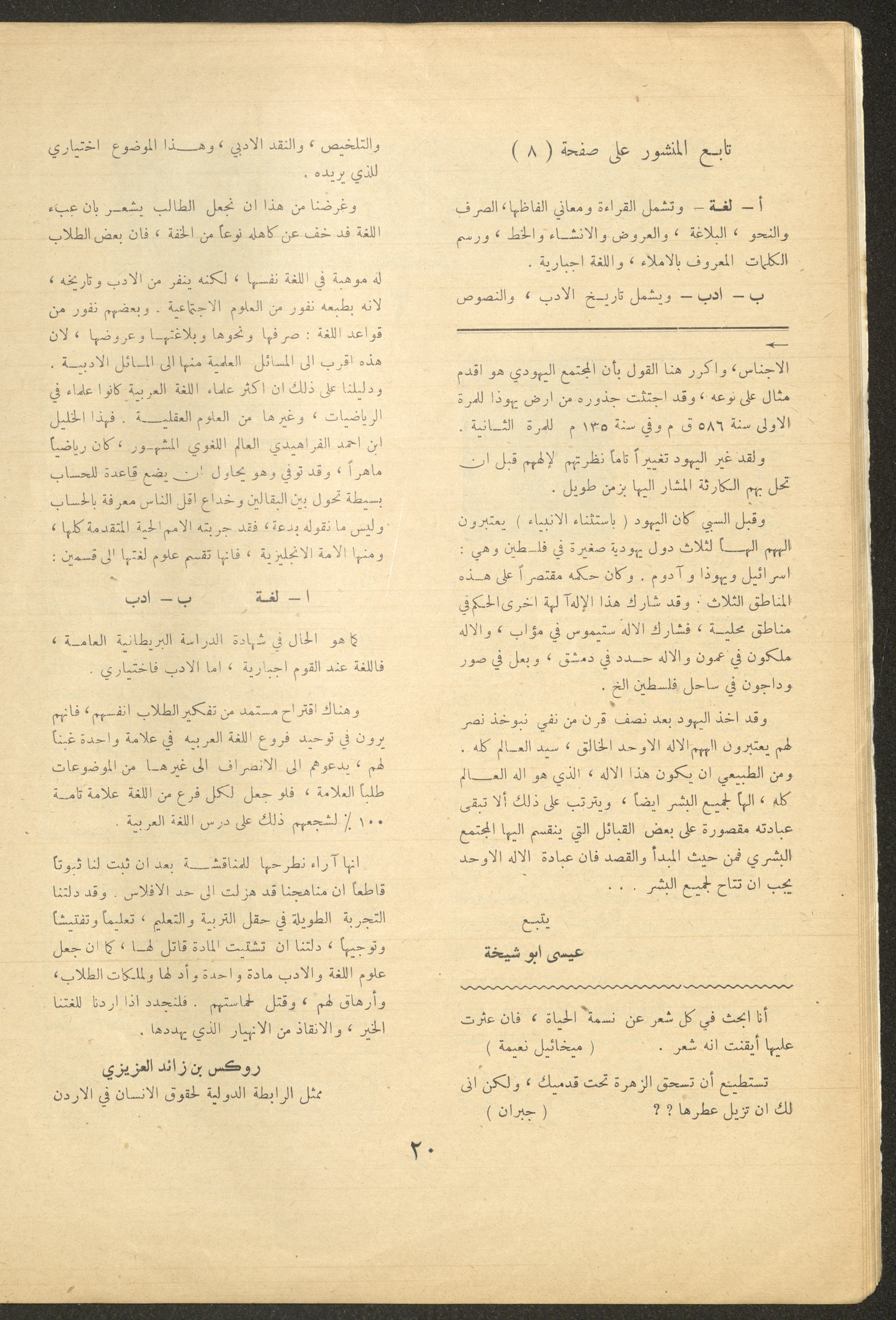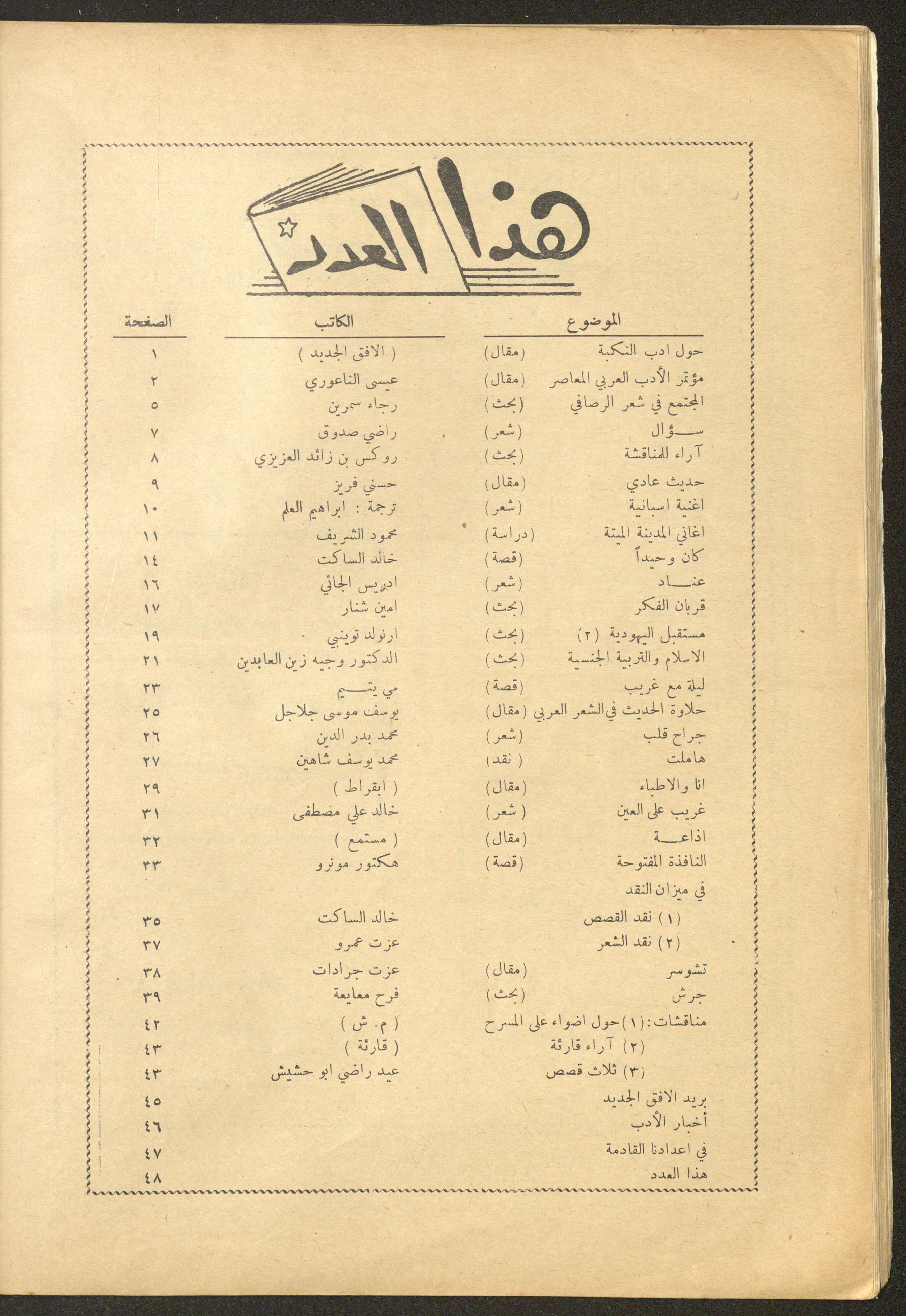 Issued by al-Manar Press Foundation in November 1962 and printed in Arabic, this 52-page document shows the 4th issue of al-Ofuq al-Jadeed Magazine, which is a monthly magazine concerned with literature, culture and thought, under the supervision of Editor-in-Chief Amin Shannar, and was printed in Dar al-Manar Press in Jerusalem. The price of the issue amounted to 60 fils and included photographs, articles, research, poems and stories, including: - "Conference on Contemporary Arabic Literature", an article by Issa an-Naouri. - "He Was Alone", a story by Khaled as-Saket. - "Inad (Stubbornness)", a poem by Idris al-Jaei. - "Islam and Sexual Education", research by Wajeeh Zain al-Abidin. - "The Offering of Thought", research by Amin Shinnar. - "The Open Window", a story by Hector Munro. - "Chaucer", an article by Izzat Jaradat.