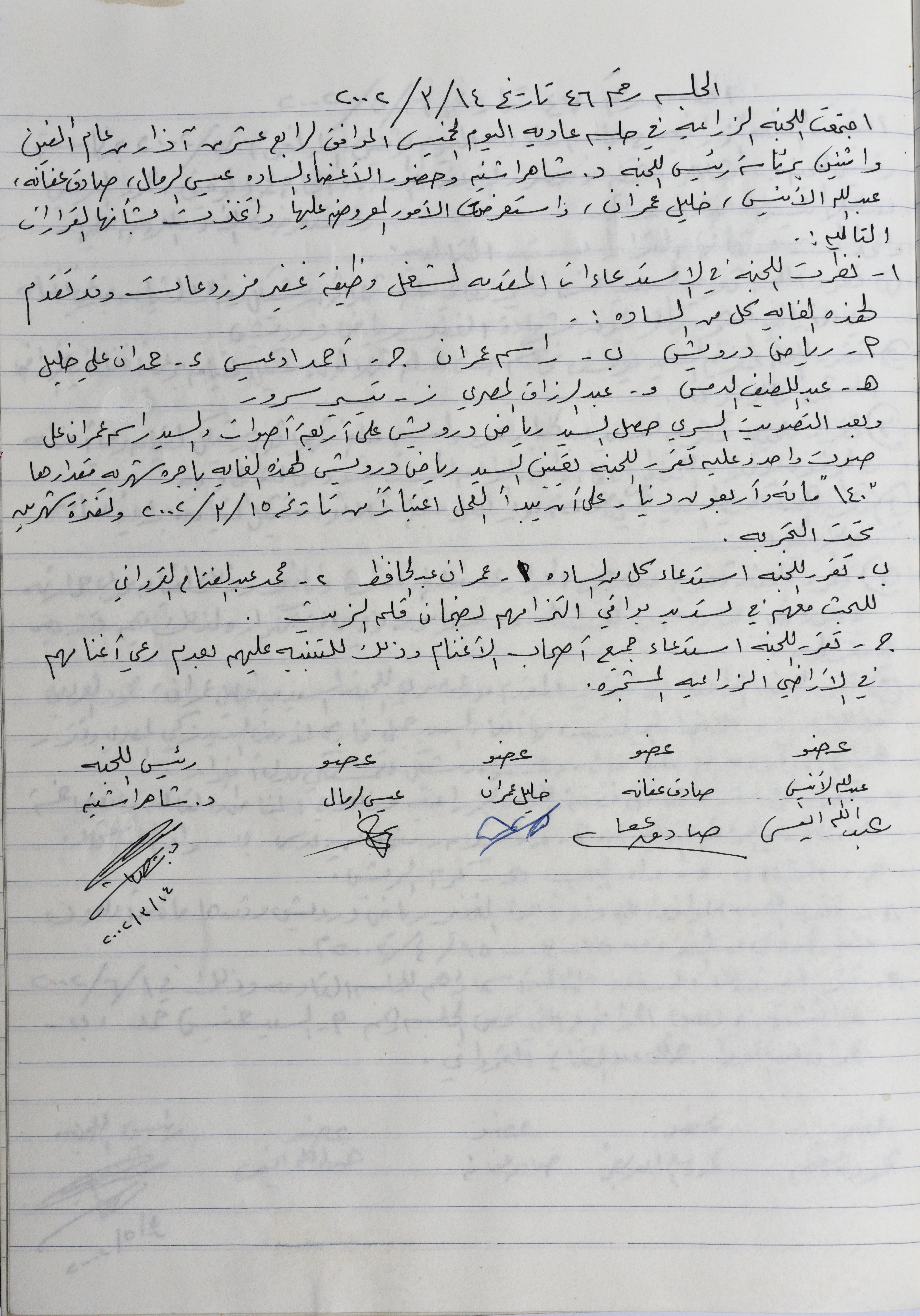 The minutes of session No 46 of the Agricultural Committee-Salfit, held on 14 Mar 2002_x000D_ During this session, a new guard was elected to guard the planted lands and groves. The committee also decides to send for ʿomran ʿabul-Hafeẓ, and Muhammad ʿabdel-Fattah al-Qarawany to ask them to pay the oil production tax. The committee decides to send for sheep owners in town to warn them against grazing planted lands_x000D_