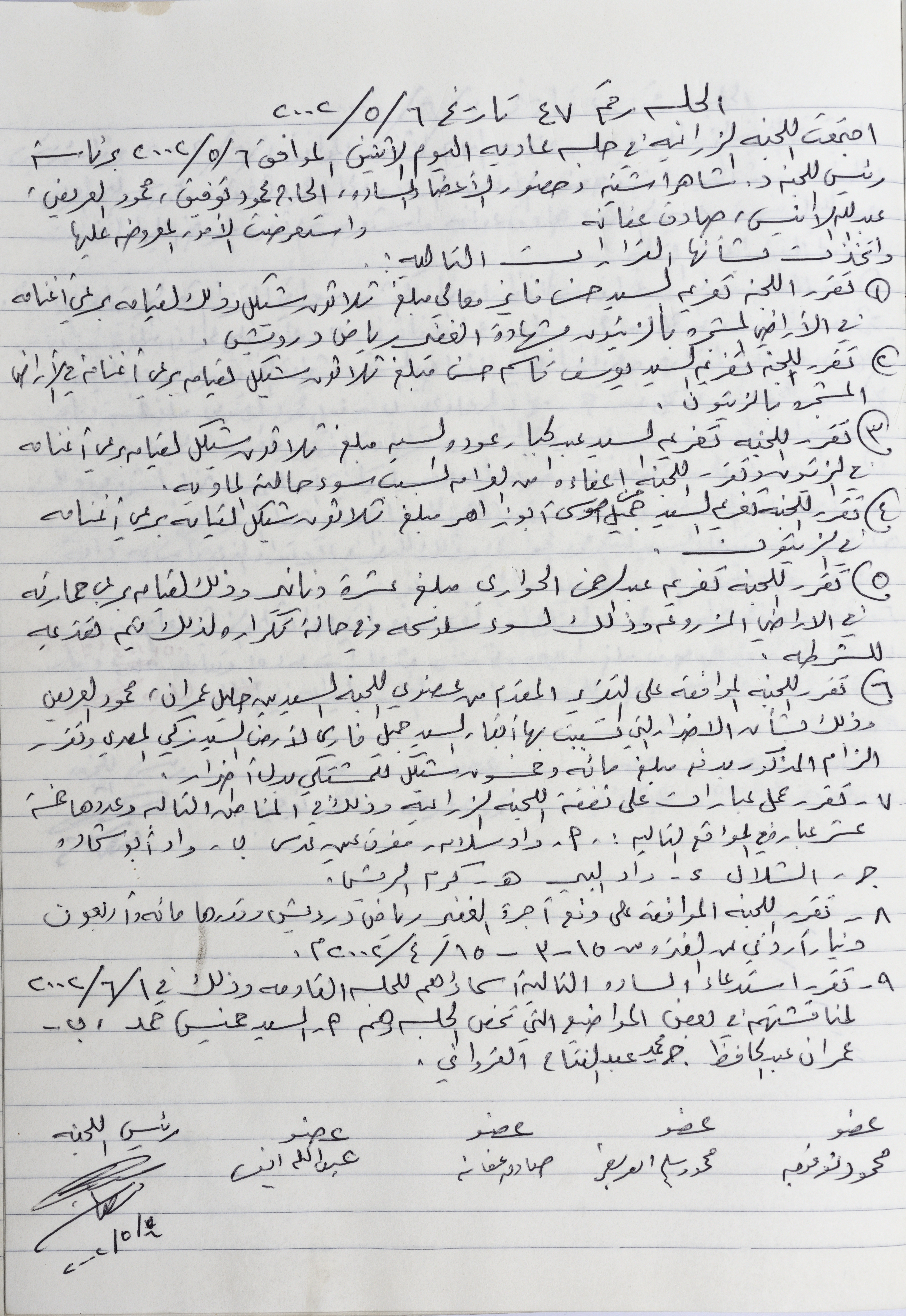 The minutes of session No. 47 of the Agricultural Committee-Salfit, held on 6 May 2002_x000D_ The Committee decides to fine citizens who graze their sheep and cows in planted lands. They also decide to build rainwater channels in several agricultural areas in Salfit: Dar Salameh, ʿein ʿadas Junction, Karam ar-Rish, ash-Shallal and Wady abu-Shehadeh. The Committee agrees to pay the fees to the land guard and decides to call for Khamis al-hamad, ʿomran ʿabul-Hafeẓ, and Muhammad al-Qarawany to discuss next session's topics with them._x000D_