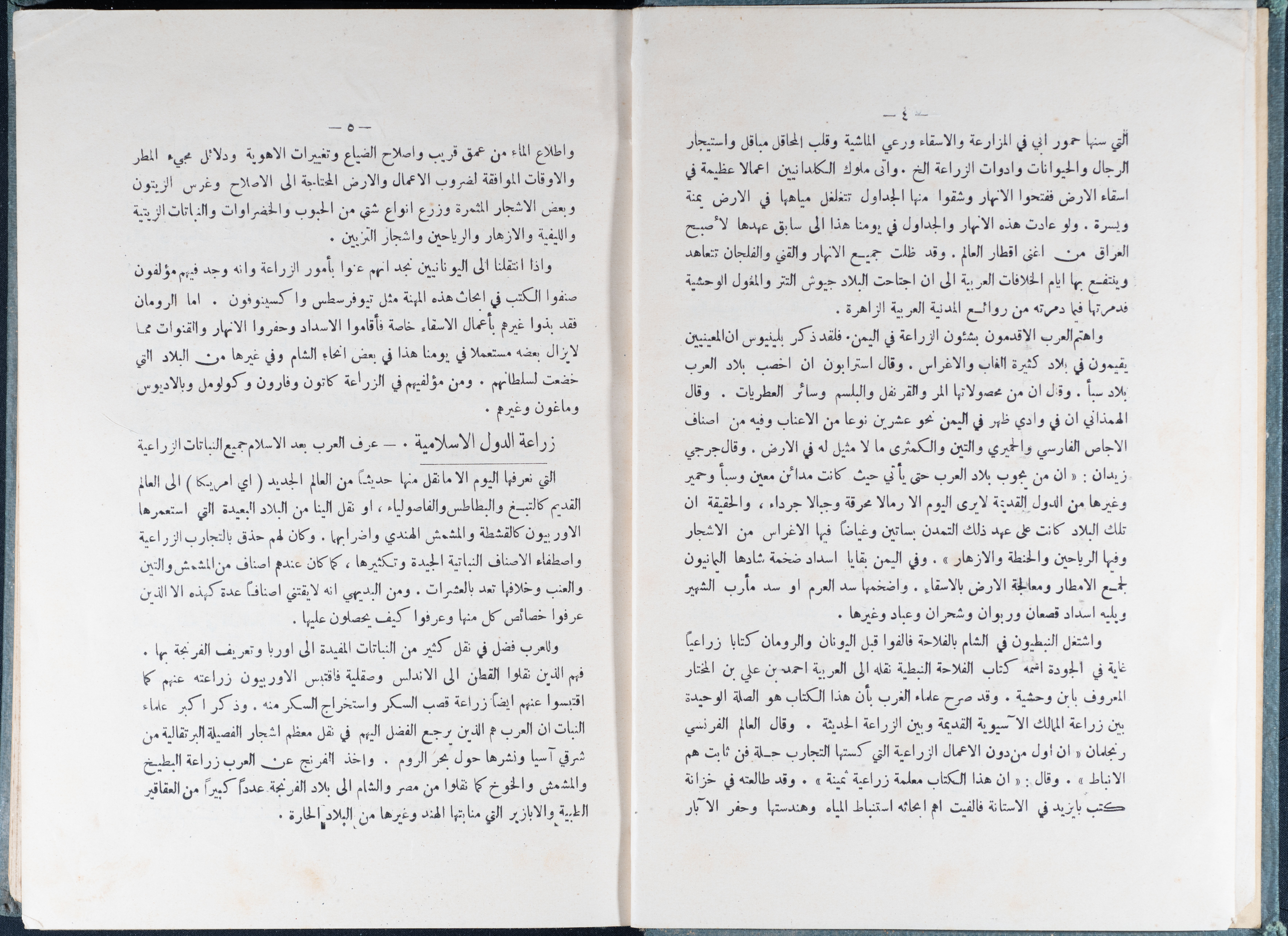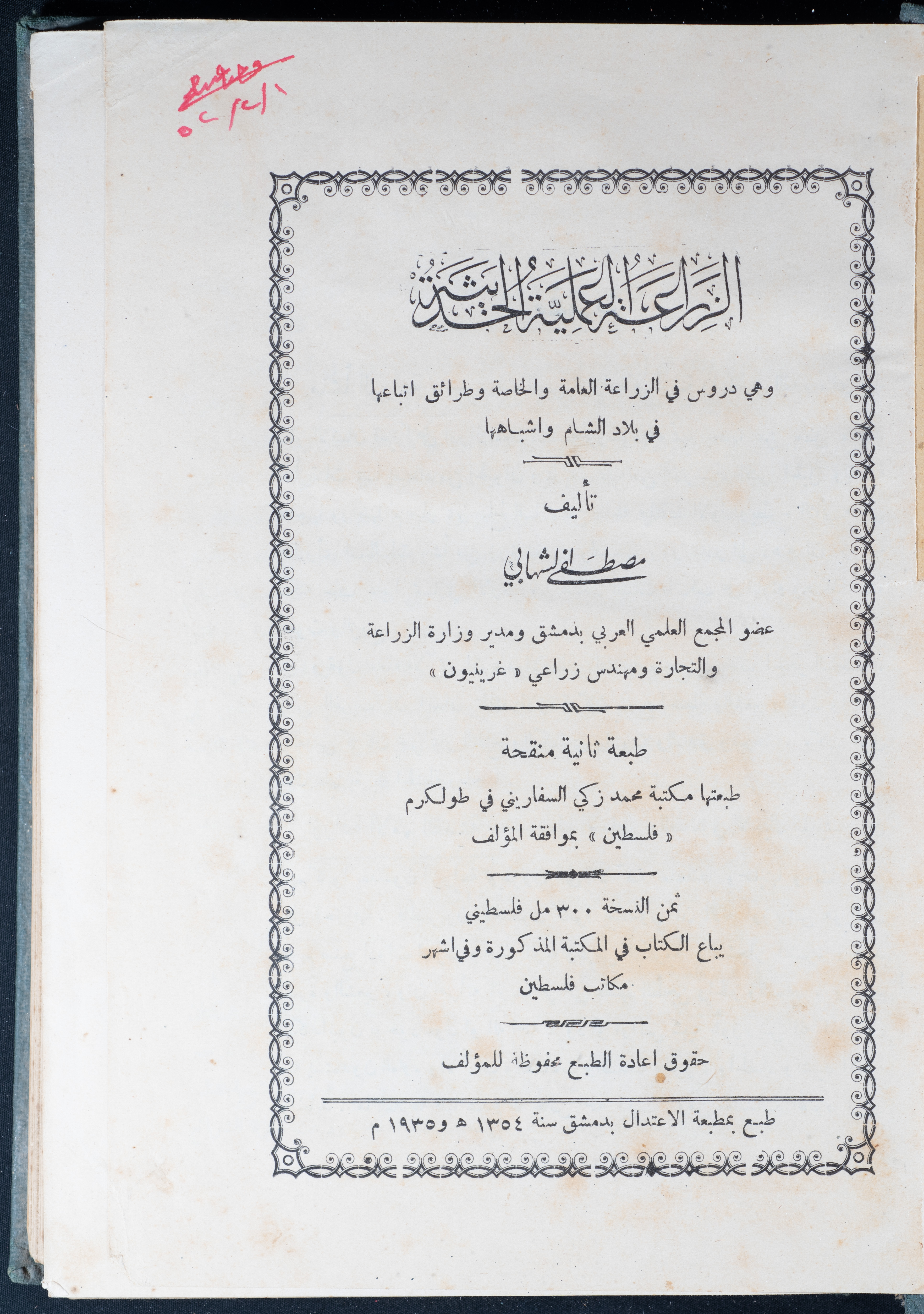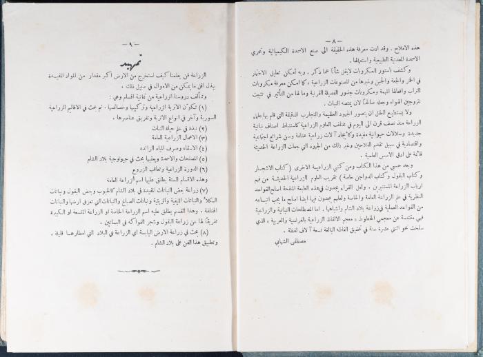 وثيقة مطبوعة باللغة العربية، تتضمن جزء من كتاب الزراعة العلمية الحديثة لمؤلفه مصطفى الشابي، وهو كتاب يحمل دروساً وقواعد نظرية بعلم الزراعة في بلاد الشام، والنسخة الثانية منه طبعت في مكتبة محمد زكي السفاريني في طولكرم، وبيعت بقيمة 300 مل فلسطيني، ويحمل توقيع وجيه عبد الباقي سنة 1952.