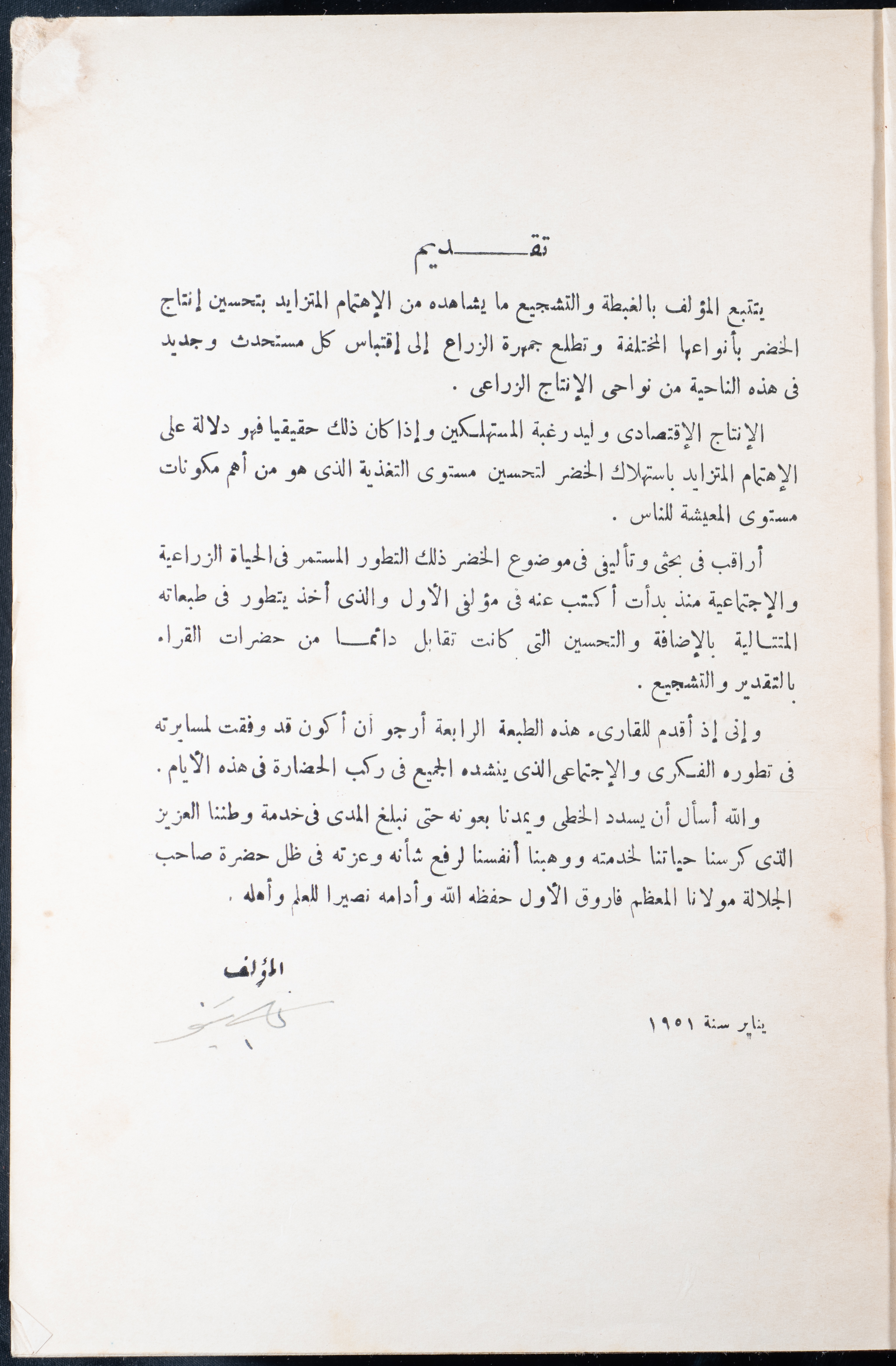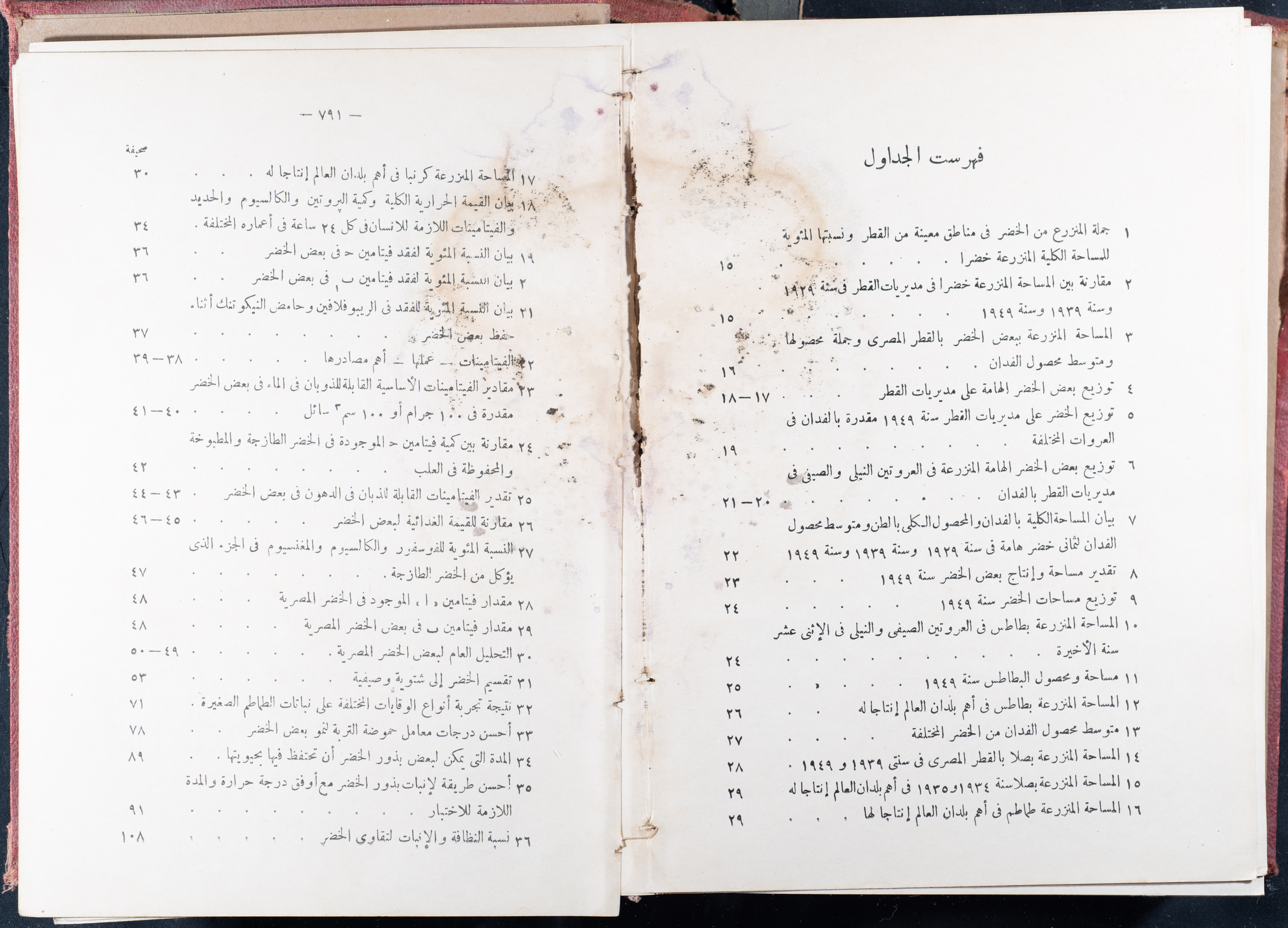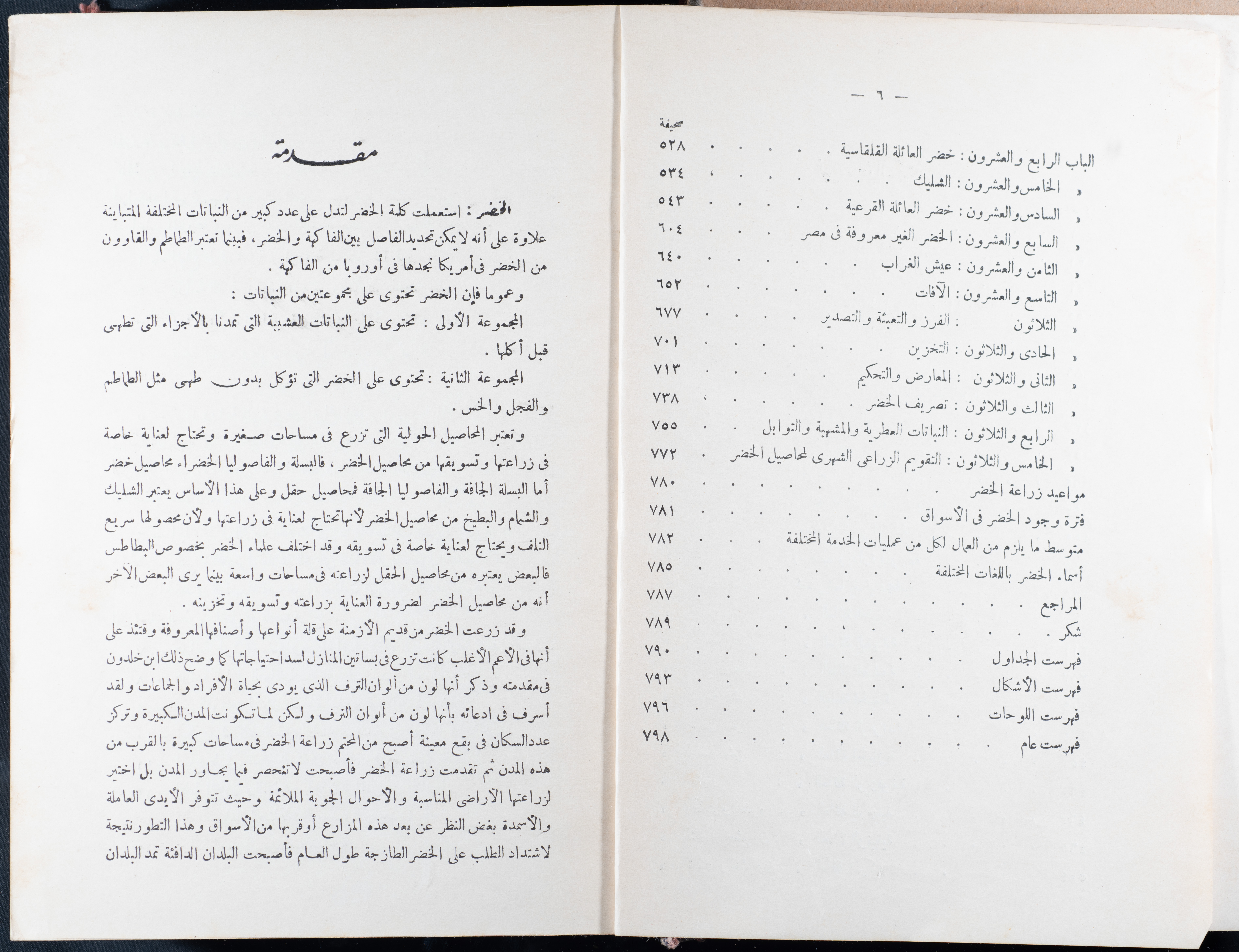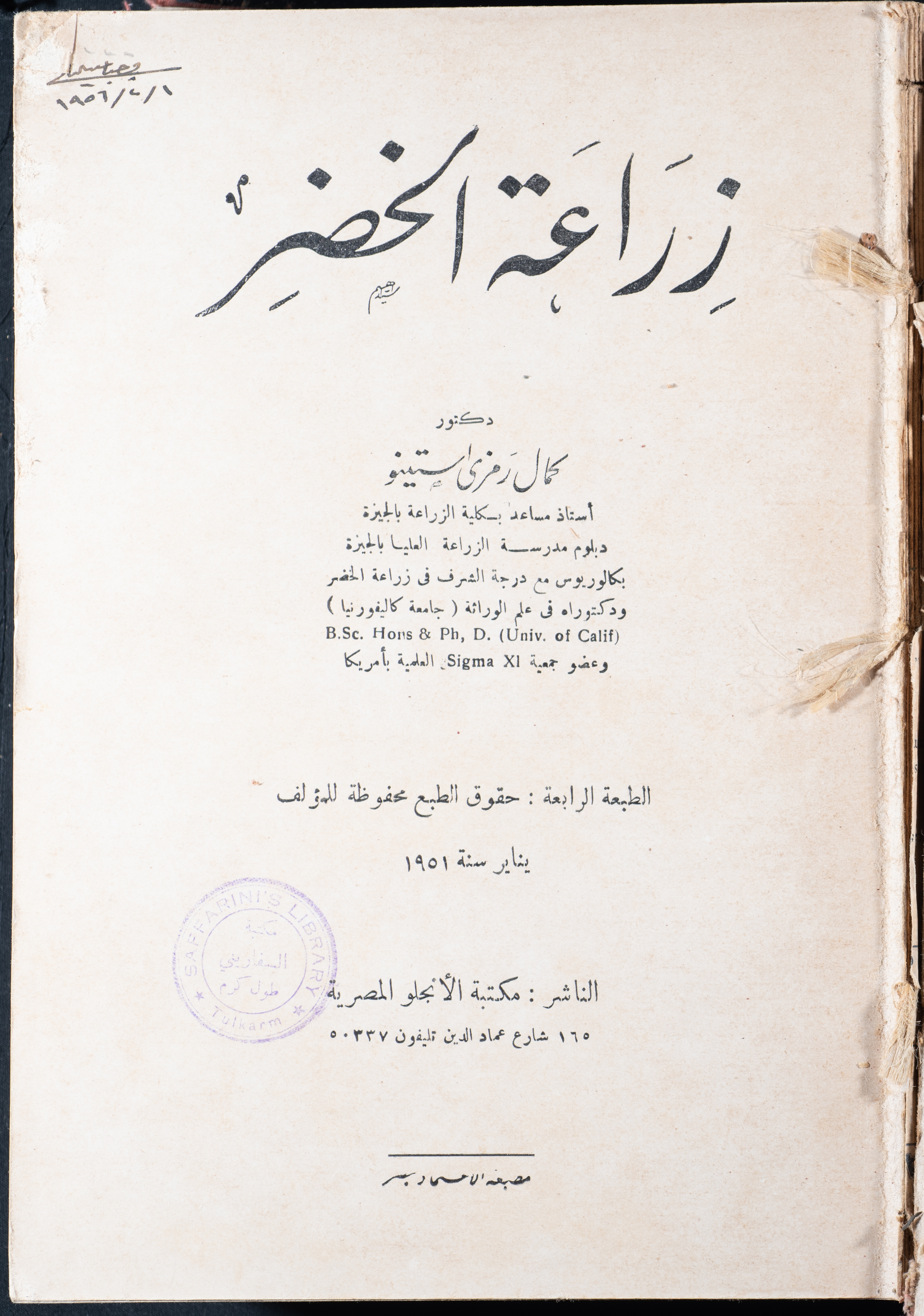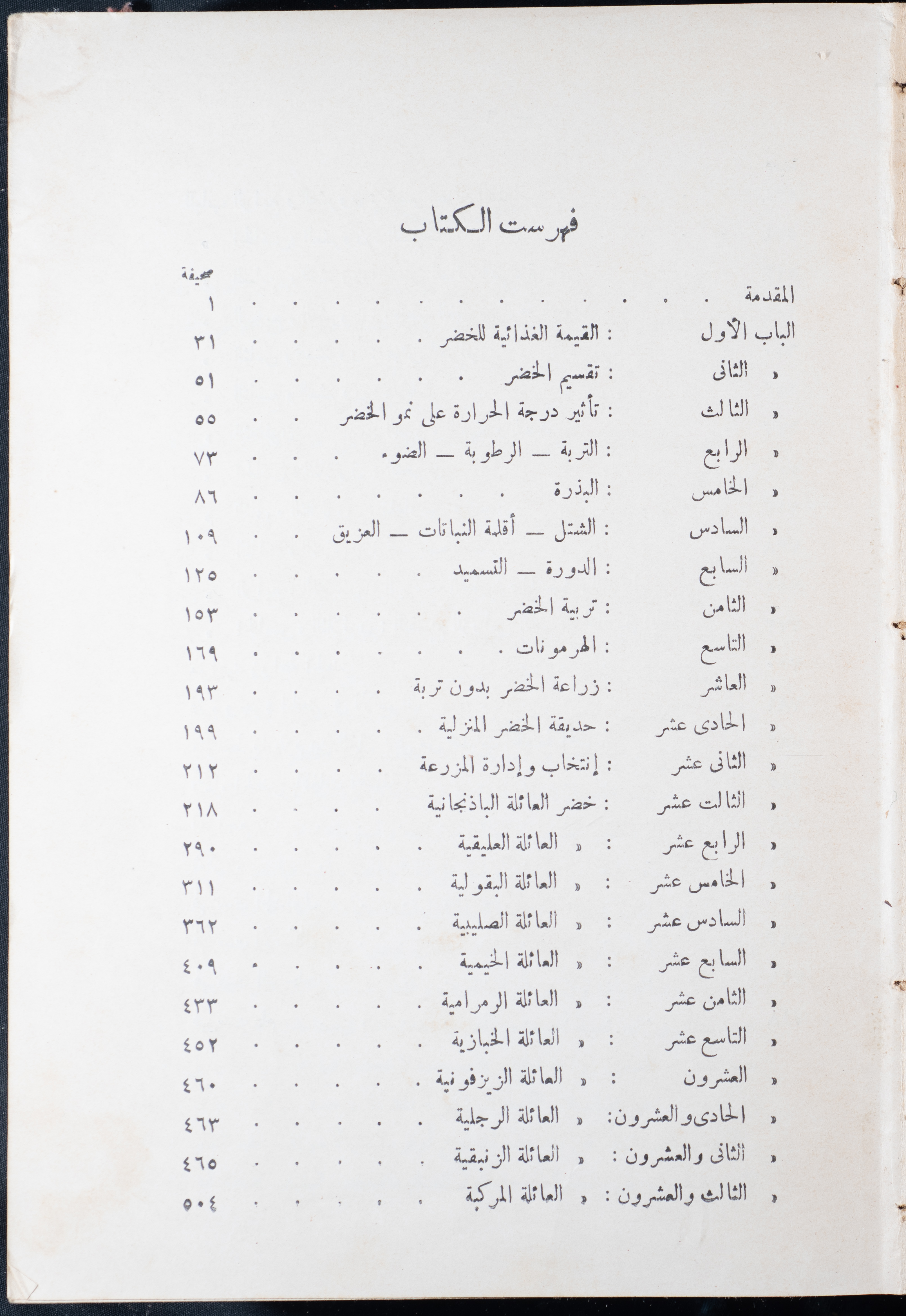 Found in the Wajeh Abdel-Baqi Collection and printed in Arabic, this 27-paged document shows the index of the book "Planting Greens" by Kamal Ramzi Istino, the fourth issue was issued by the Egyptian Angelo Library in Cairo in 1951.