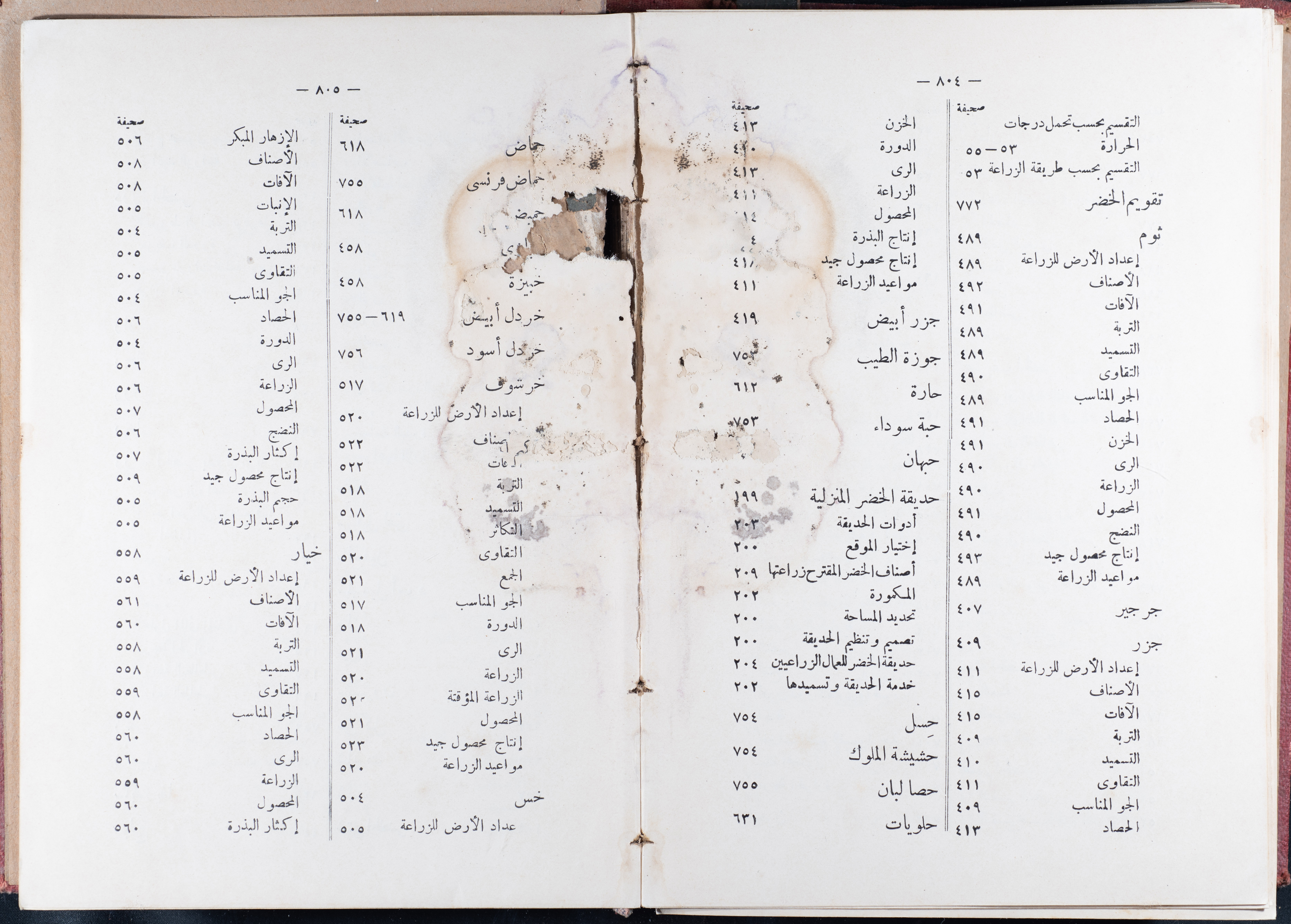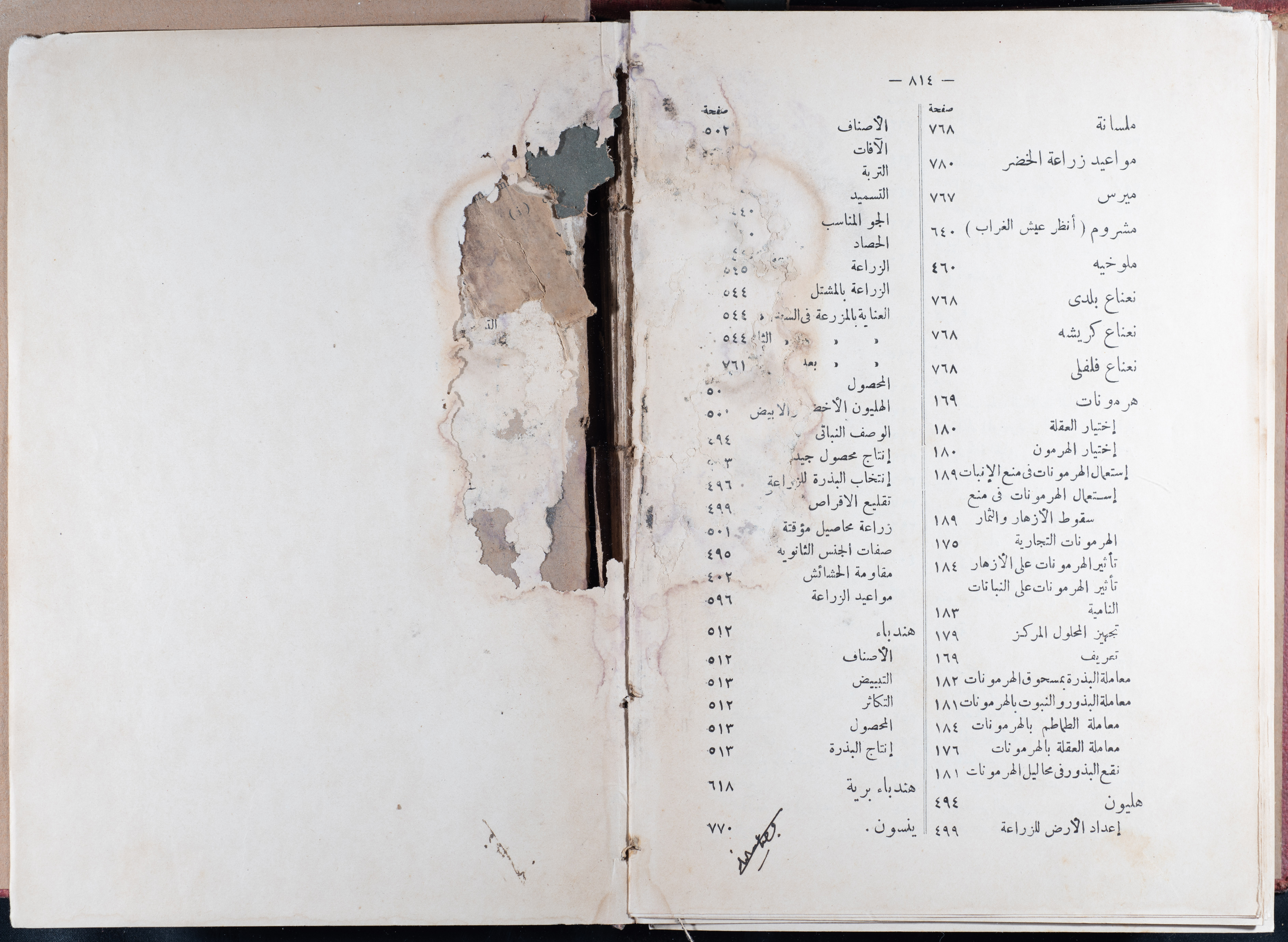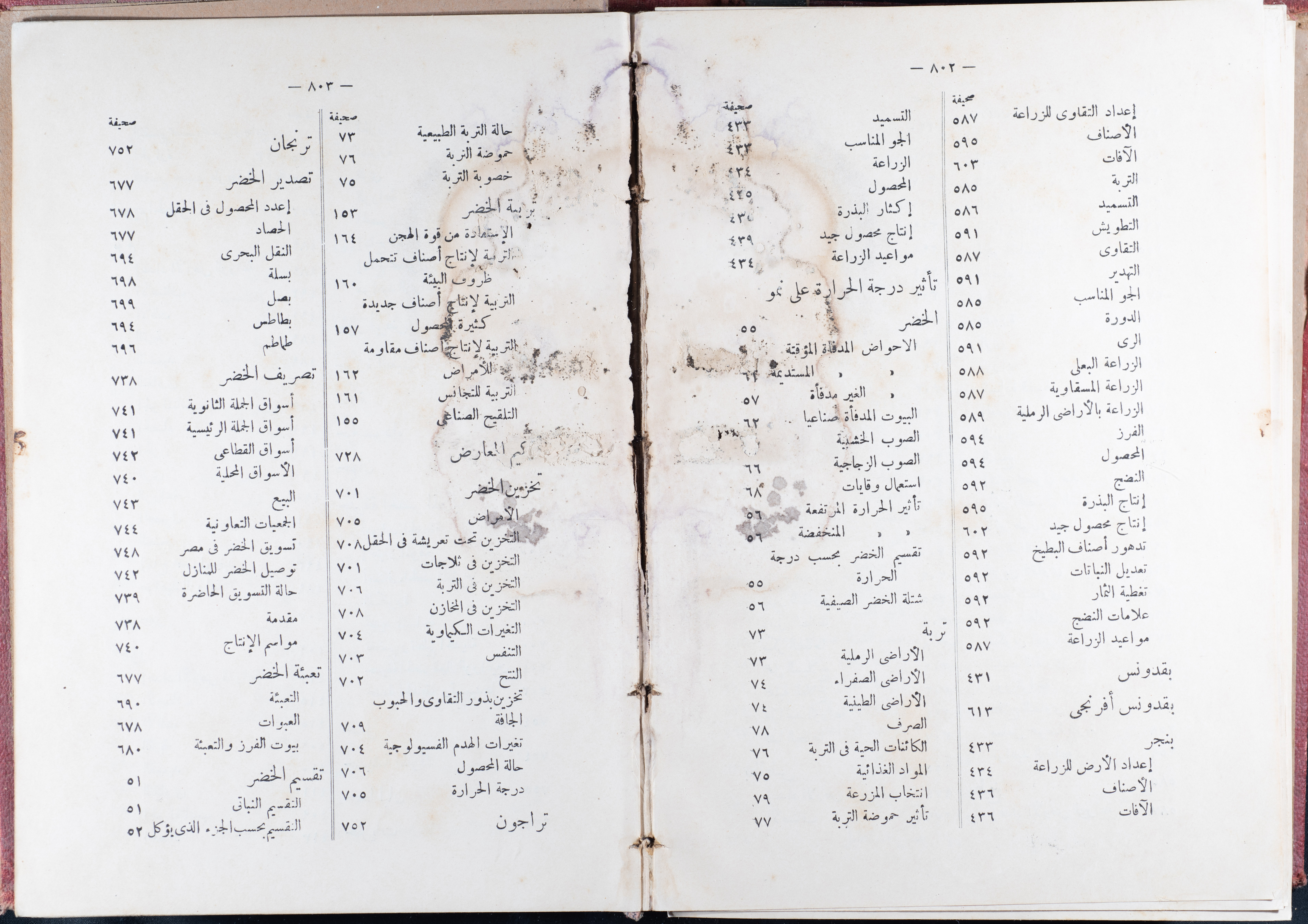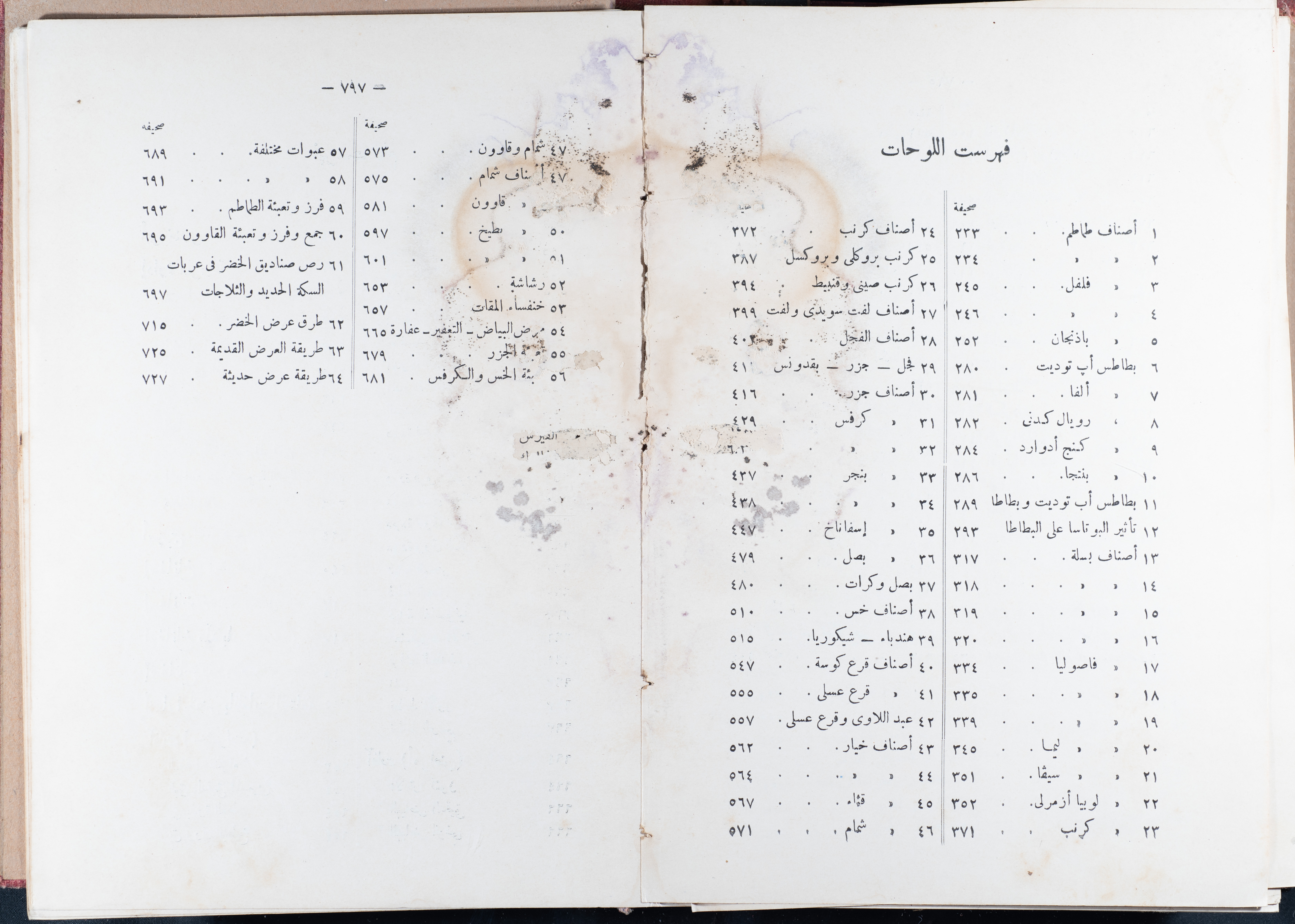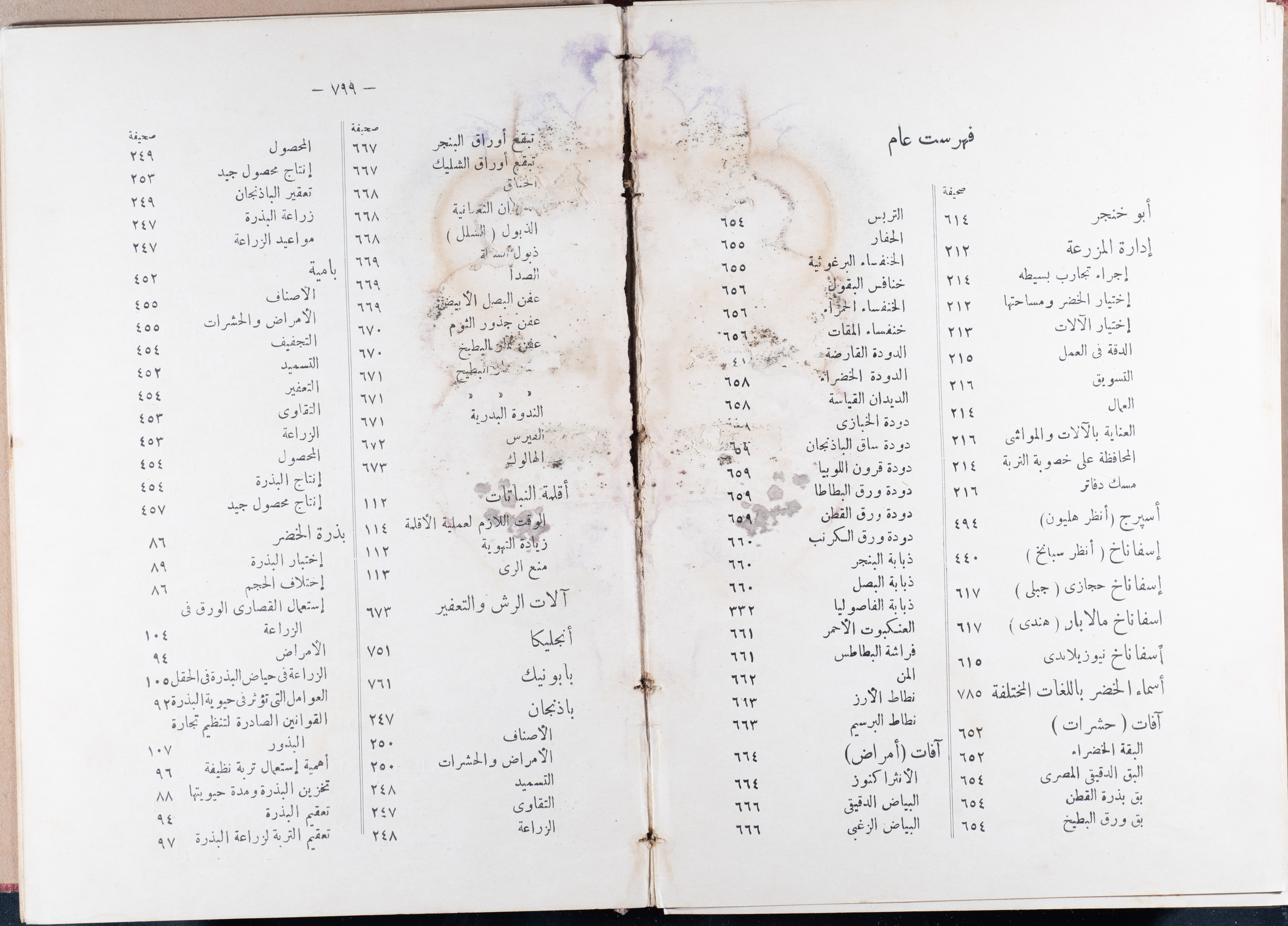 Found in the Wajeh Abdel-Baqi Collection and printed in Arabic, this 27-paged document shows the index of the book "Planting Greens" by Kamal Ramzi Istino, the fourth issue was issued by the Egyptian Angelo Library in Cairo in 1951.