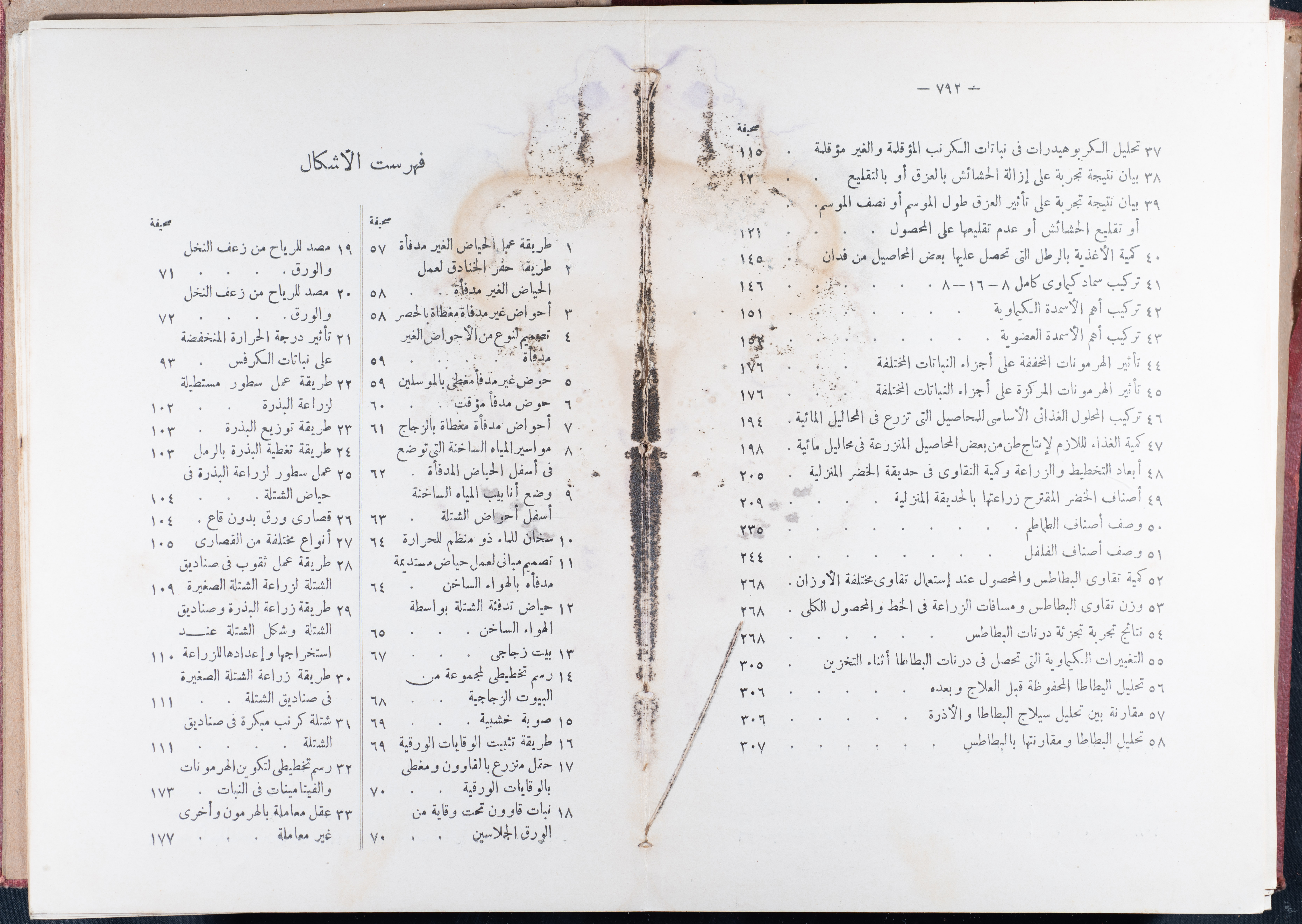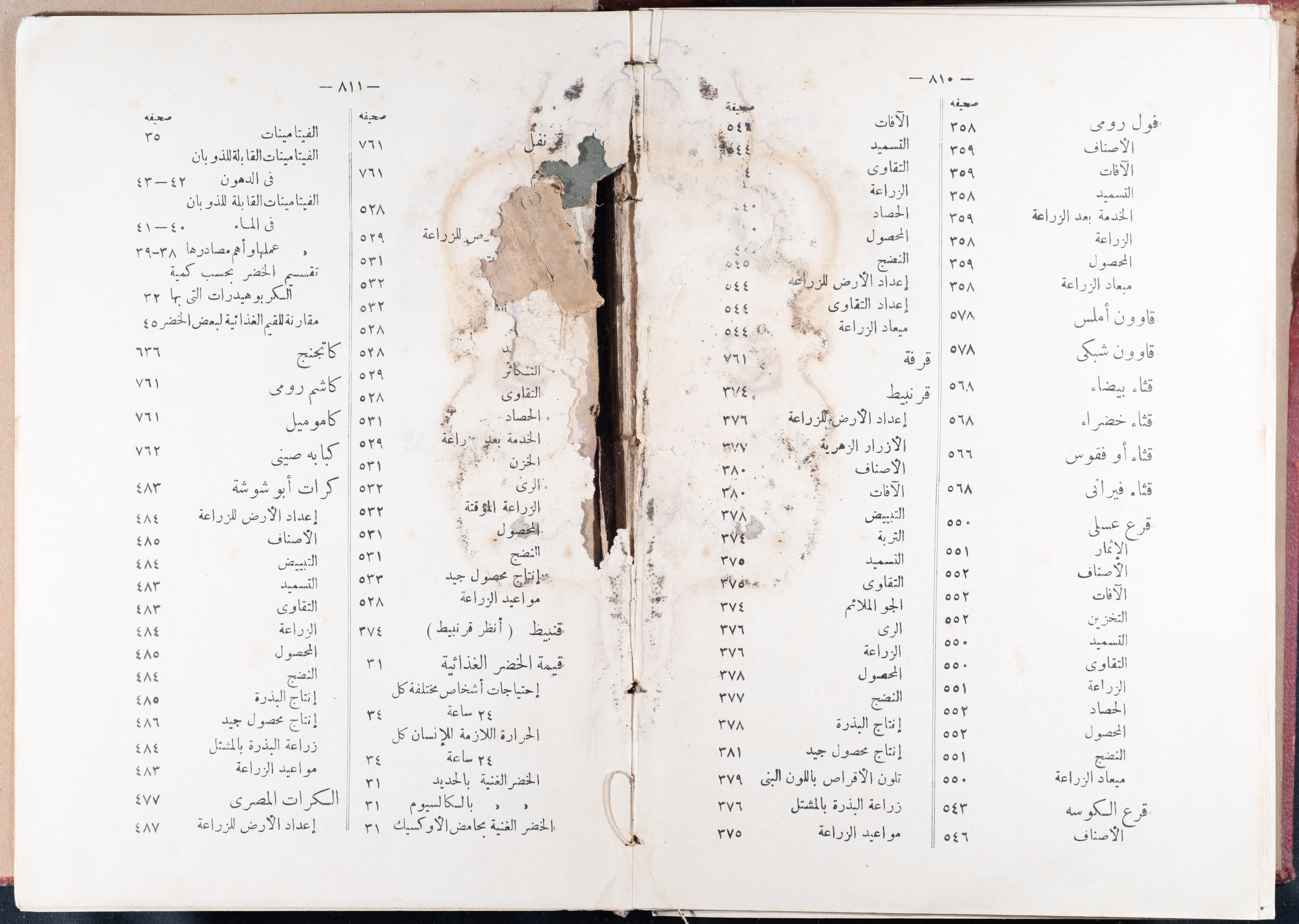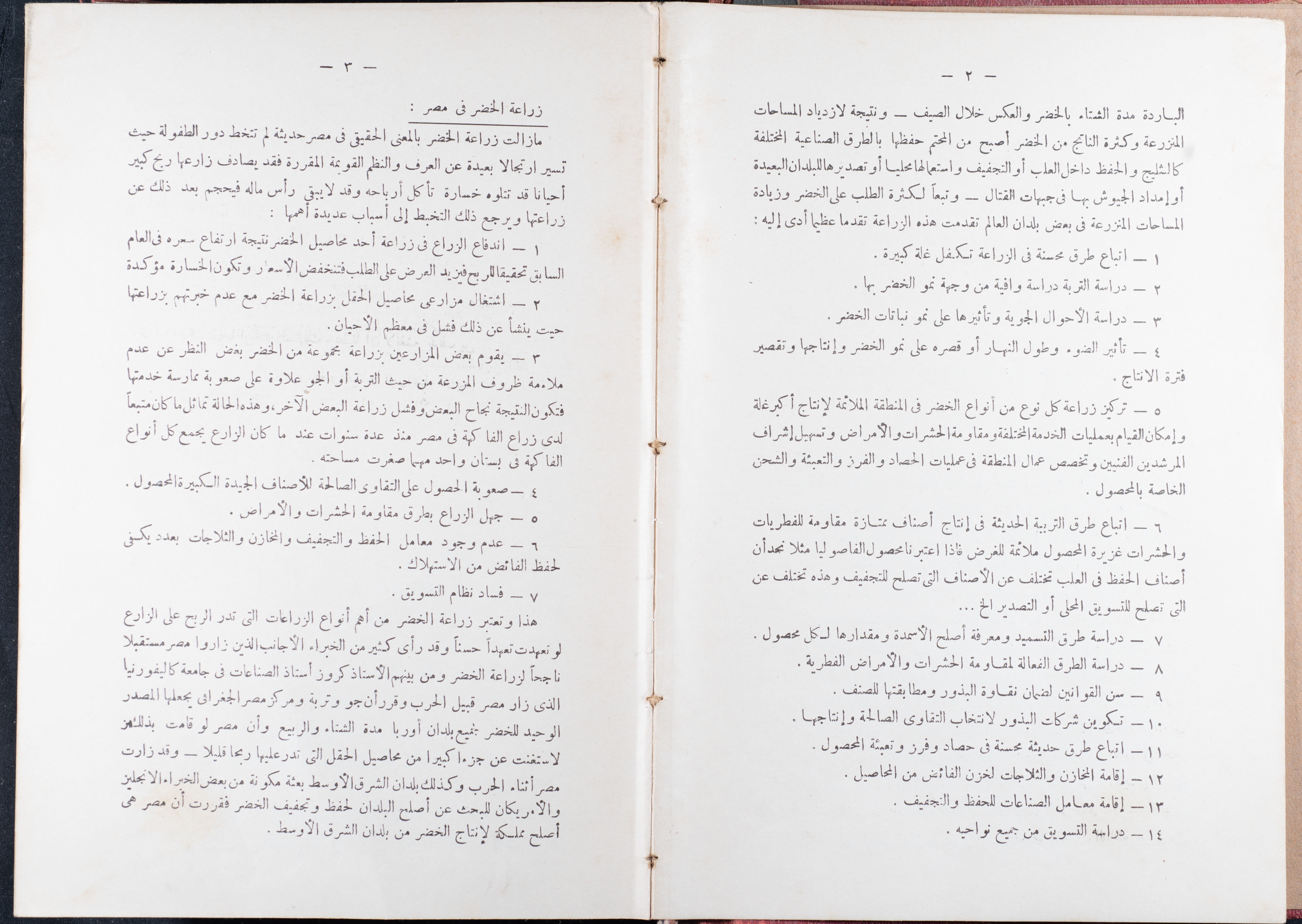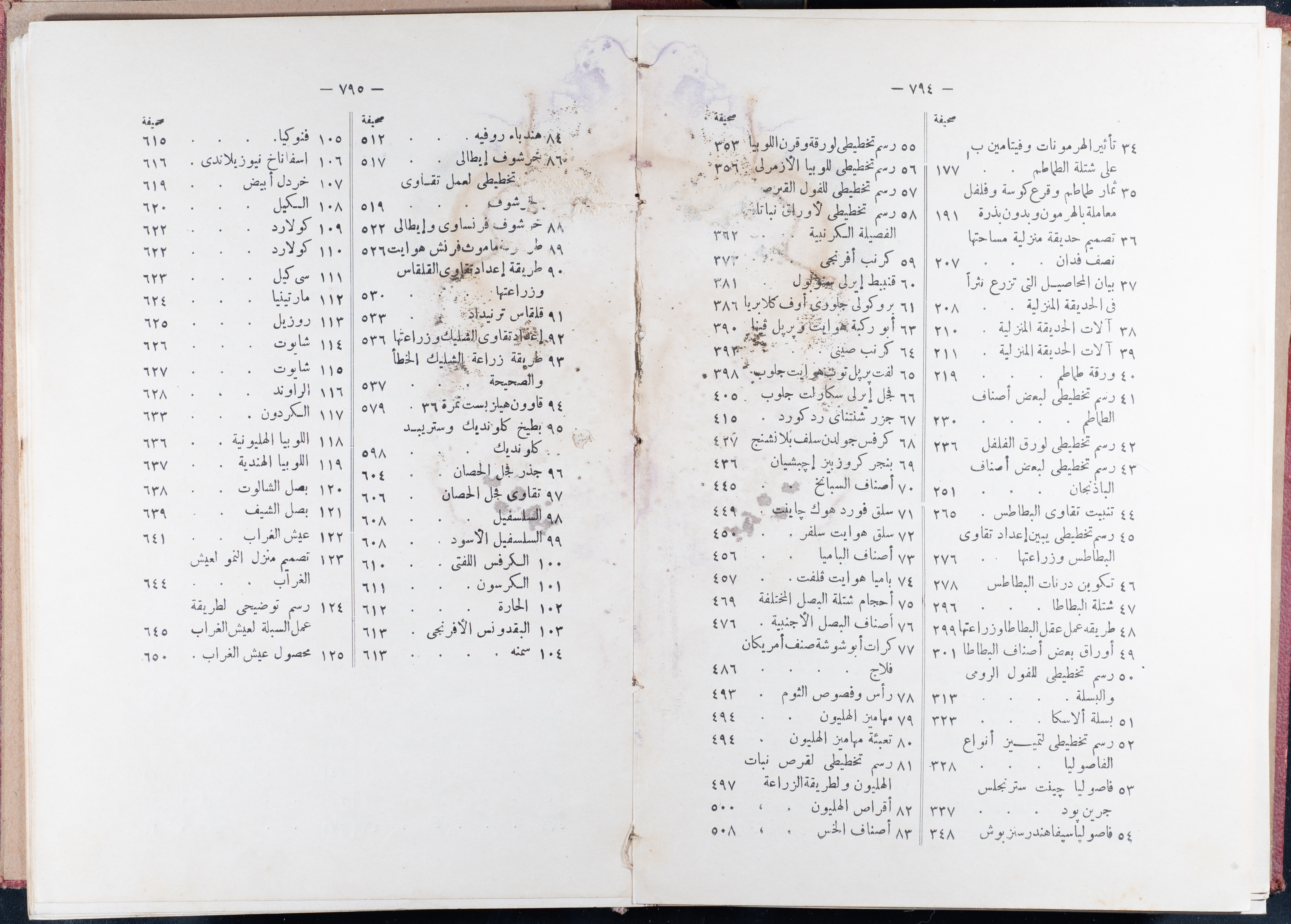Found in the Wajeh Abdel-Baqi Collection and printed in Arabic, this 27-paged document shows the index of the book "Planting Greens" by Kamal Ramzi Istino, the fourth issue was issued by the Egyptian Angelo Library in Cairo in 1951.