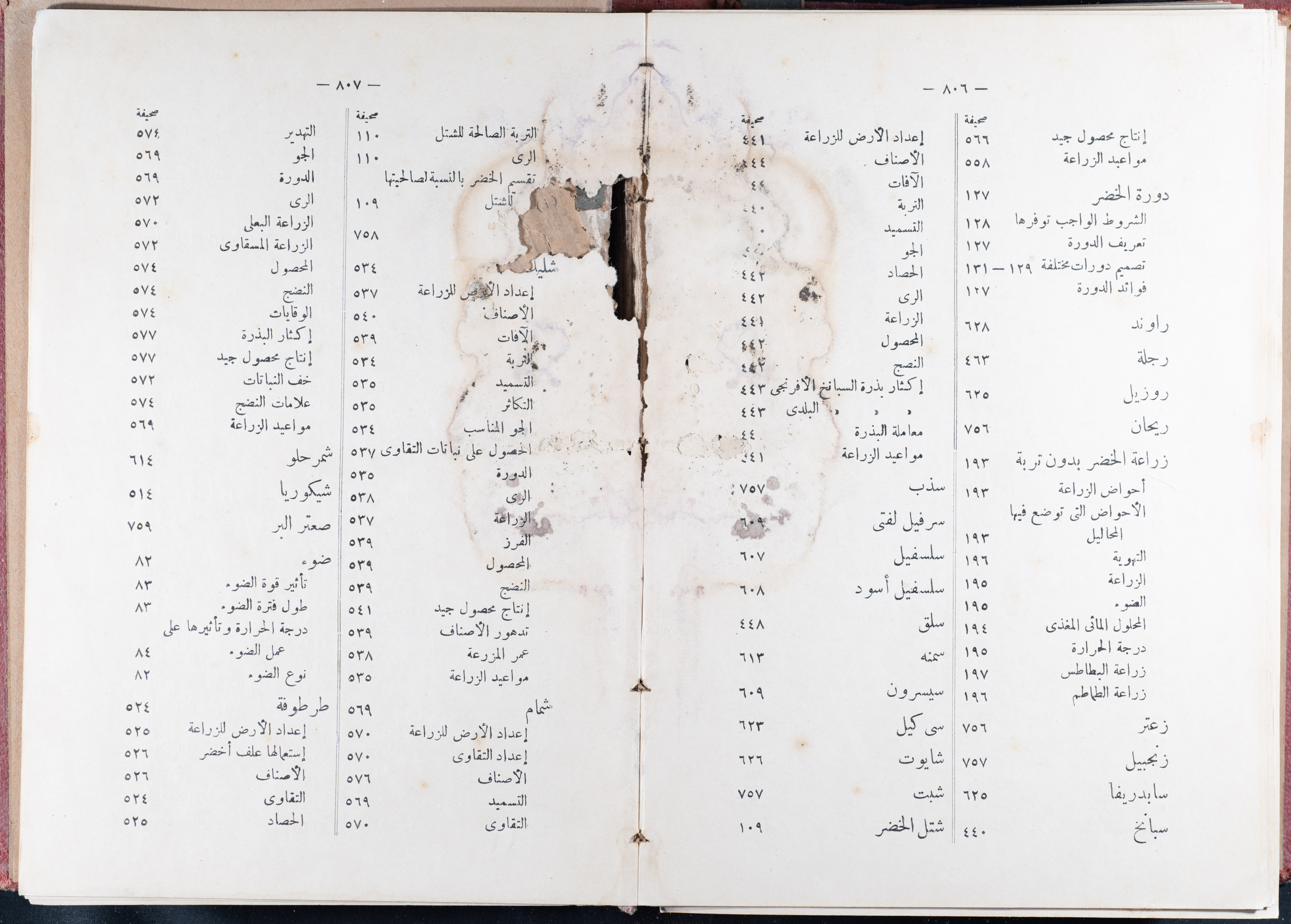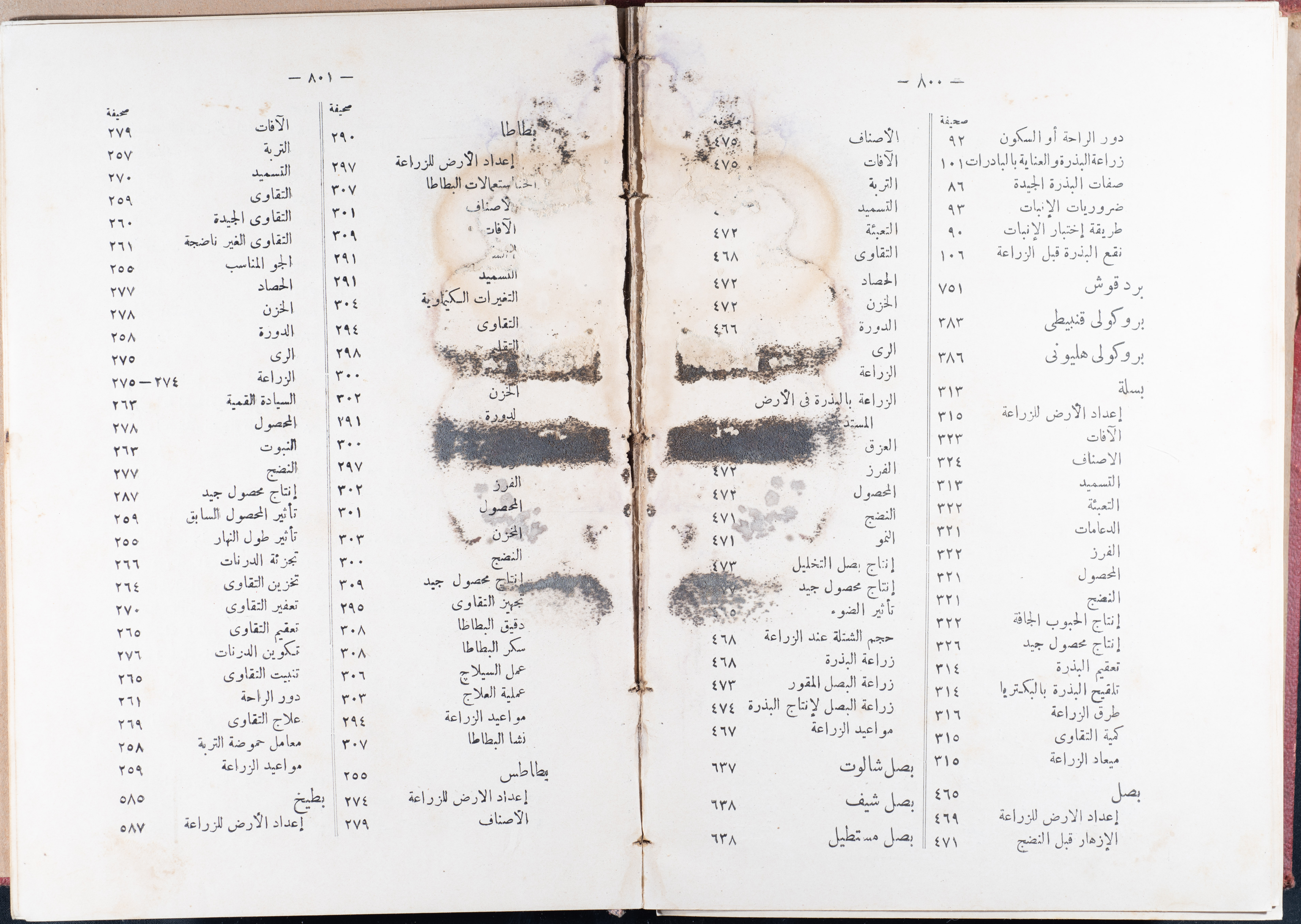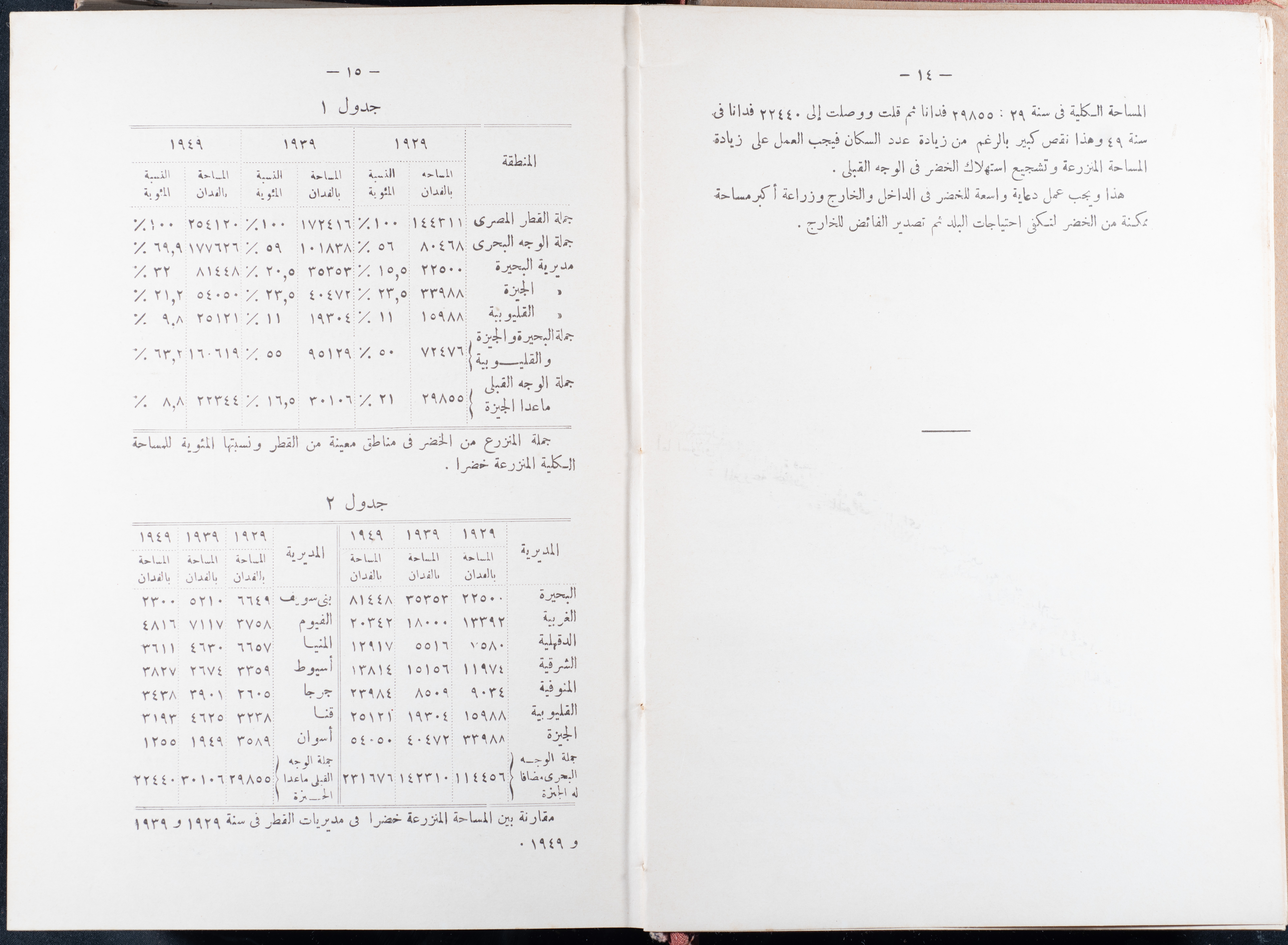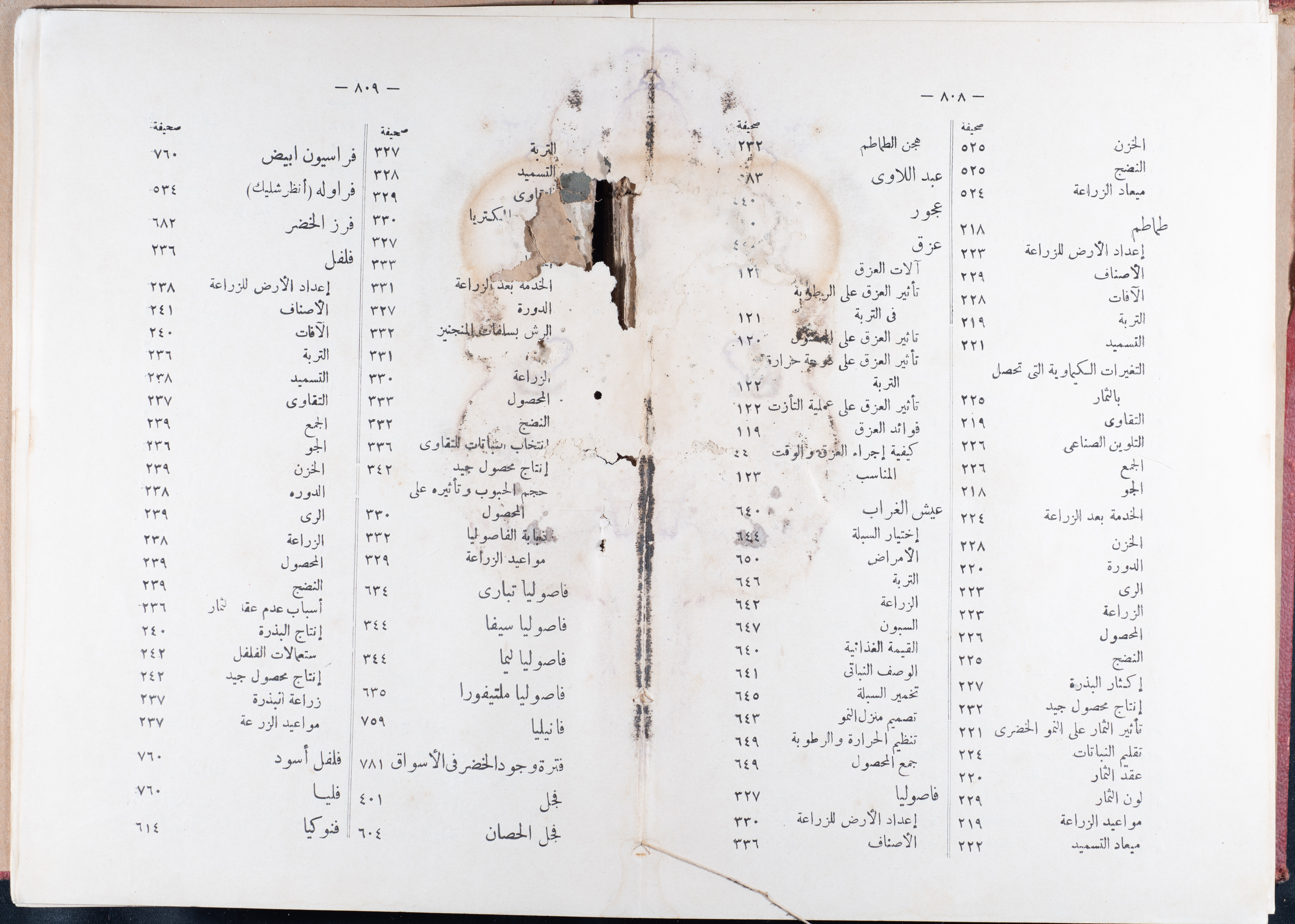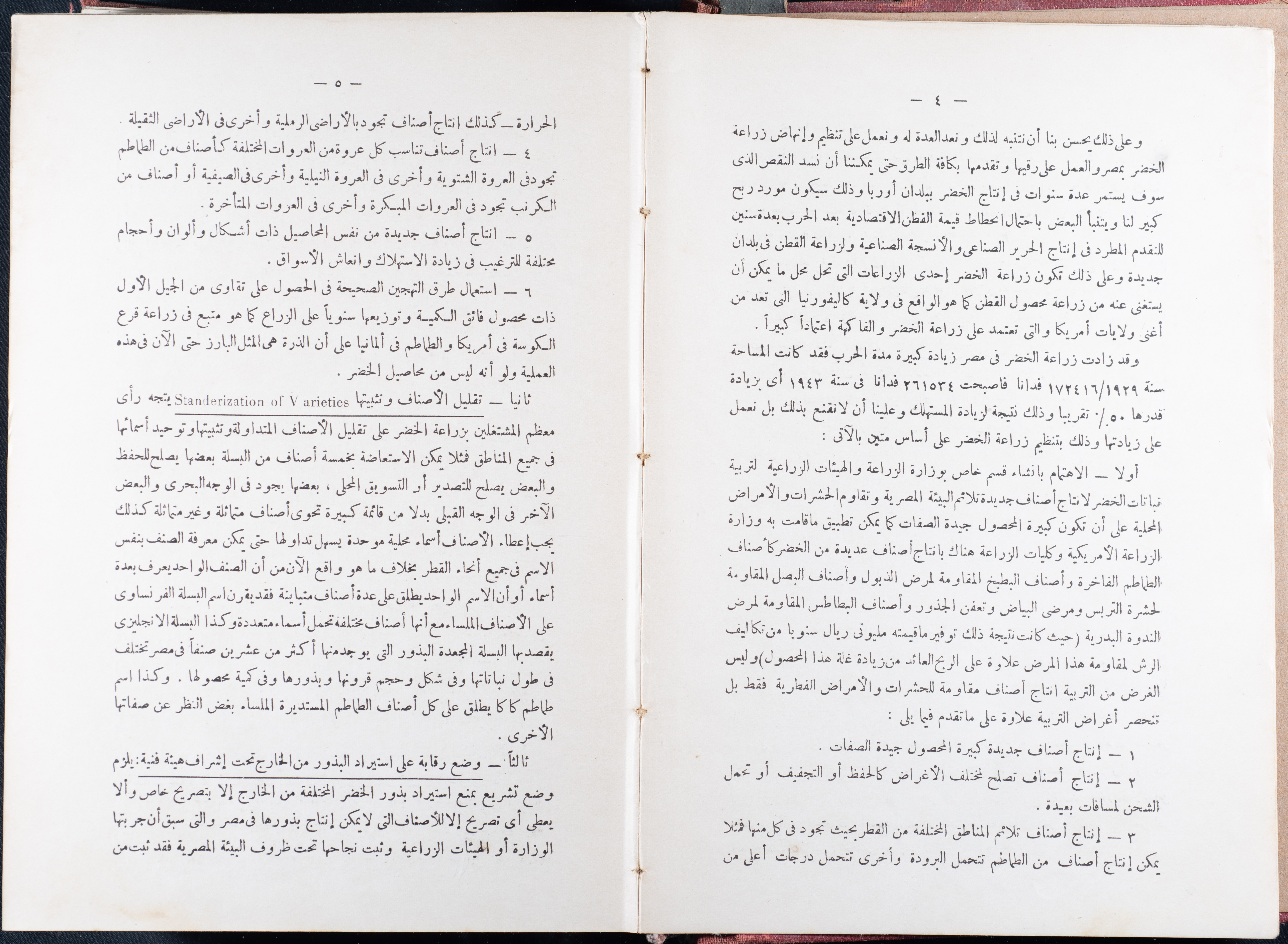 Found in the Wajeh Abdel-Baqi Collection and printed in Arabic, this 27-paged document shows the index of the book "Planting Greens" by Kamal Ramzi Istino, the fourth issue was issued by the Egyptian Angelo Library in Cairo in 1951.