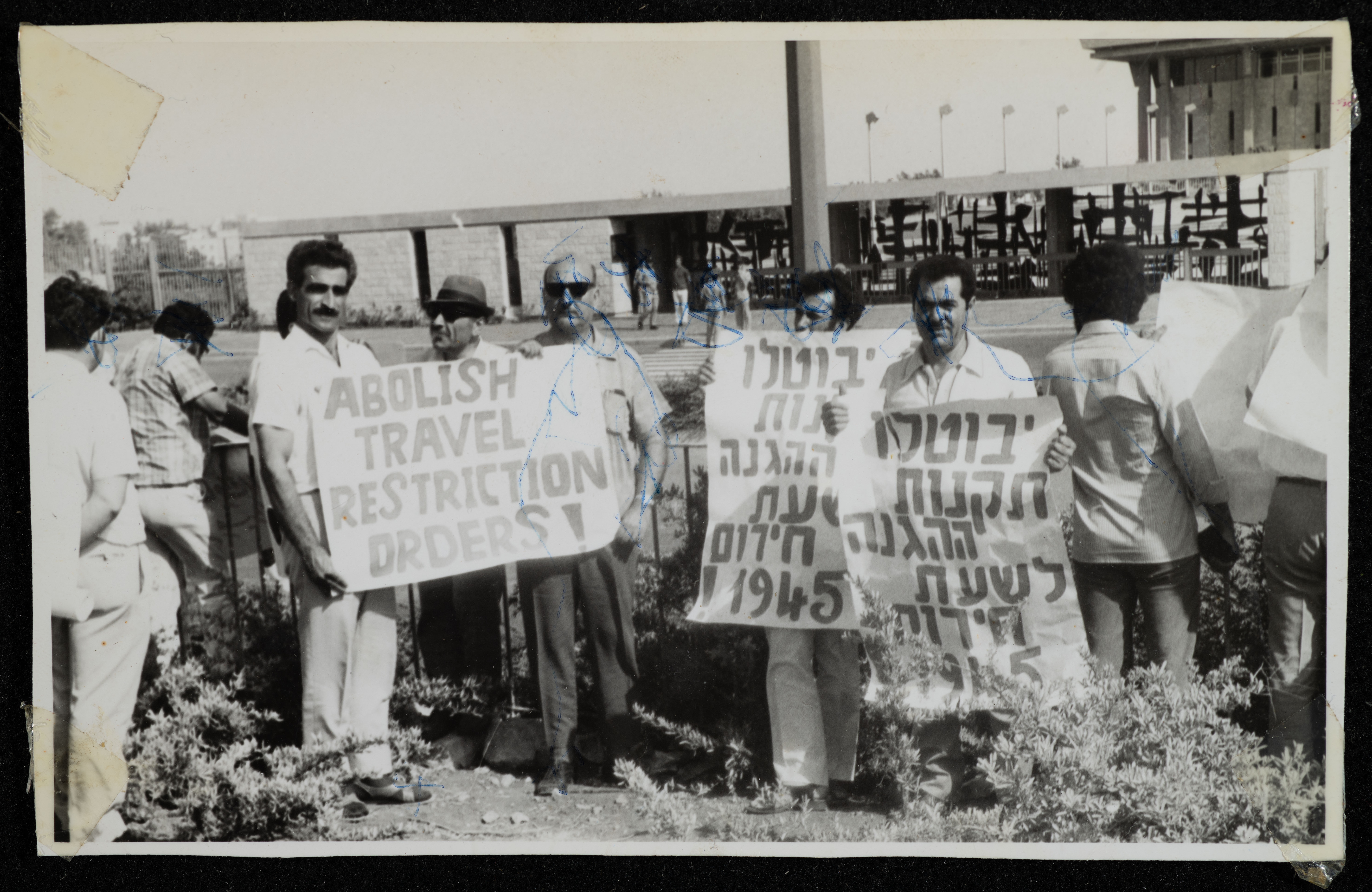 Taken during a demonstration in the settlement of Tel Aviv, this photograph shows Hanna Ibrahim with a group of people holding signs against the high costs of living written in English and Hebrew.