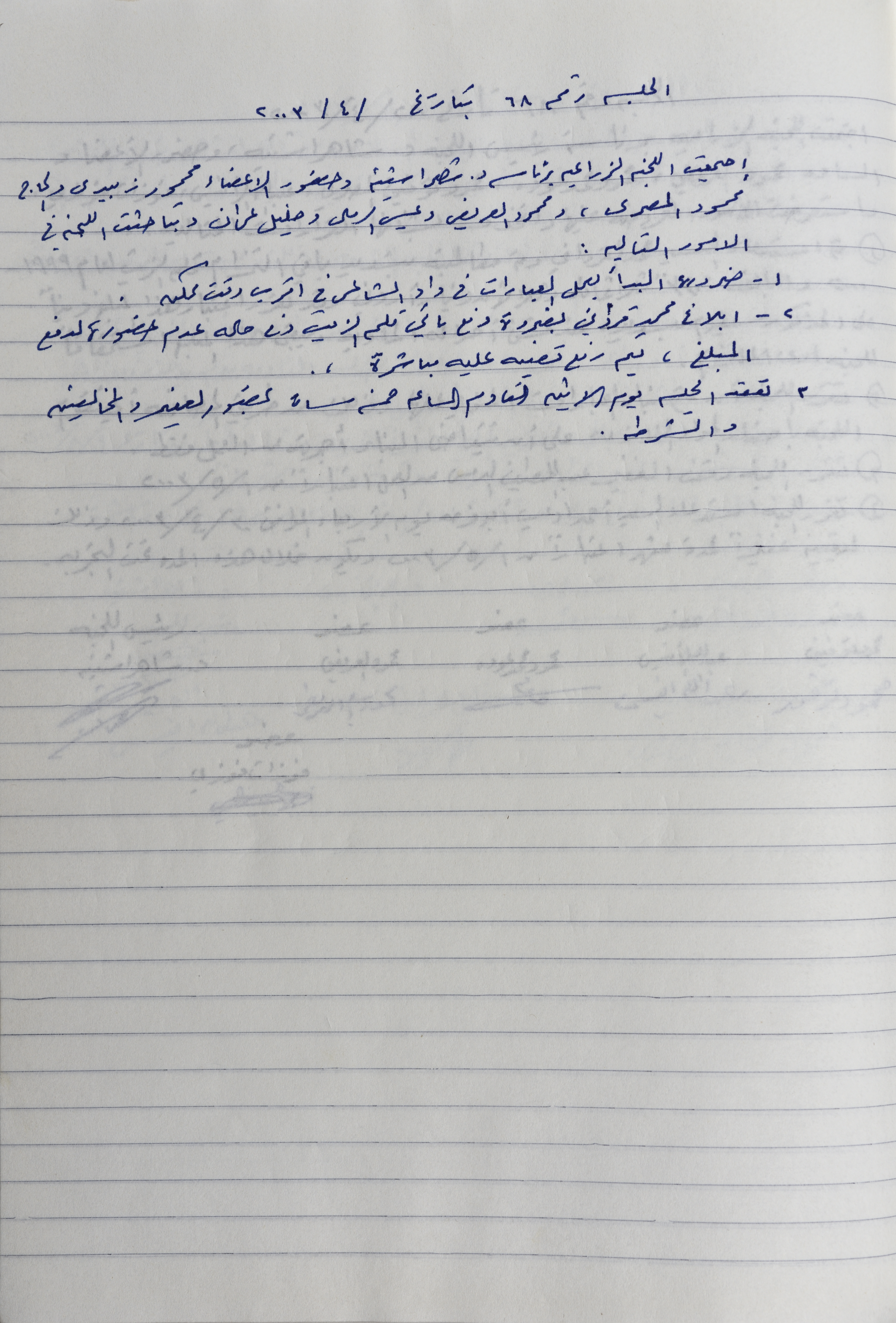 The minutes of session No. 68 of the Agricultural Committee-Salfit, held in April. The meeting stresses the necessity of opening drainage tunnels in Wadi ash-Shaʿer region. The committee also decides to call the oil tax registry guarantee for 2003 and to hold a meeting on Monday with the guardians, violators and police.