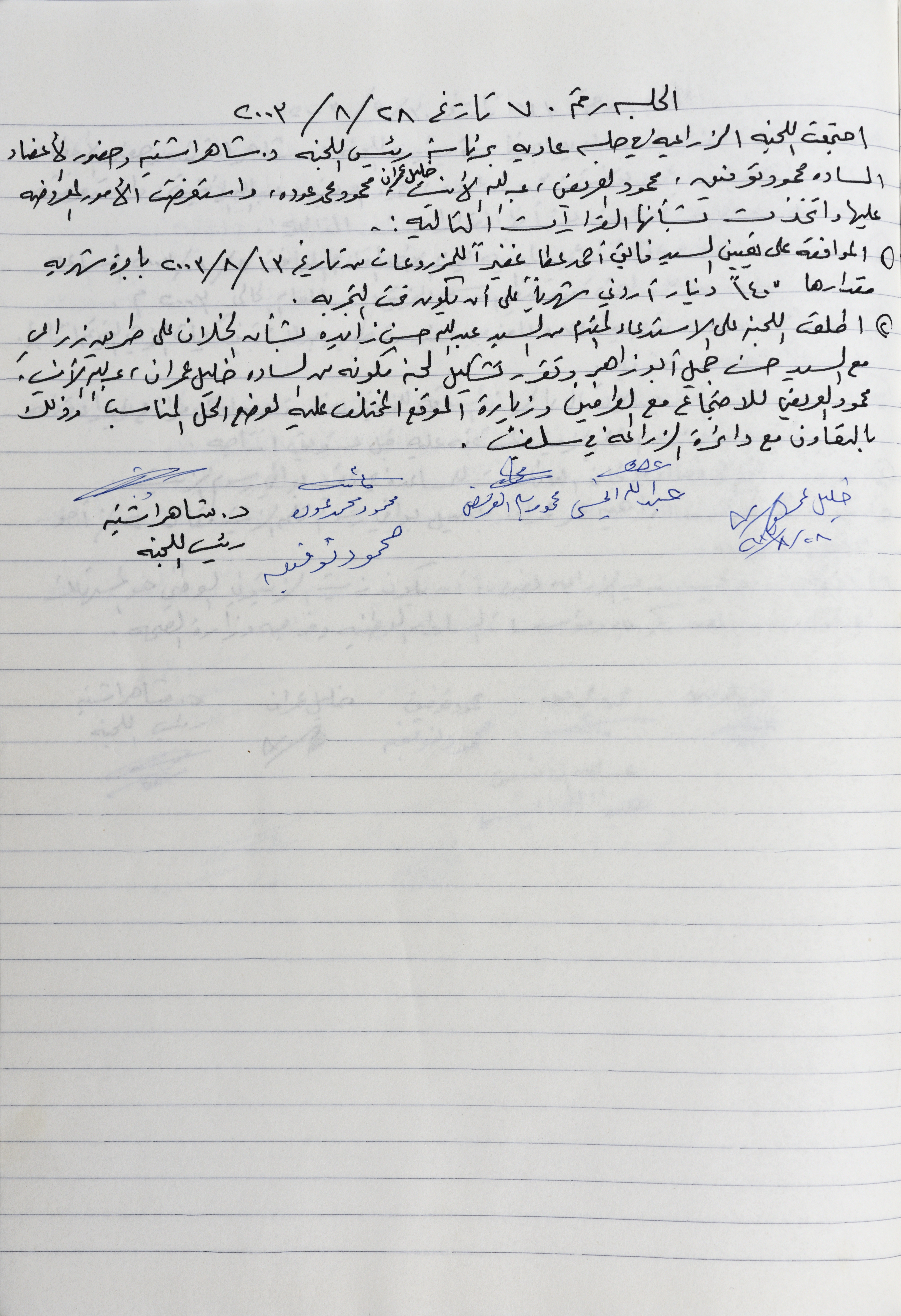 The minutes of session No. 70 of the Agricultural Committee-Salfit, held on 28 Aug 2003_x000D_ The committee decides to appoint Fayeq al-ʿata as guardian to the lands and plantations. They also listen to Hasan abu-Zuhdy in order to resolve the territorial dispute between him and abdul-lah Zayde and decide to form a committee and visit the land and properly resolve the issue.