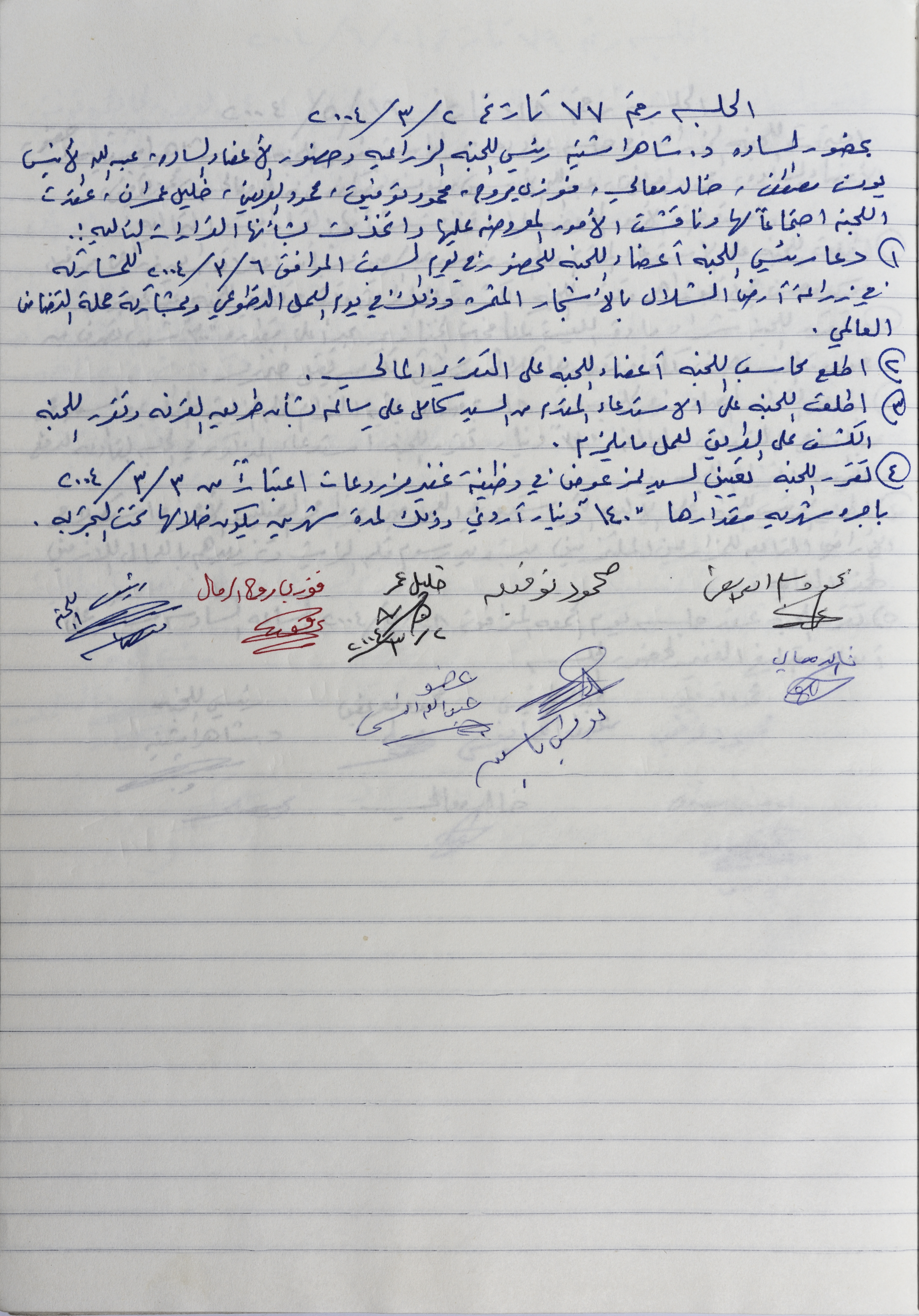 The minutes of session No. 77 of the Agricultural Committee-Salfit, held on 2 Mar 2004_x000D_ The committee decides to participate in planting the Ash-Shallal land with fruitful trees to protect it. The committee discusses the financial report with the committee's accountant. They also discuss the dispute on the al-Qurna road and they decide to open it. Lastly, the committee appoints a new guardian to guard the lands and plantations._x000D_