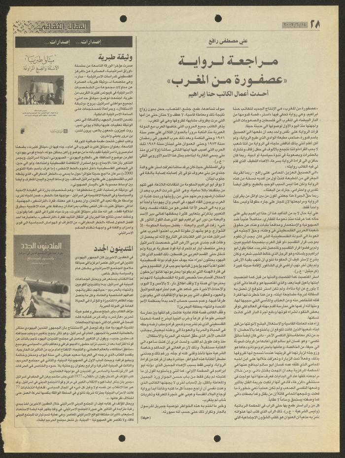 Issued on 14 June 2002, this newspaper clipping includes an article by Ali Rafe' titled "A Review for the Novel (A Bird from Morrocco)", the newest work of author Hanna Ibrahim.