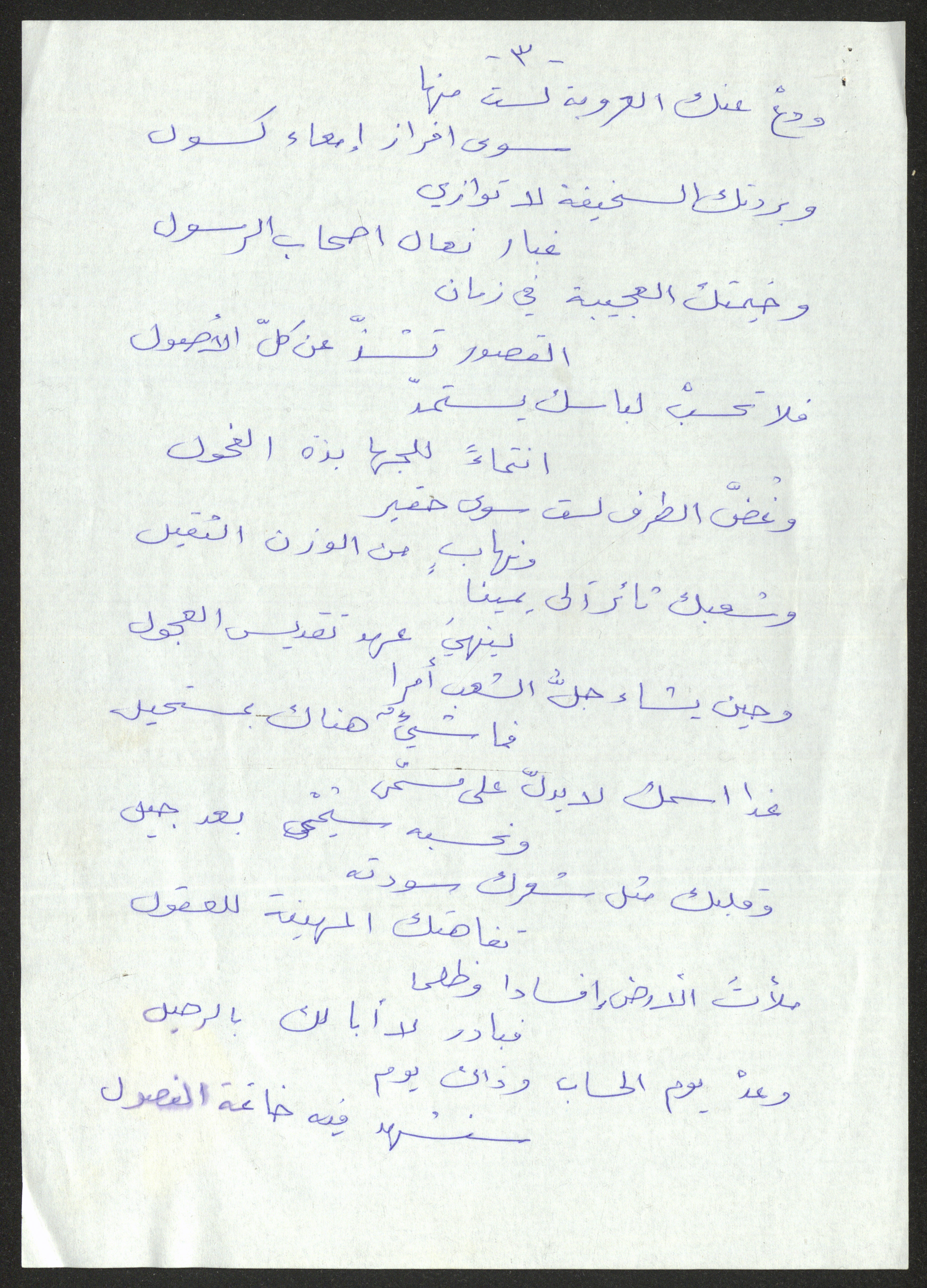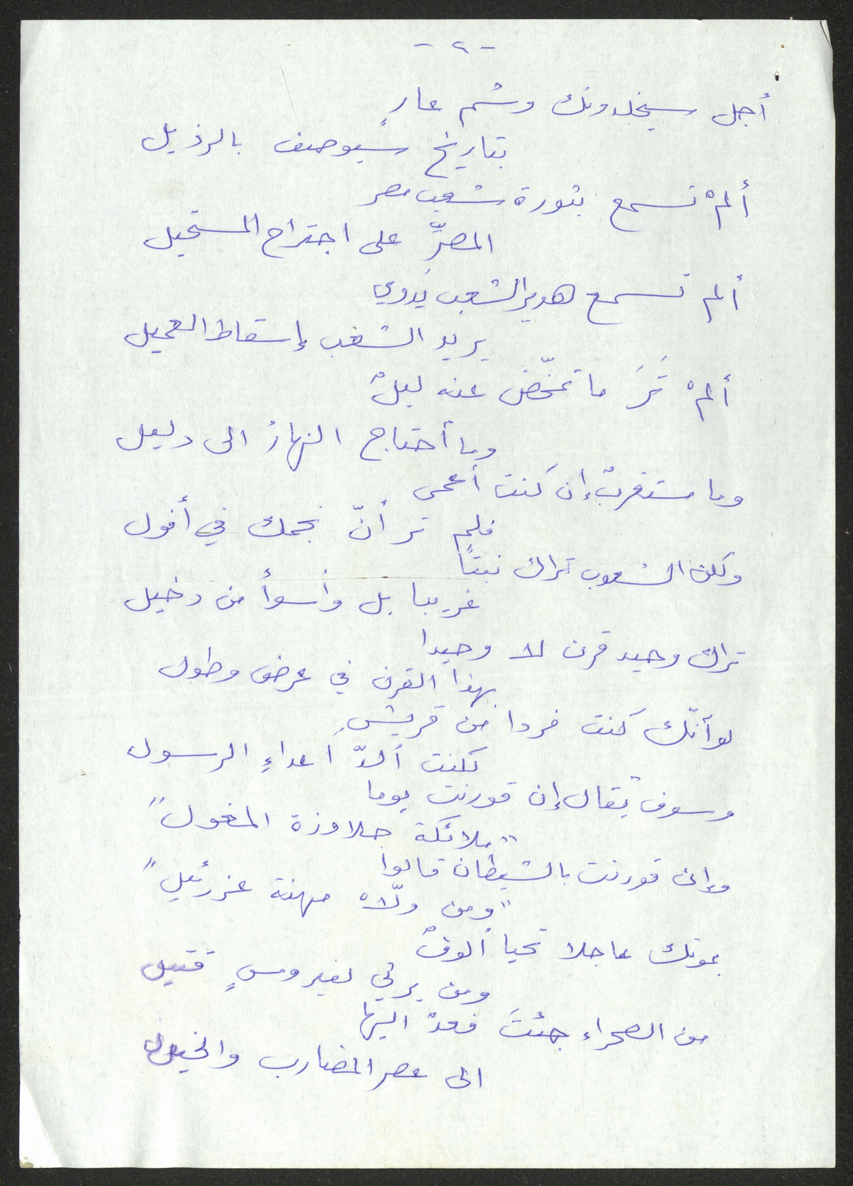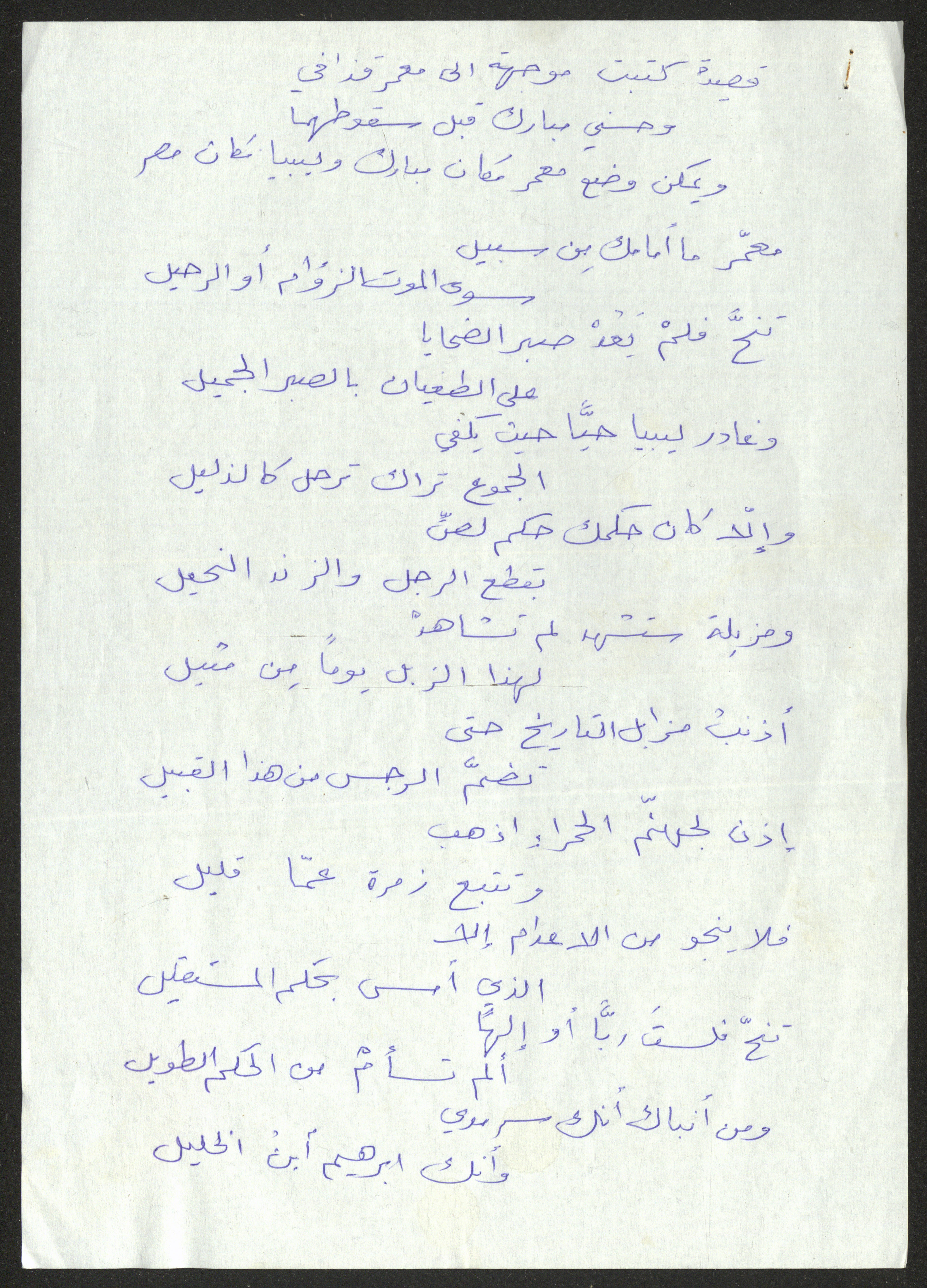 توثق هذه المادة المكتوبة بخط اليد قصيدة لحنا إبراهيم كتبها إلى معمر قذافي.