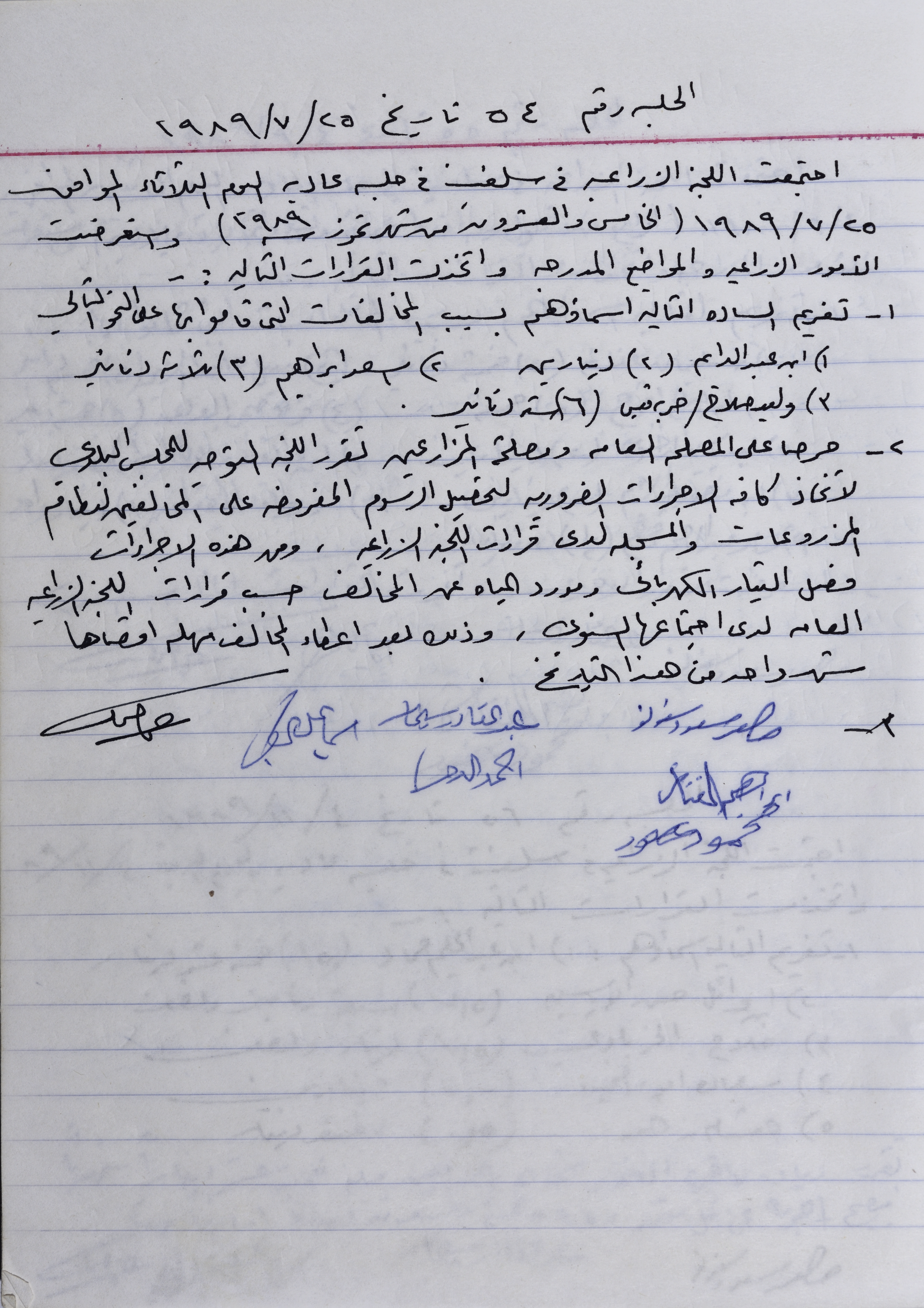 The minutes of session No. 53 of the Agricultural Committee-Salfit, held on 23 May 1989_x000D_ the Committee decide to fine nine people for violating the instruction of the Committee and grazing livestock in agricultural lands.