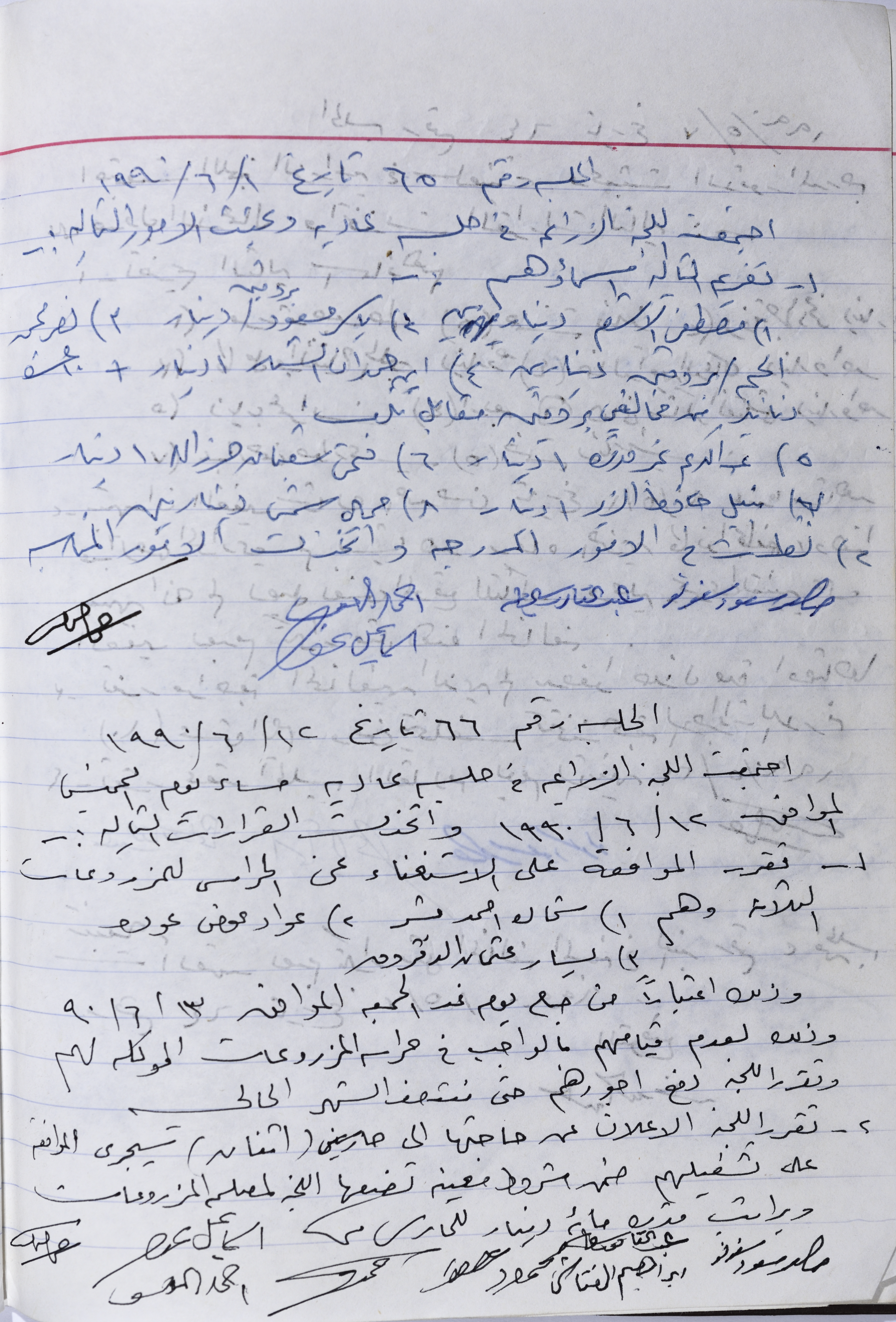 Document containing the minutes of the meetings of the Agricultural Committee in Salfit No. 65 and 66, where the Committee held the 65th session on 1/6/1990 and the 66th meeting on 12/6/1990_x000D_ At the 65th session, the Committee decided that eight persons would be fined for violations of the instructions of the Agricultural Committee in Salfit. At the 66th session, the Committee decided to dissmis three guardians and pay their full wages. The Committee also decided to declare about its need for 2 more guardians to guard the cultivated land in accordance with conditions laid down by the Committee for Plant Protection ._x000D_