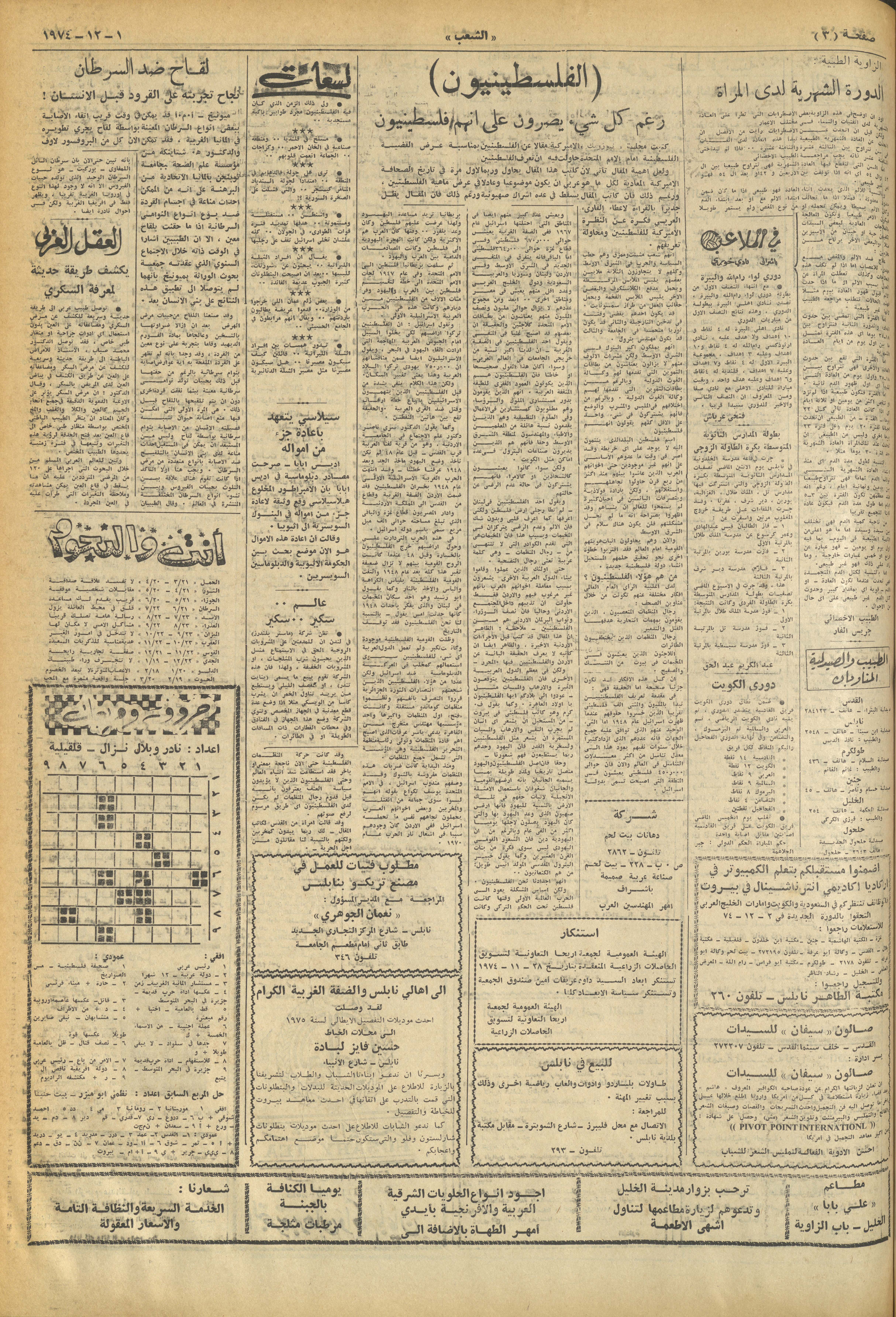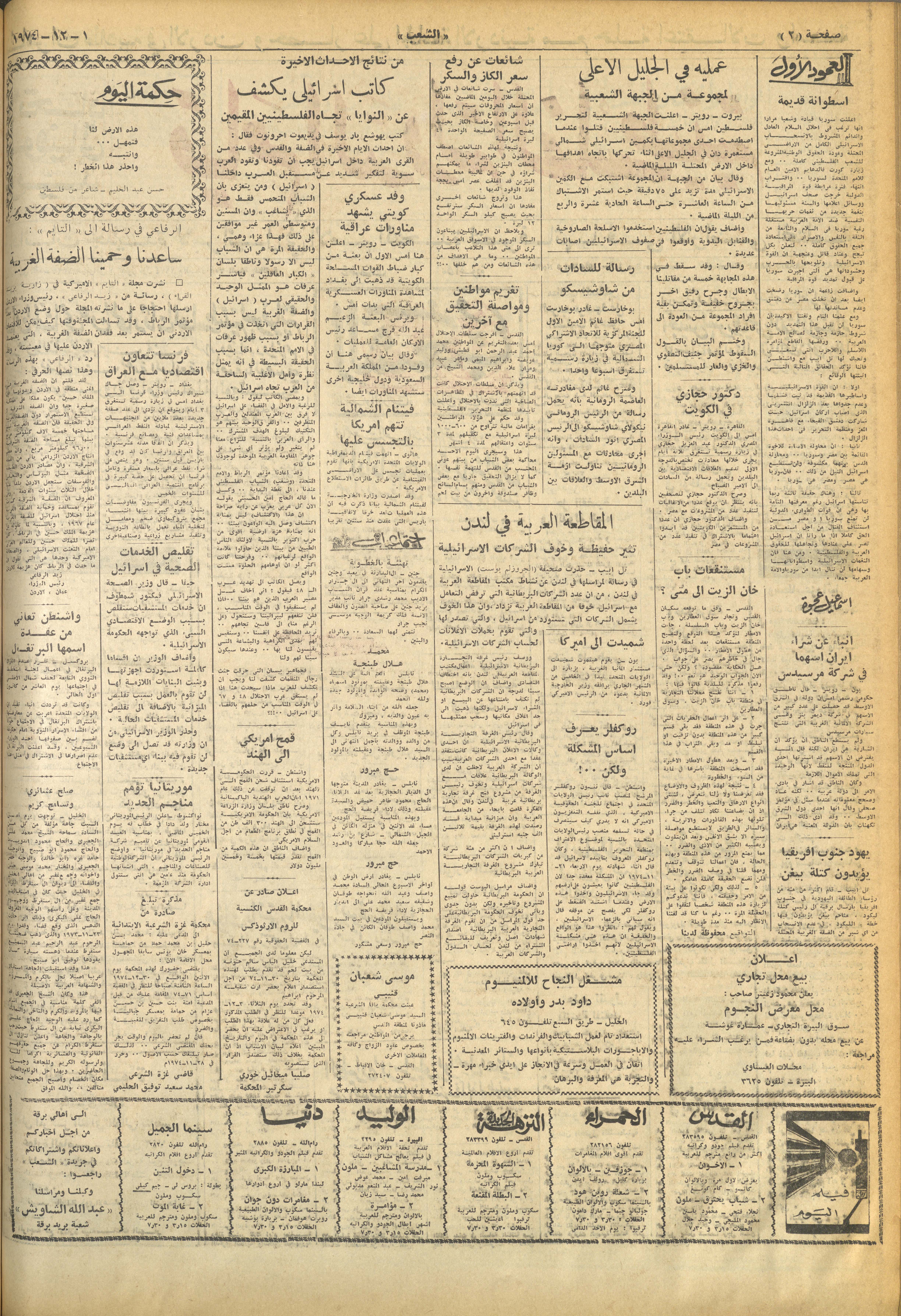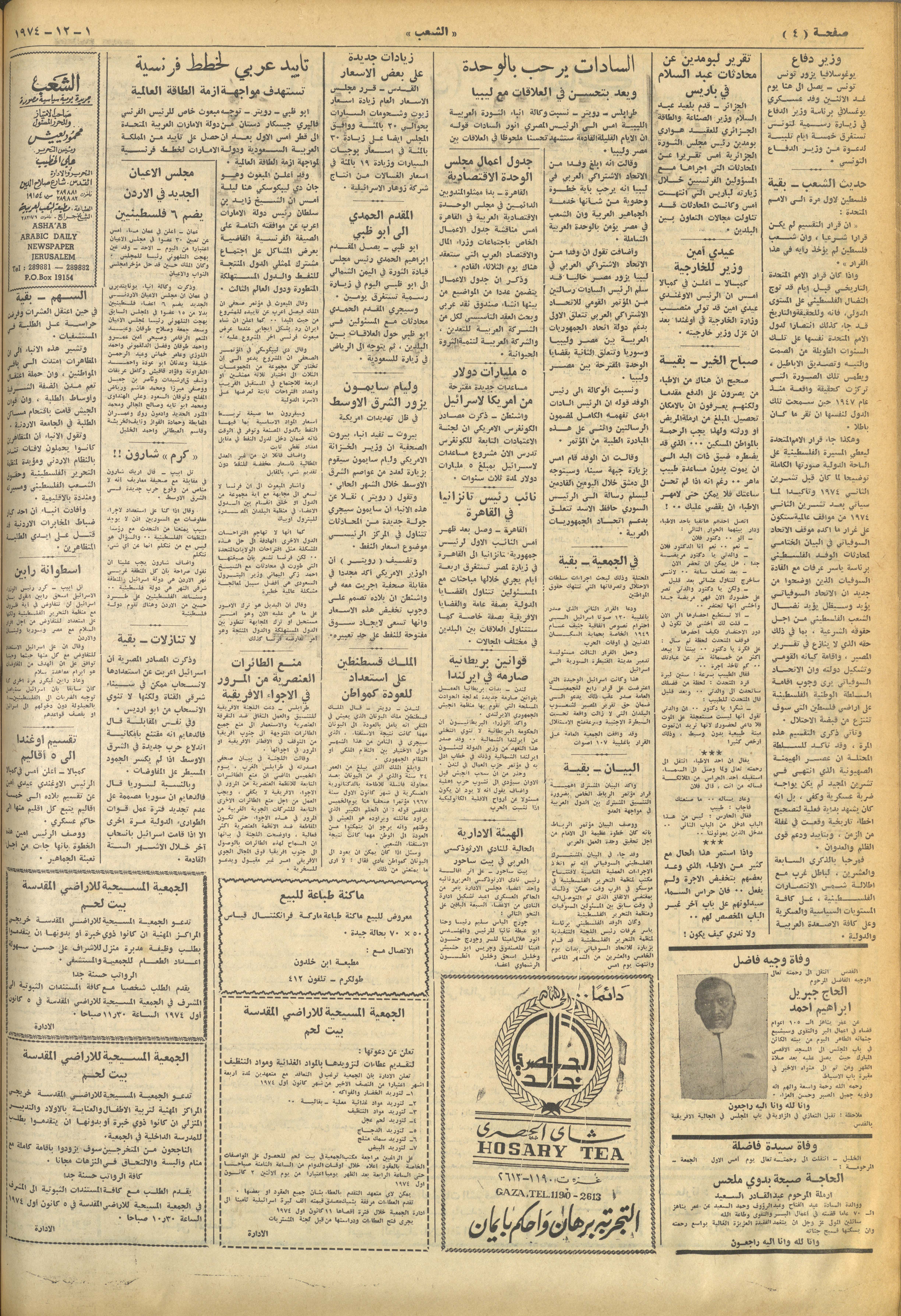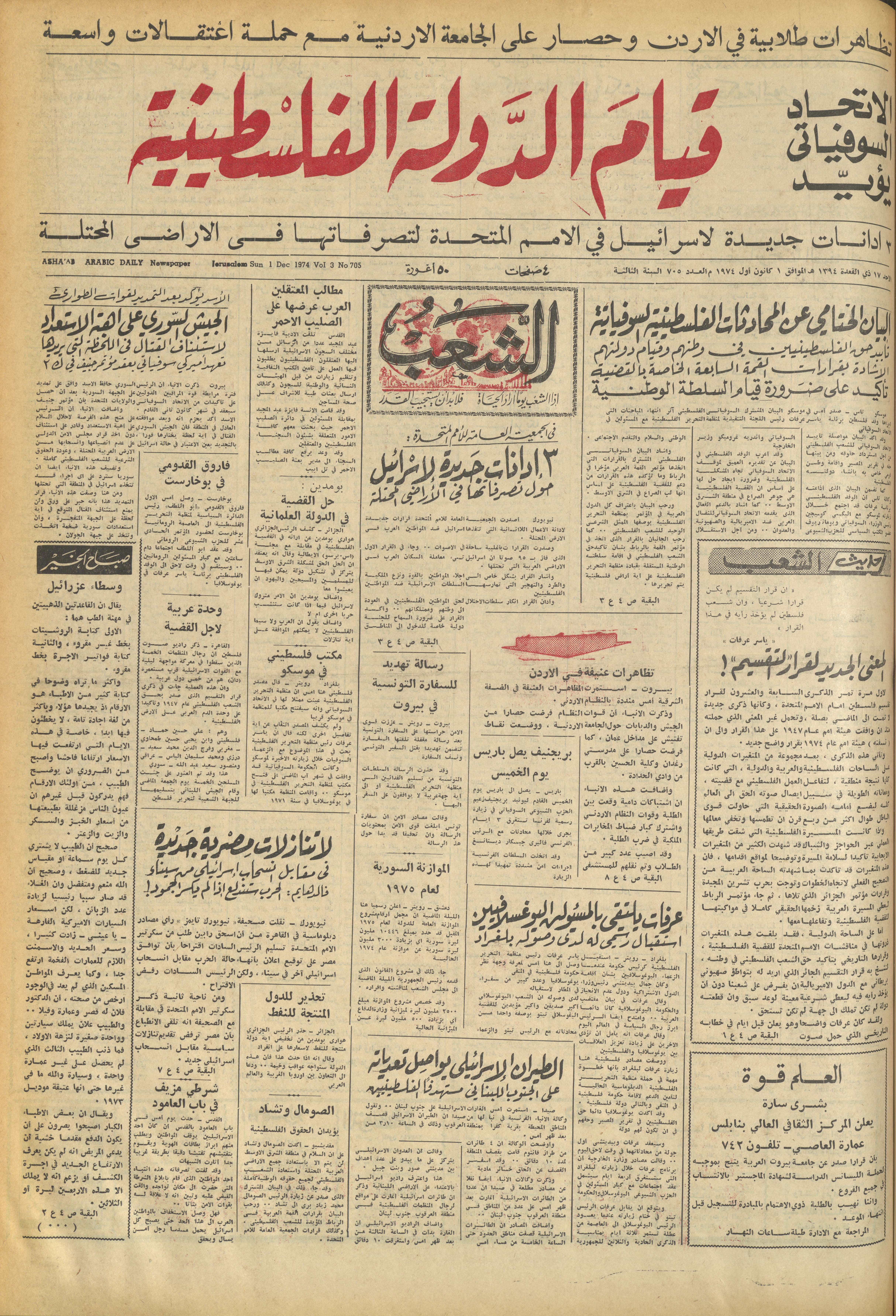 Printed in Arabic, this includes issue number 705 of Asha'b Newspaper issued on 1 December 1974, which is a 4-paged daily, political and illustrated newspaper. The issue cost 50 agoras and included a collection of statements, announcements, advertisements and political and sports news including: - Final statement on the Palestinian-Soviet talks. - 3 new condemnations of Israel in the General Assembly of the United Nations (UN) about its actions in the occupied territories. - Hafez al-Assad confirms after the extension of the emergency forces that the Syrian army is ready to resume fighting at the moment it wants. - No new Egyptian concessions in exchange for Israel's withdrawal from Sinai. - The Israeli air force continues its attacks on southern Lebanon, targeting Palestinians. - An operation in the Upper Galilee of a group of the Popular Front for the Liberation of Palestine (PFLP). - Quoting from the Israeli newspaper, Yedioth Ahronoth, an Israeli writer reveals intentions towards the Palestinians inside the 1948 Palestinian Occupied Territories. - The Arab boycott in London raises the ire and fear of Israeli companies. - “The Palestinians, Despite Everything, Insist that they are Palestinians,” an article from the American newspaper, Newsweek.