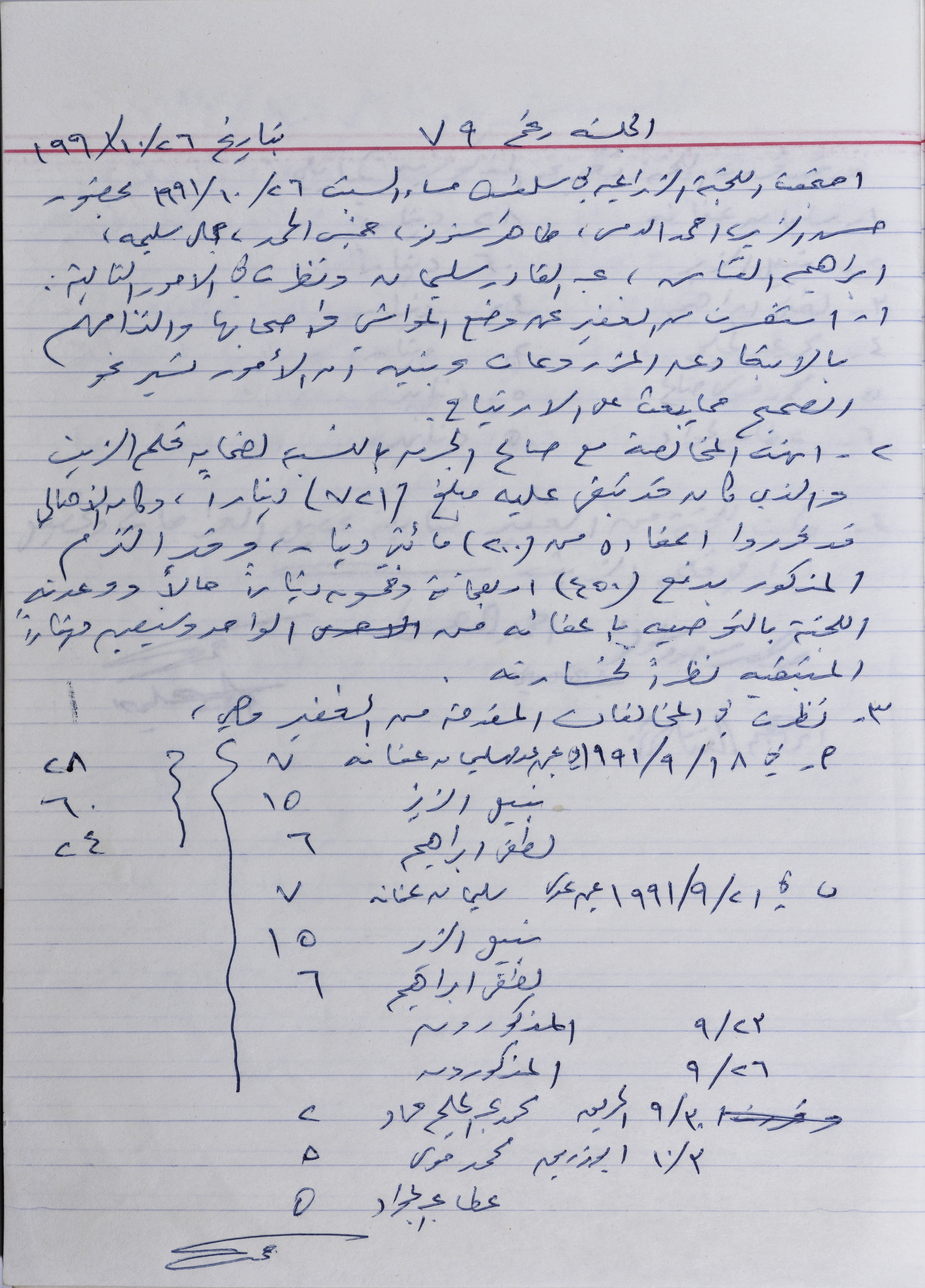 The minutes of the session No. 79 of the Agricultural Committee in Salfit, held on 26 Oct 1991_x000D_ During this session, the Committee address grazing livestock in the agricultural land, and the guard provided a positive report about this matter, a conflict between the Committee and one of the previous oil tax collector was resolved by exempting him of the remaining money, lastly, the Committee look into the new irregularities provided by the guardian.